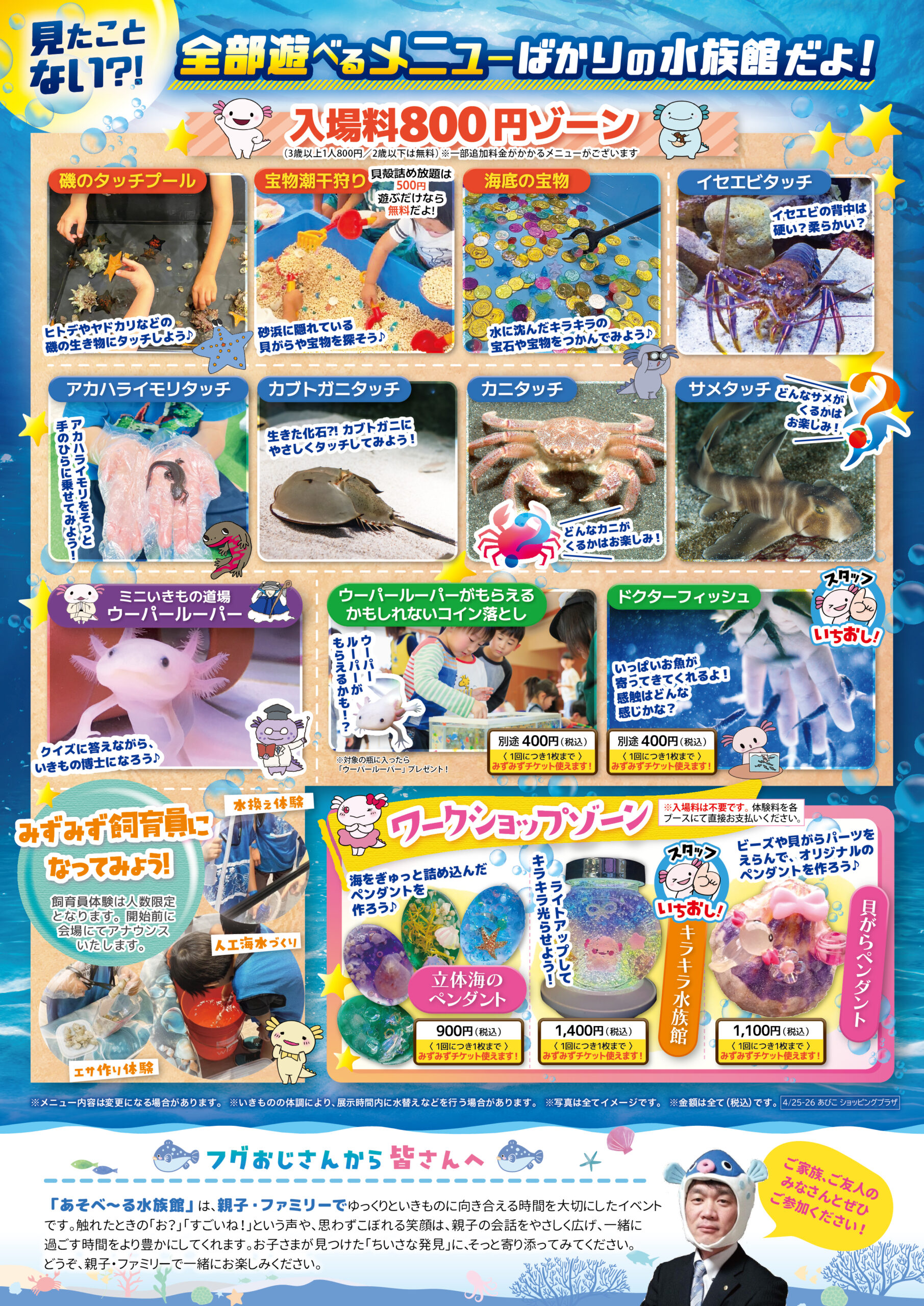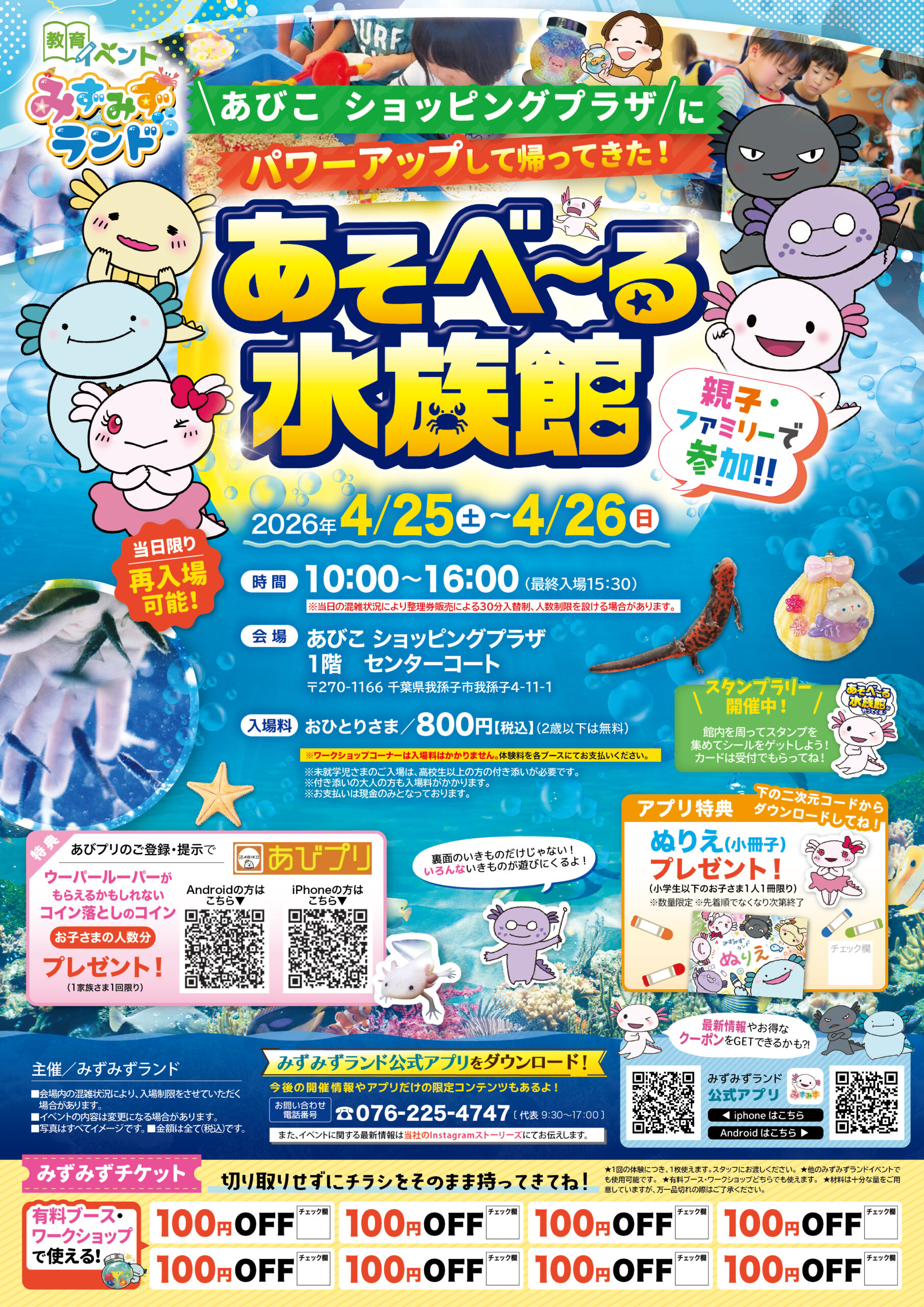 あびこ ショッピングプラザ 千葉県 2026.04.10 日時2026年4月25日〜26日 10:00~16:00(最終入場15:30) 定員予約不要 入場料:お一人様800円(2歳以下は無料) ※お支払いは現金のみ ※未就学児様のご入場は、高校生以上の付き添いが必要です ※付き添いの大人の方も入場料がかかります ※ワークショップコーナーは入場料不要 イベント種別大あそべ~る水族館 メニュー お問い合わせはこちら