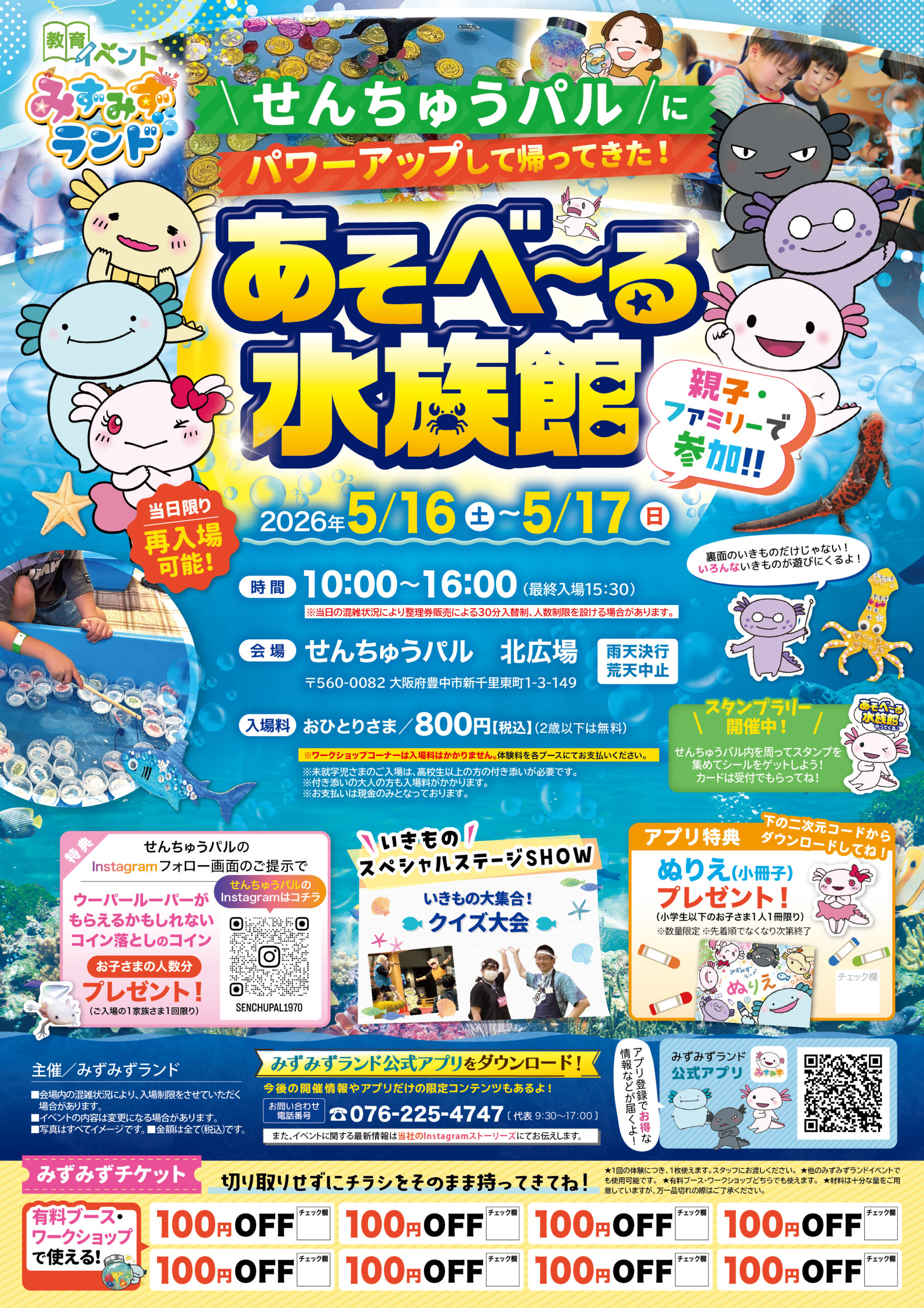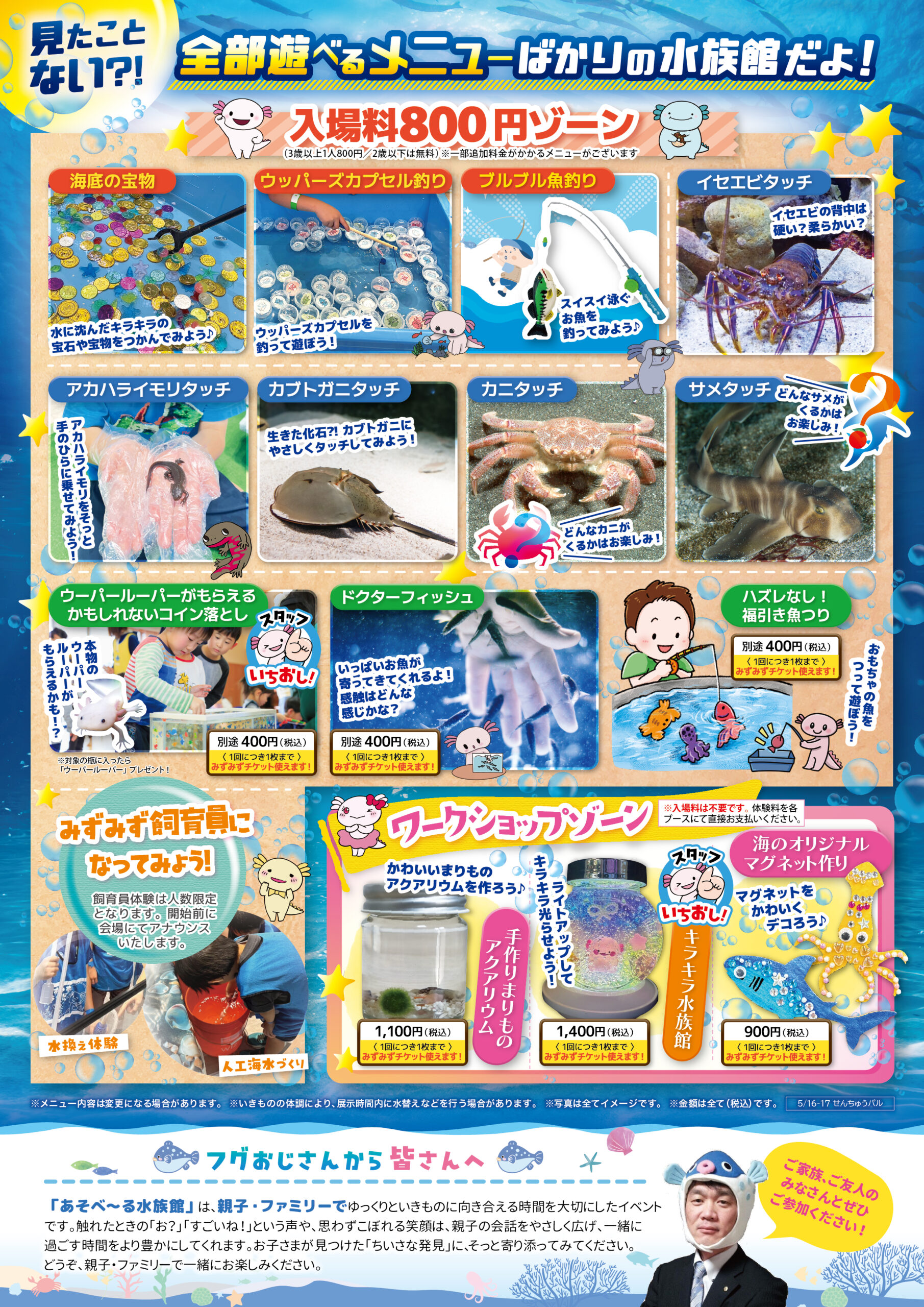 せんちゅうパル 大阪府 2026.04.25 日時2026年5月16日〜17日 10:00~16:00(最終入場15:30) 【雨天決行/荒天中止】 定員予約不要 入場料:お一人様800円(2歳以下は無料) ※お支払いは現金のみ ※未就学児様のご入場は、高校生以上の付き添いが必要です ※付き添いの大人の方も入場料がかかります ※ワークショップコーナーは入場料不要 イベント種別大あそべ~る水族館 メニュー お問い合わせはこちら