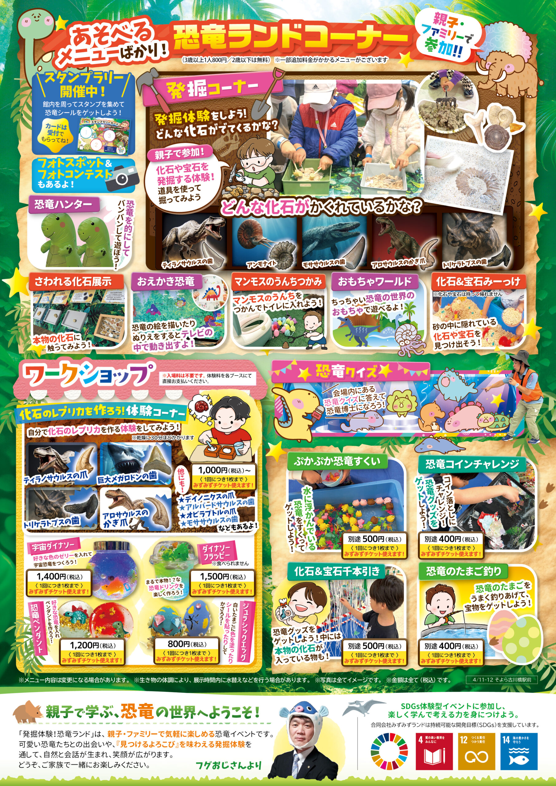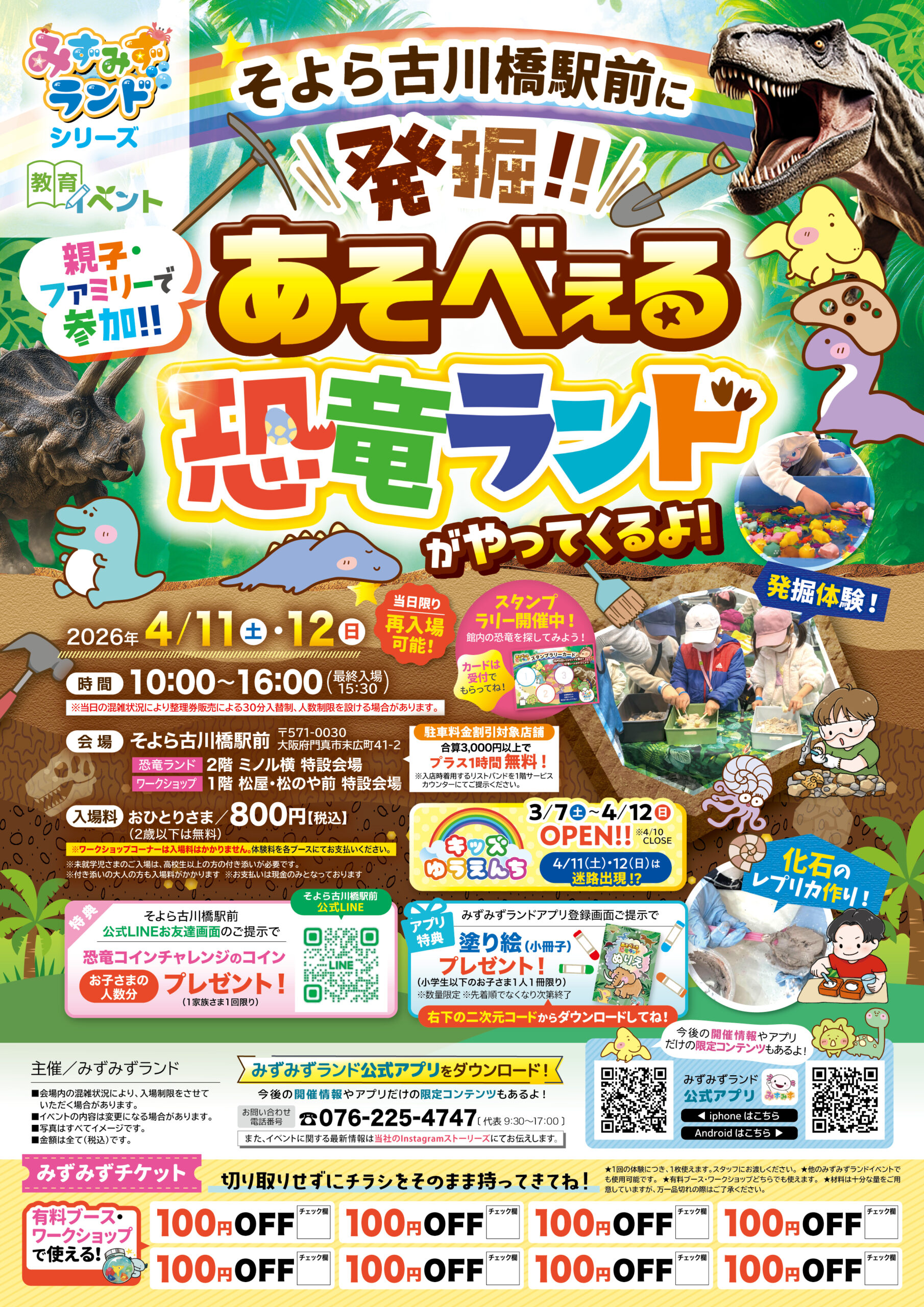 そよら古川橋駅前 大阪府 2026.03.27 日時2026年4月11日〜12日 10:00~16:00(最終入場15:30) 定員予約不要 入場料:お一人様800円(2歳以下は無料) ※お支払いは現金のみ ※未就学児様のご入場は、高校生以上の付き添いが必要です ※付き添いの大人の方も入場料がかかります ※ワークショップコーナーは入場料不要 イベント種別あそべぇる恐竜ランド メニュー お問い合わせはこちら