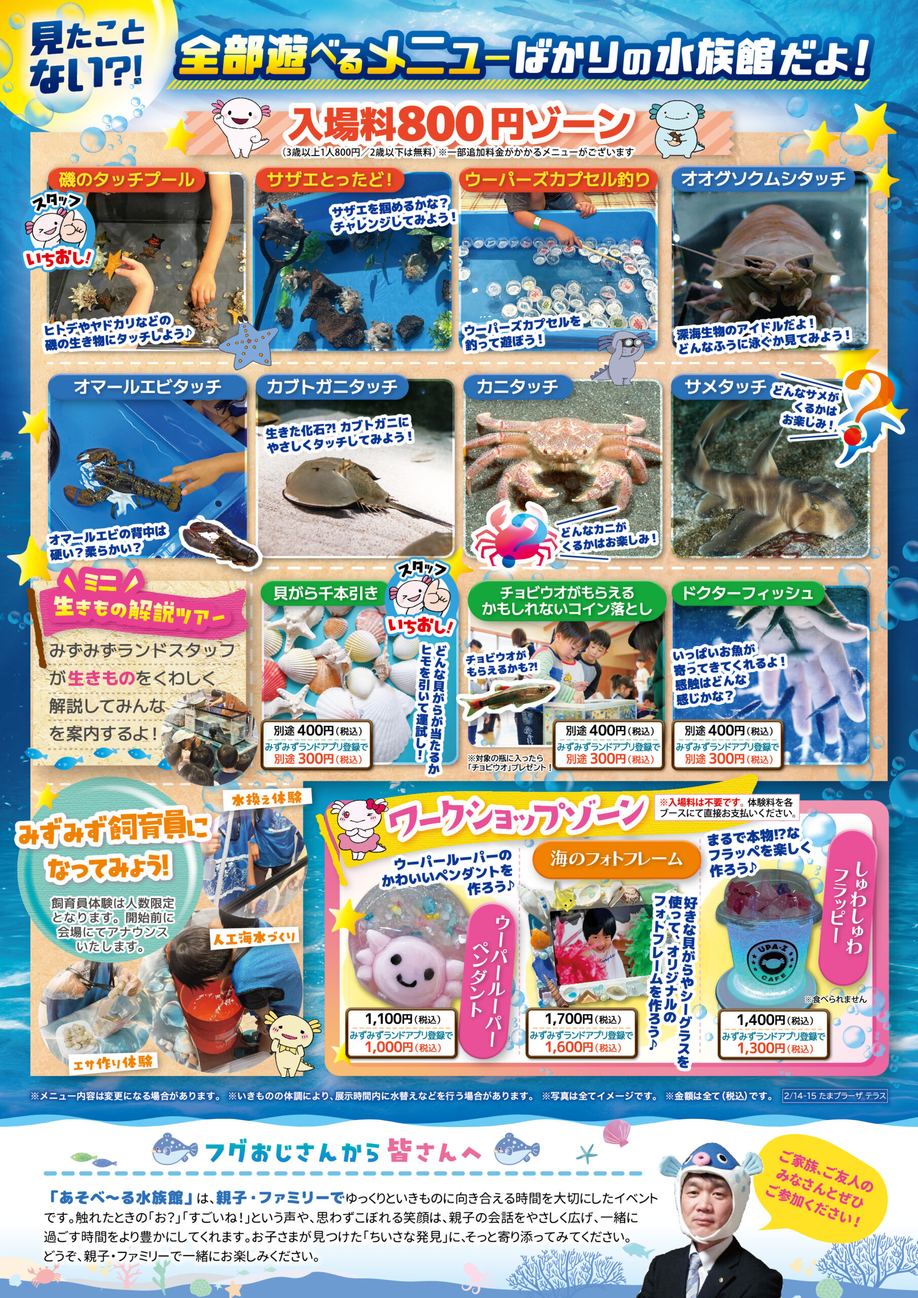 たまプラーザ テラス 神奈川県 2026.01.14 日時2026年2月14日〜15日 10:00~17:00(最終入場16:30) 定員予約不要 入場料:お一人様800円(2歳以下は無料) ※お支払いは現金のみ ※未就学児様のご入場は、高校生以上の付き添いが必要です ※付き添いの大人の方も入場料がかかります ※ワークショップコーナーは入場料不要 イベント種別大あそべ~る水族館 メニュー お問い合わせはこちら