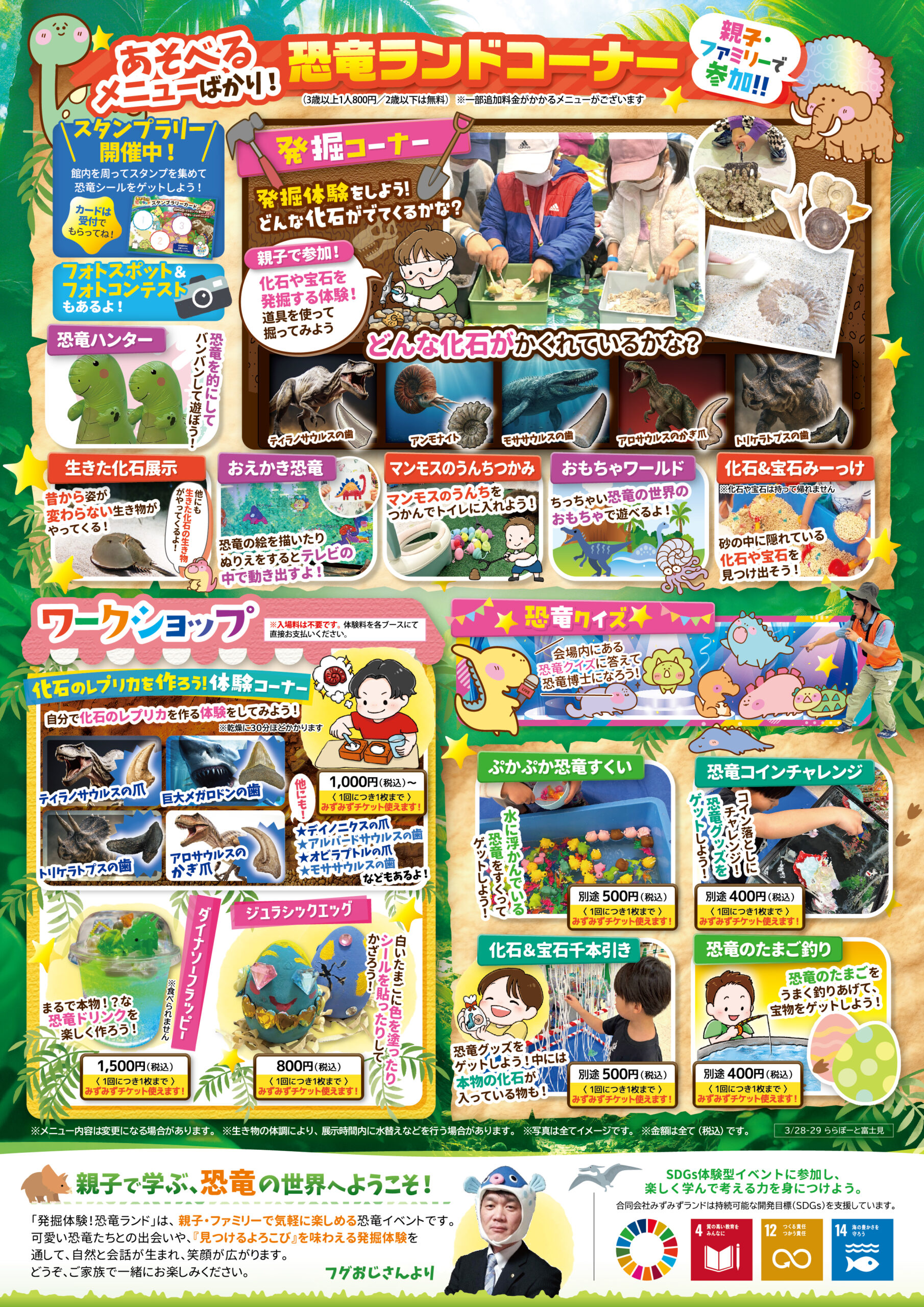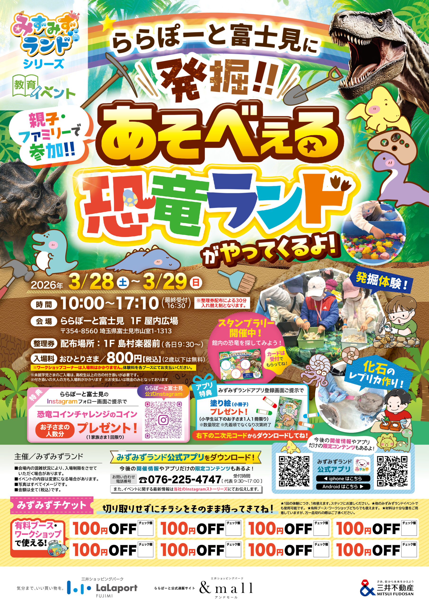 ららぽーと富士見 埼玉県 2026.03.01 日時2026年3月28日〜29日 10:00~17:10(最終入場16:30) 定員予約不要 入場料:お一人様800円(2歳以下は無料) ※お支払いは現金のみ ※未就学児様のご入場は、高校生以上の付き添いが必要です ※付き添いの大人の方も入場料がかかります ※ワークショップコーナーは入場料不要 イベント種別あそべぇる恐竜ランド メニュー お問い合わせはこちら