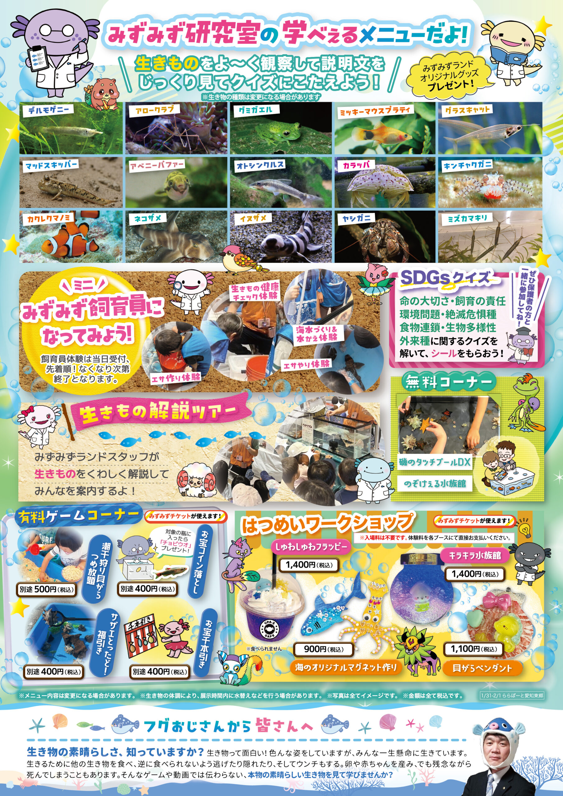 ららぽーと愛知東郷 愛知県 2026.01.06 日時2026年1月31日〜2月1日 10:00~16:00(最終入場15:30) 定員予約不要 入場料:お一人様800円(2歳以下は無料) ※お支払いは現金のみ ※未就学児様のご入場は、高校生以上の付き添いが必要です ※付き添いの大人の方も入場料がかかります ※ワークショップコーナーは入場料不要 イベント種別学べぇる水族館 メニュー お問い合わせはこちら