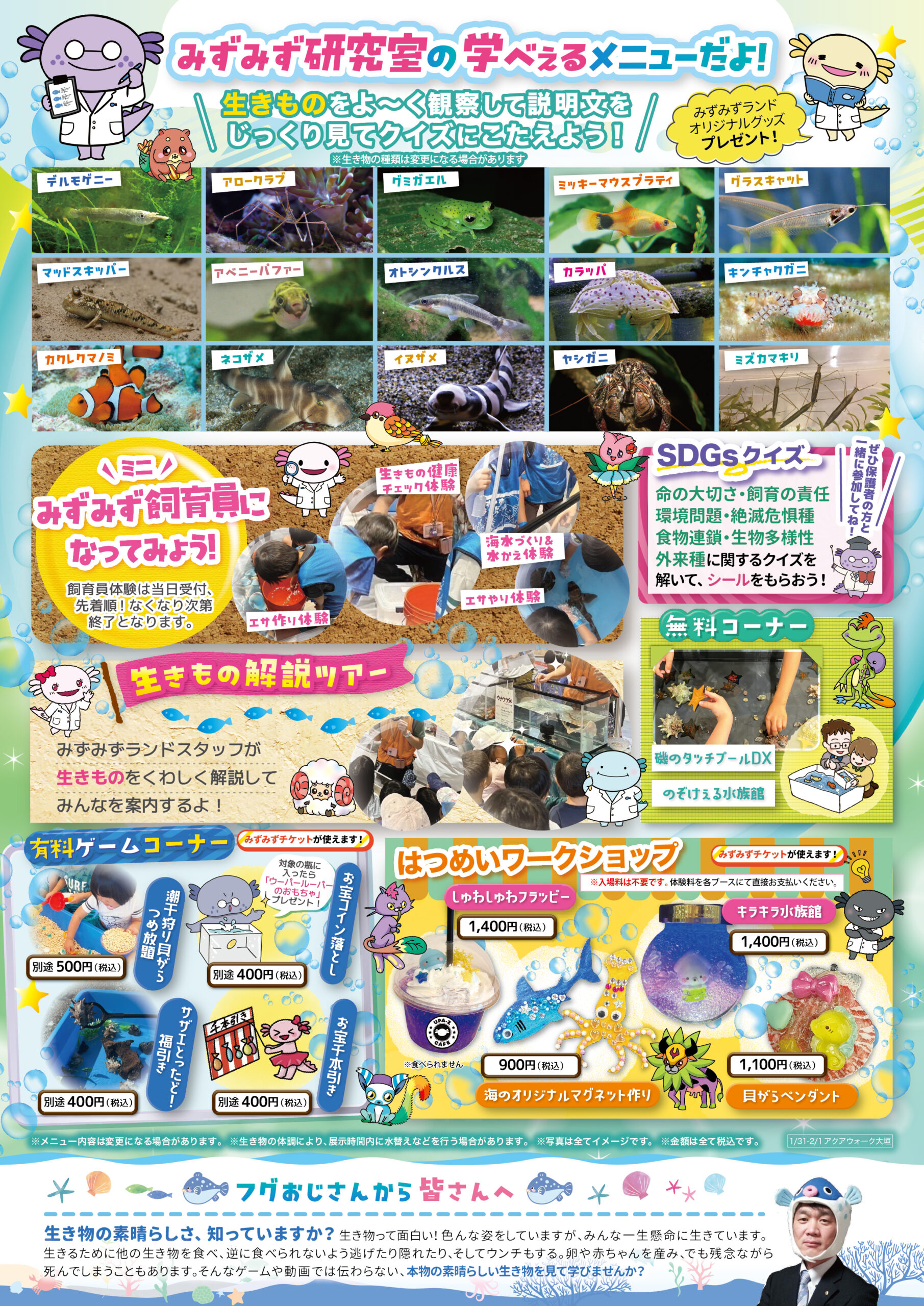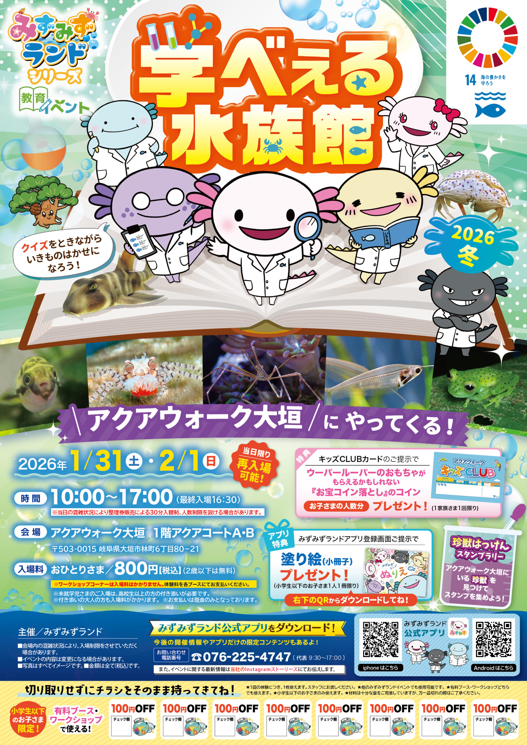 アクアウォーク大垣 岐阜県 2026.01.06 日時2026年1月31日〜2月1日 10:00~17:00(最終入場16:30) 定員予約不要 入場料:お一人様800円(2歳以下は無料) ※お支払いは現金のみ ※未就学児様のご入場は、高校生以上の付き添いが必要です ※付き添いの大人の方も入場料がかかります ※ワークショップコーナーは入場料不要 イベント種別学べぇる水族館 メニュー お問い合わせはこちら