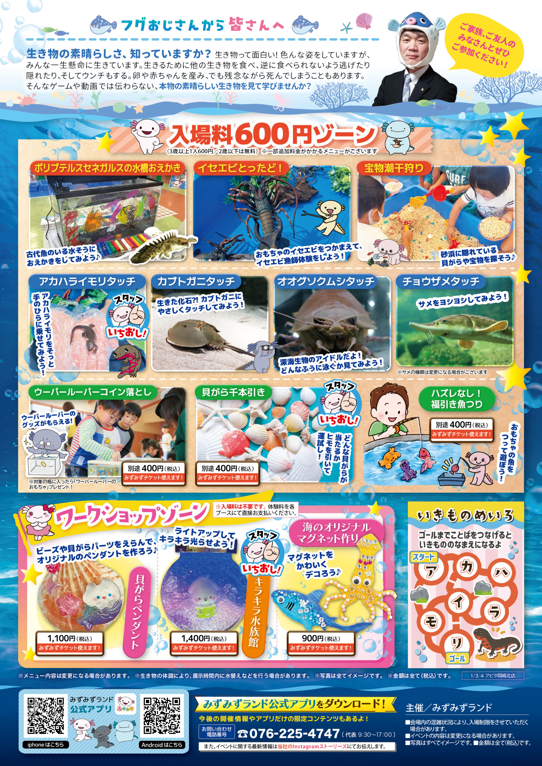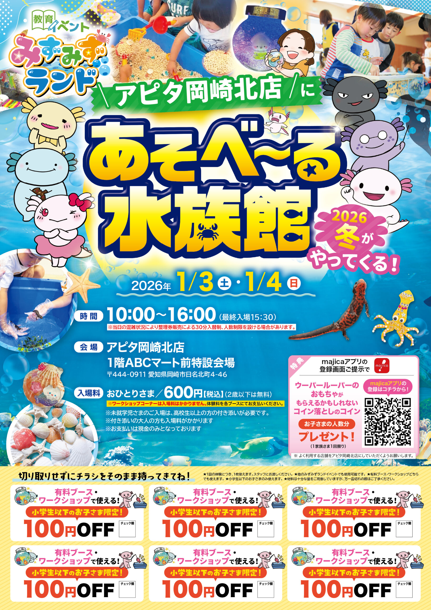 アピタ岡崎北店 愛知県 2025.12.09 日時2026年1月3日〜4日 10:00~16:00(最終入場15:30) 定員予約不要 入場料:お一人様600円(2歳以下は無料) ※未就学児様のご入場は、高校生以上の付き添いが必要です ※付き添いの大人の方も入場料がかかります ※ワークショップコーナーは入場料不要 イベント種別大あそべ~る水族館 メニュー お問い合わせはこちら