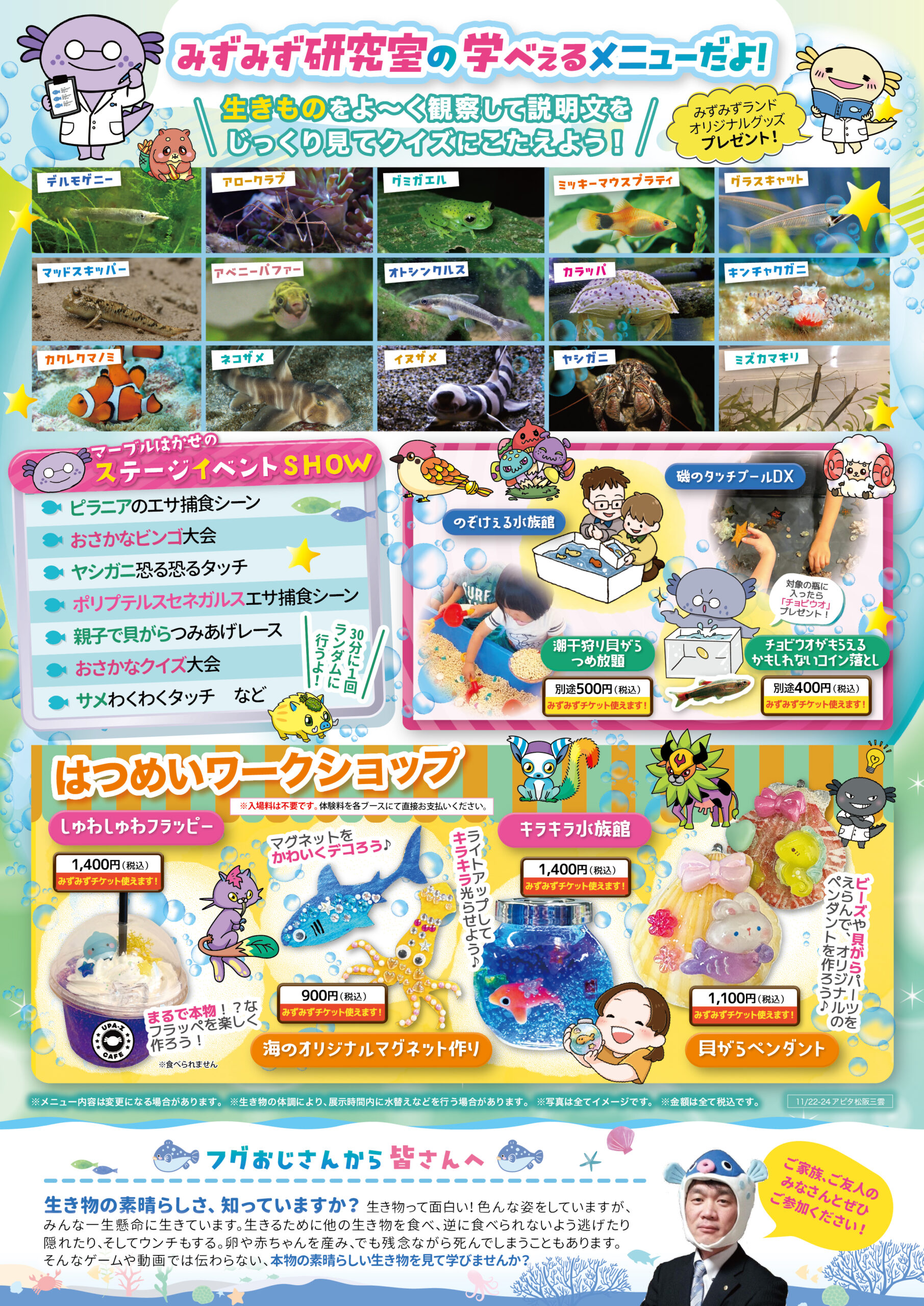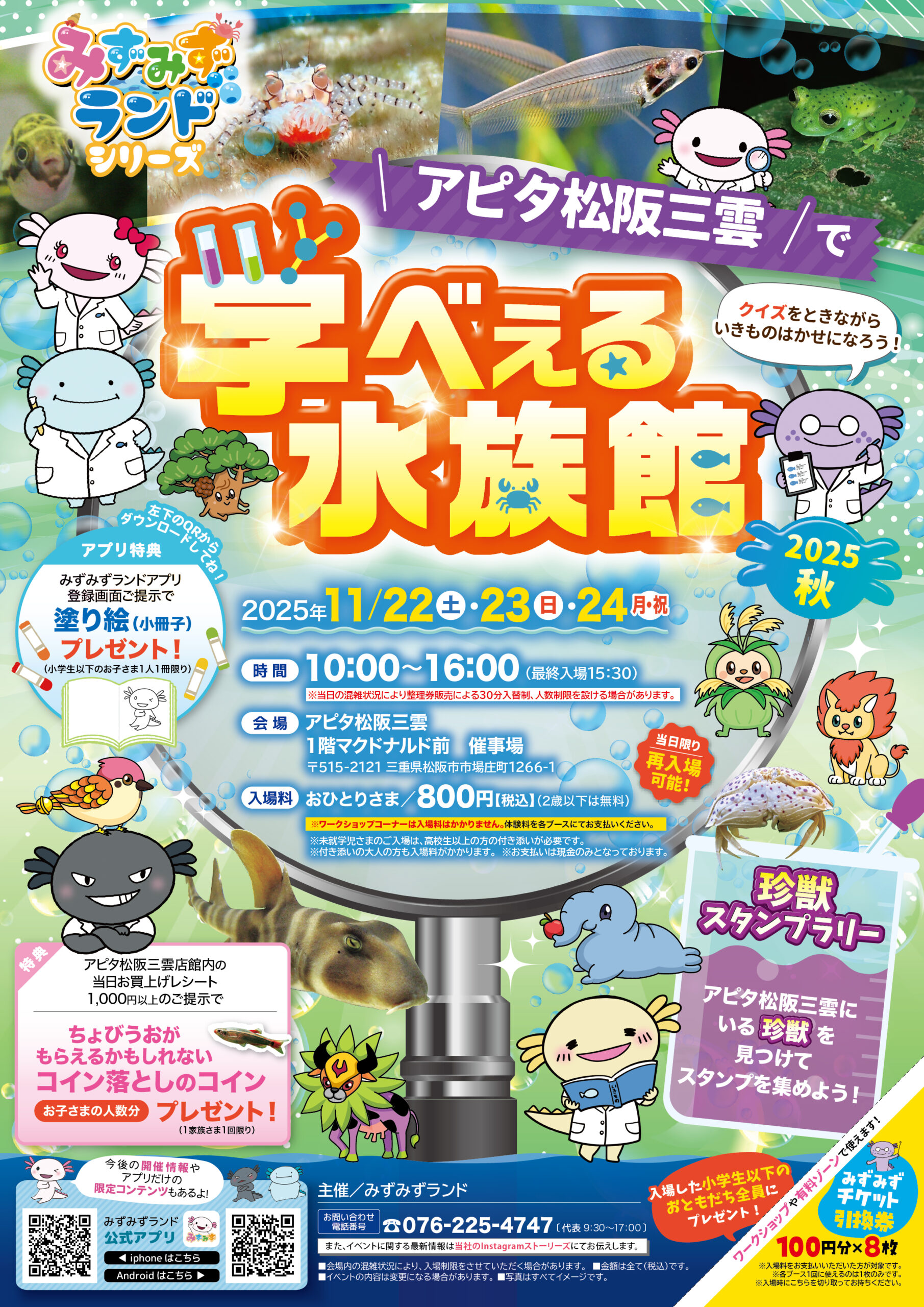 アピタ松阪三雲 三重県 2025.11.10 日時2025年11月22日〜24日 10:00~16:00(最終入場15:30) 定員予約不要 入場料:お一人様800円(2歳以下は無料) ※未就学児様のご入場は、高校生以上の付き添いが必要です ※付き添いの大人の方も入場料がかかります ※ワークショップコーナーは入場料不要 イベント種別学べぇる水族館 メニュー お問い合わせはこちら