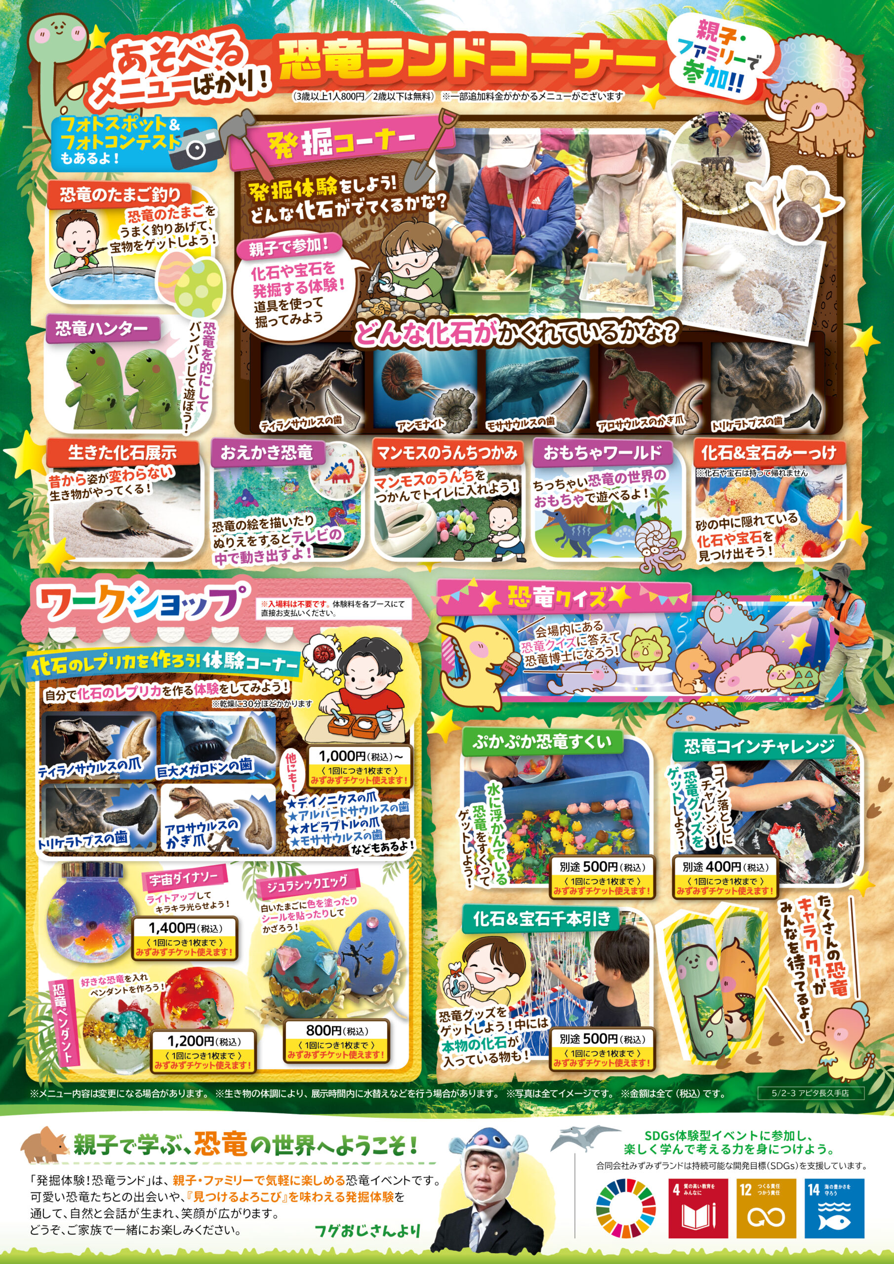 アピタ長久手店 愛知県 2026.04.17 日時2026年5月2日〜3日 10:00~16:00(最終入場15:30) 定員予約不要 入場料:お一人様800円(2歳以下は無料) ※お支払いは現金のみ ※未就学児様のご入場は、高校生以上の付き添いが必要です ※付き添いの大人の方も入場料がかかります ※ワークショップコーナーは入場料不要 イベント種別あそべぇる恐竜ランド メニュー お問い合わせはこちら