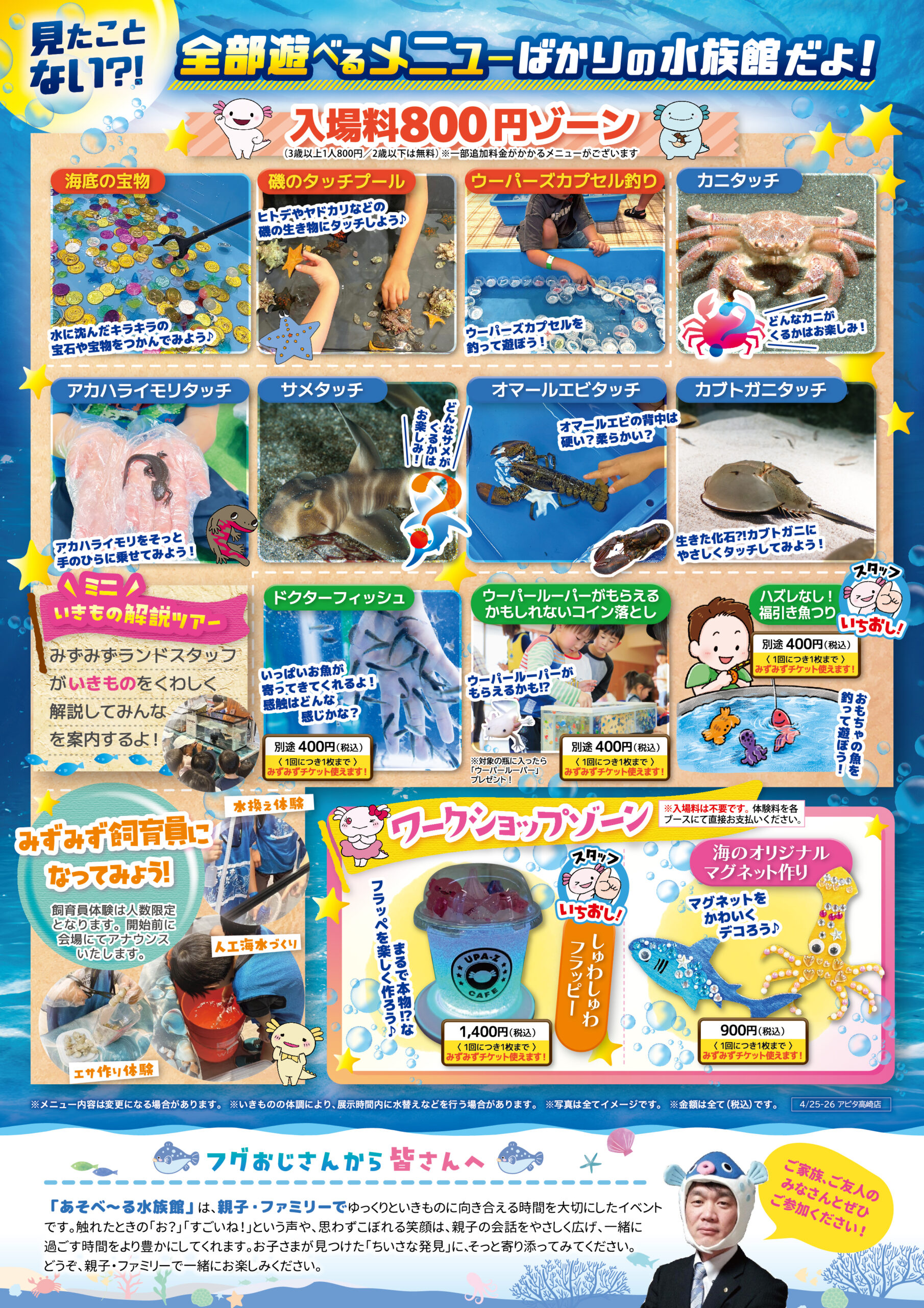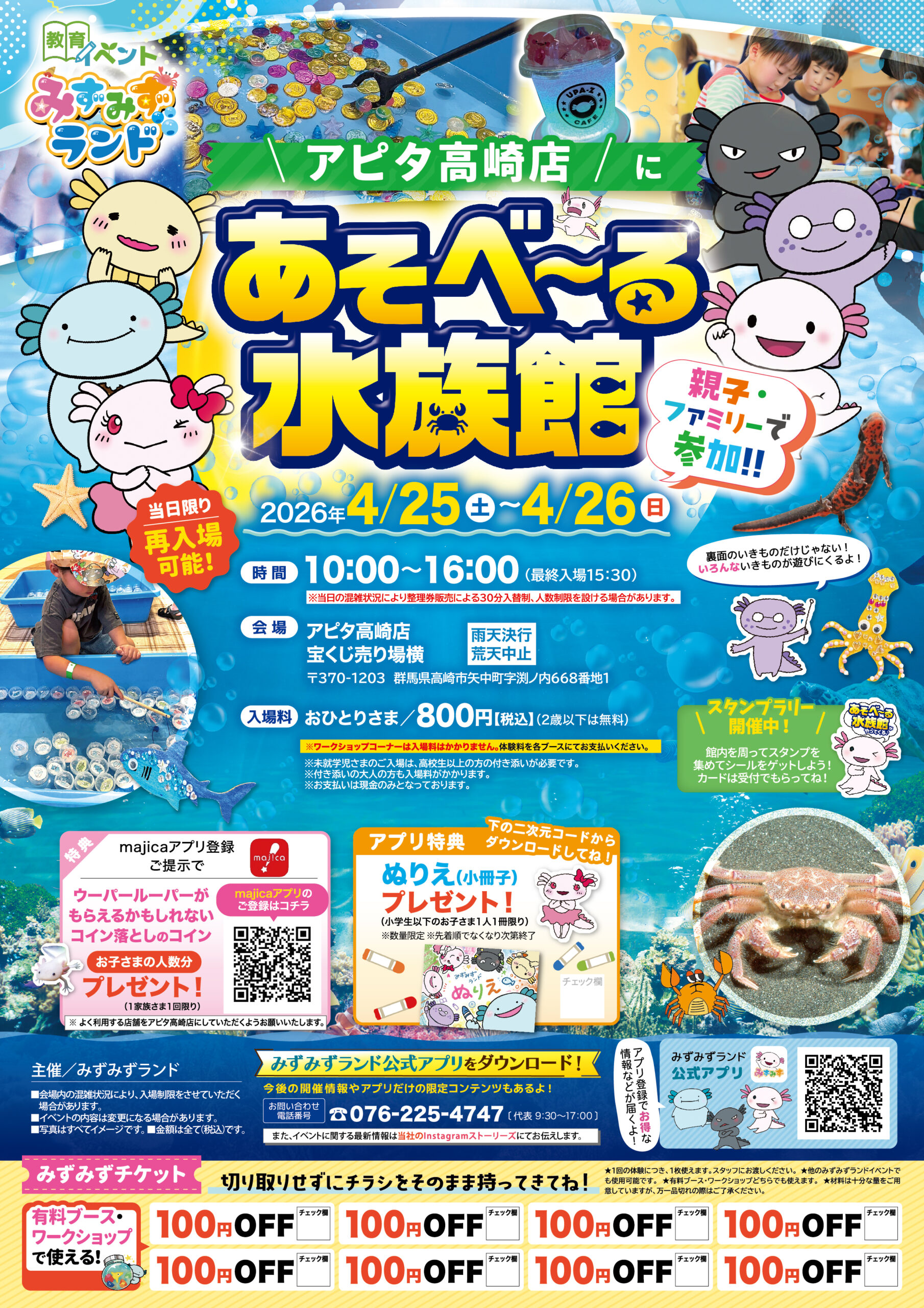 アピタ高崎店 群馬県 2026.04.10 日時2026年4月25日〜26日 10:00~16:00(最終入場15:30) 【雨天決行/荒天中止】 定員予約不要 入場料:お一人様800円(2歳以下は無料) ※お支払いは現金のみ ※未就学児様のご入場は、高校生以上の付き添いが必要です ※付き添いの大人の方も入場料がかかります ※ワークショップコーナーは入場料不要 イベント種別大あそべ~る水族館 メニュー お問い合わせはこちら