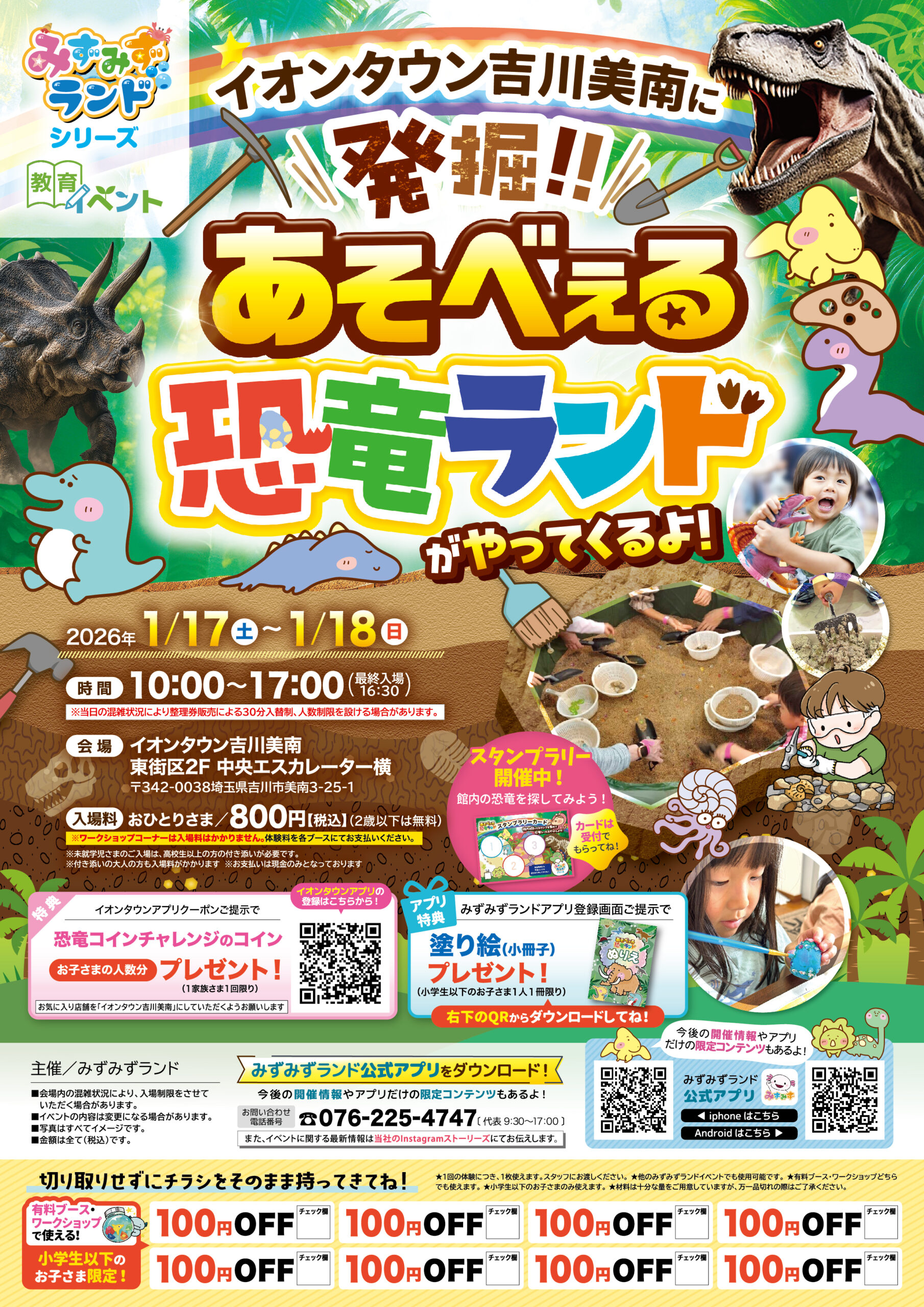 イオンタウン吉川美南 埼玉県 2025.12.09 日時2026年1月17日〜18日 10:00~17:00(最終入場16:30) 定員予約不要 入場料:お一人様800円(2歳以下は無料) ※未就学児様のご入場は、高校生以上の付き添いが必要です ※付き添いの大人の方も入場料がかかります ※ワークショップコーナーは入場料不要 イベント種別あそべぇる恐竜ランド メニュー お問い合わせはこちら
