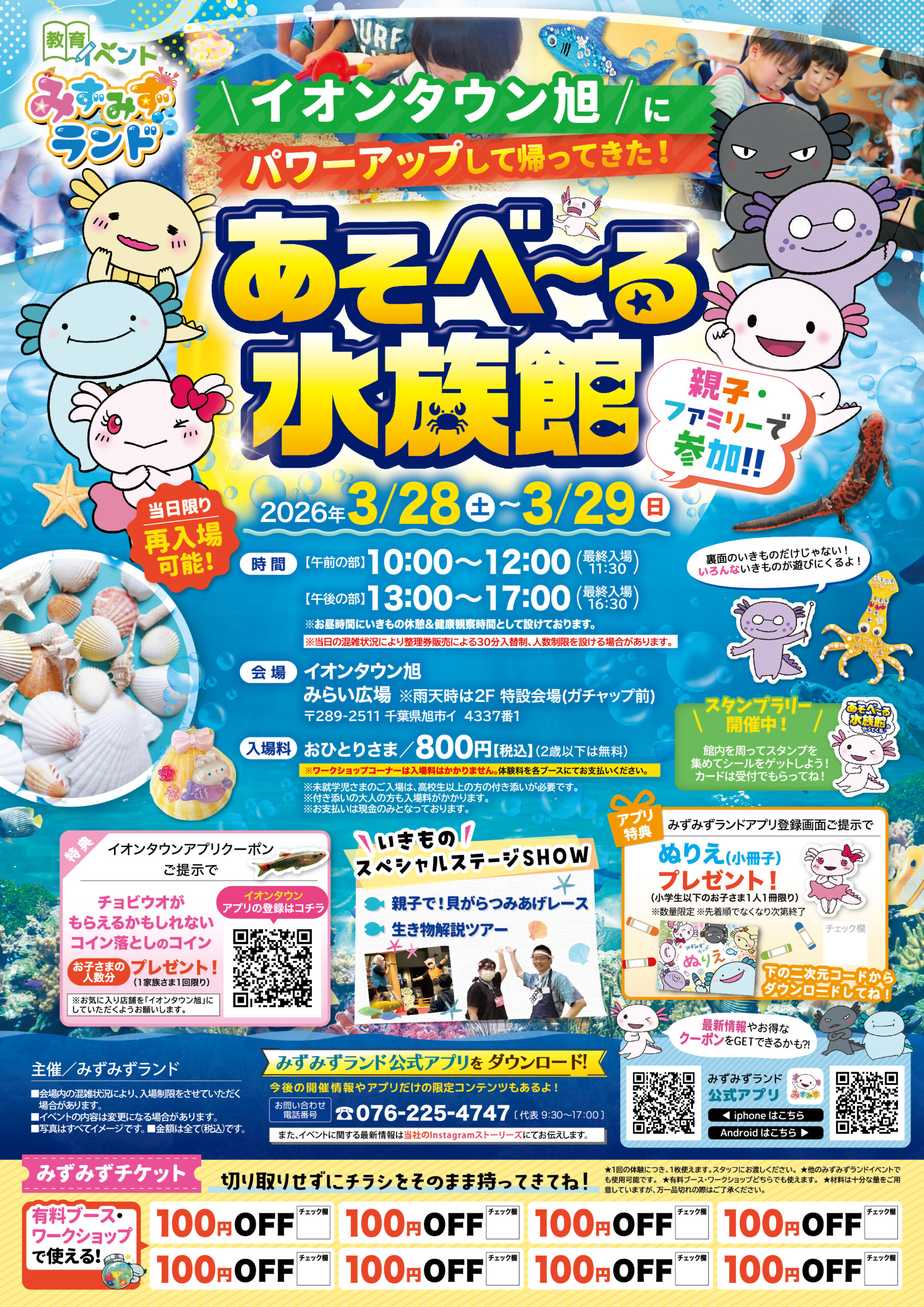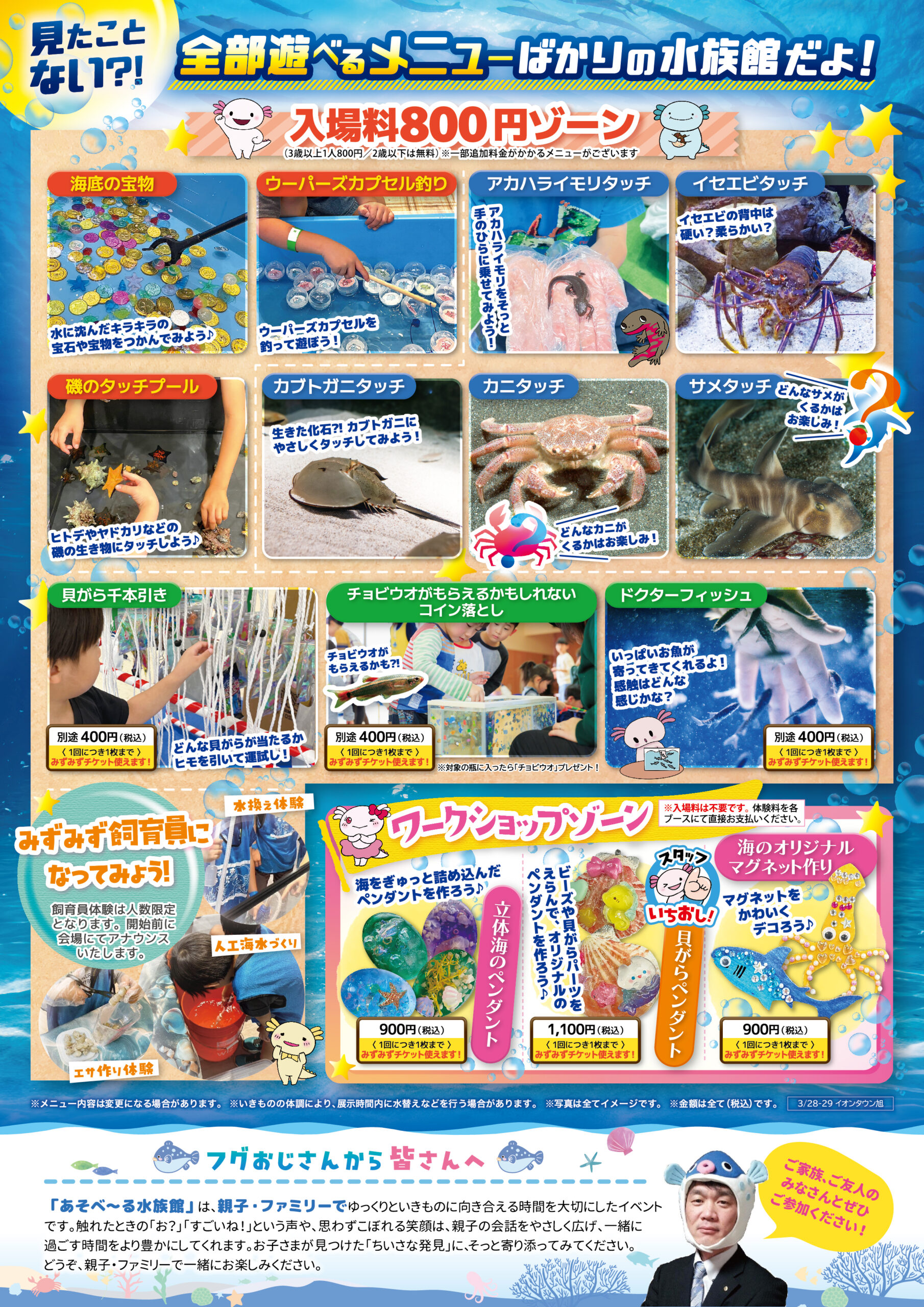 イオンタウン旭 千葉県 2026.03.01 日時2026年3月28日〜29日 〈午前の部〉10:00~12:00(最終入場11:30) 〈午後の部〉13:00~17:00(最終入場16:30) ※お昼時間に生き物休憩&健康観察時間として設けております。 定員予約不要 入場料:お一人様800円(2歳以下は無料) ※お支払いは現金のみ ※未就学児様のご入場は、高校生以上の付き添いが必要です ※付き添いの大人の方も入場料がかかります ※ワークショップコーナーは入場料不要 イベント種別大あそべ~る水族館 メニュー お問い合わせはこちら