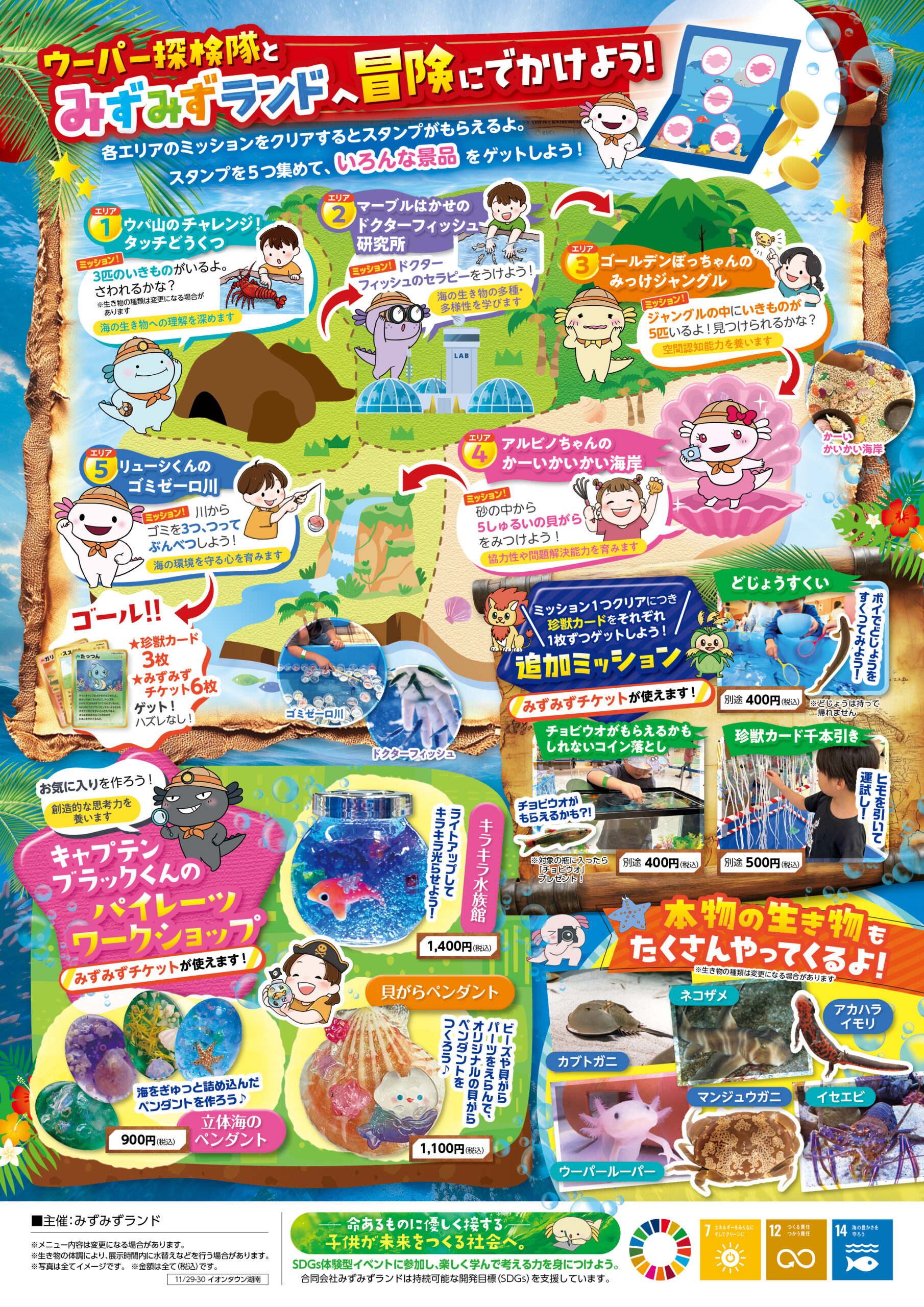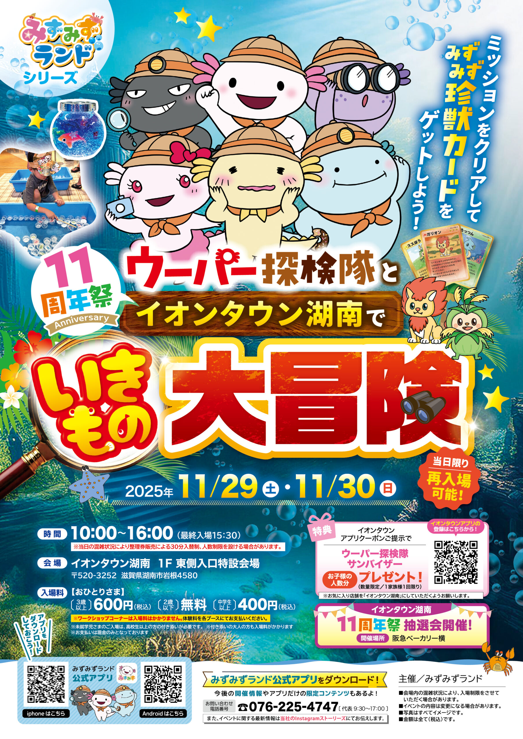 イオンタウン湖南 滋賀県 2025.11.11 日時2025年11月29日〜30日 10:00~16:00(最終入場15:30) 定員予約不要 入場料:お一人様 〈3歳以上 600円/税込〉 〈2歳以下 無料〉 〈中学生以上 400円/税込〉 ※未就学児様のご入場は、高校生以上の付き添いが必要です ※付き添いの大人の方も入場料がかかります ※ワークショップコーナーは入場料不要 イベント種別いきもの大冒険 メニュー お問い合わせはこちら