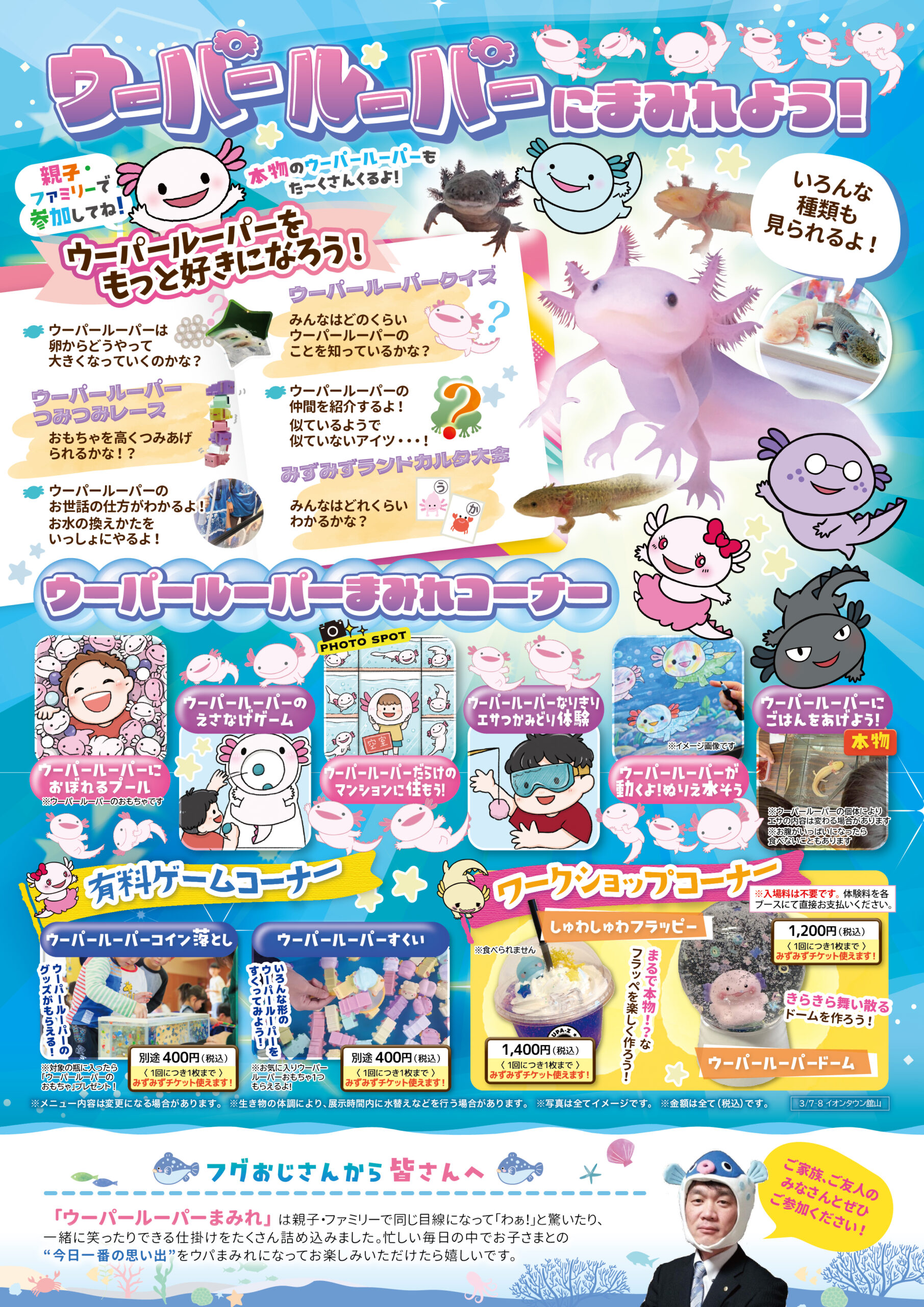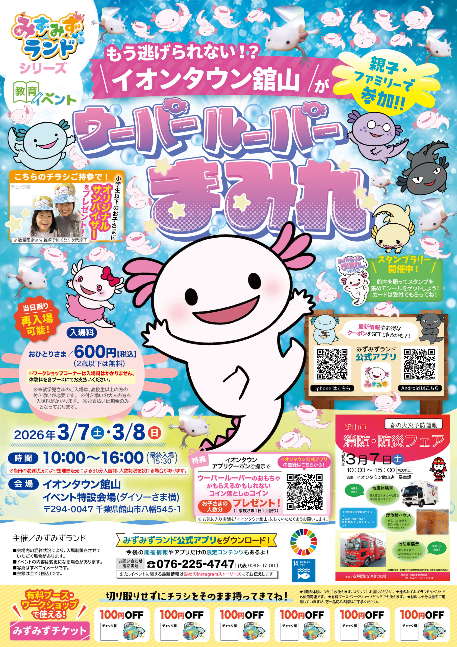 イオンタウン館山 千葉県 2026.02.15 日時2026年3月7日〜8日 10:00~16:00(最終入場15:30) 定員予約不要 入場料:お一人様600円(2歳以下は無料) ※お支払いは現金のみ ※未就学児様のご入場は、高校生以上の付き添いが必要です ※付き添いの大人の方も入場料がかかります ※ワークショップコーナーは入場料不要 イベント種別ウーパールーパーまみれ メニュー お問い合わせはこちら