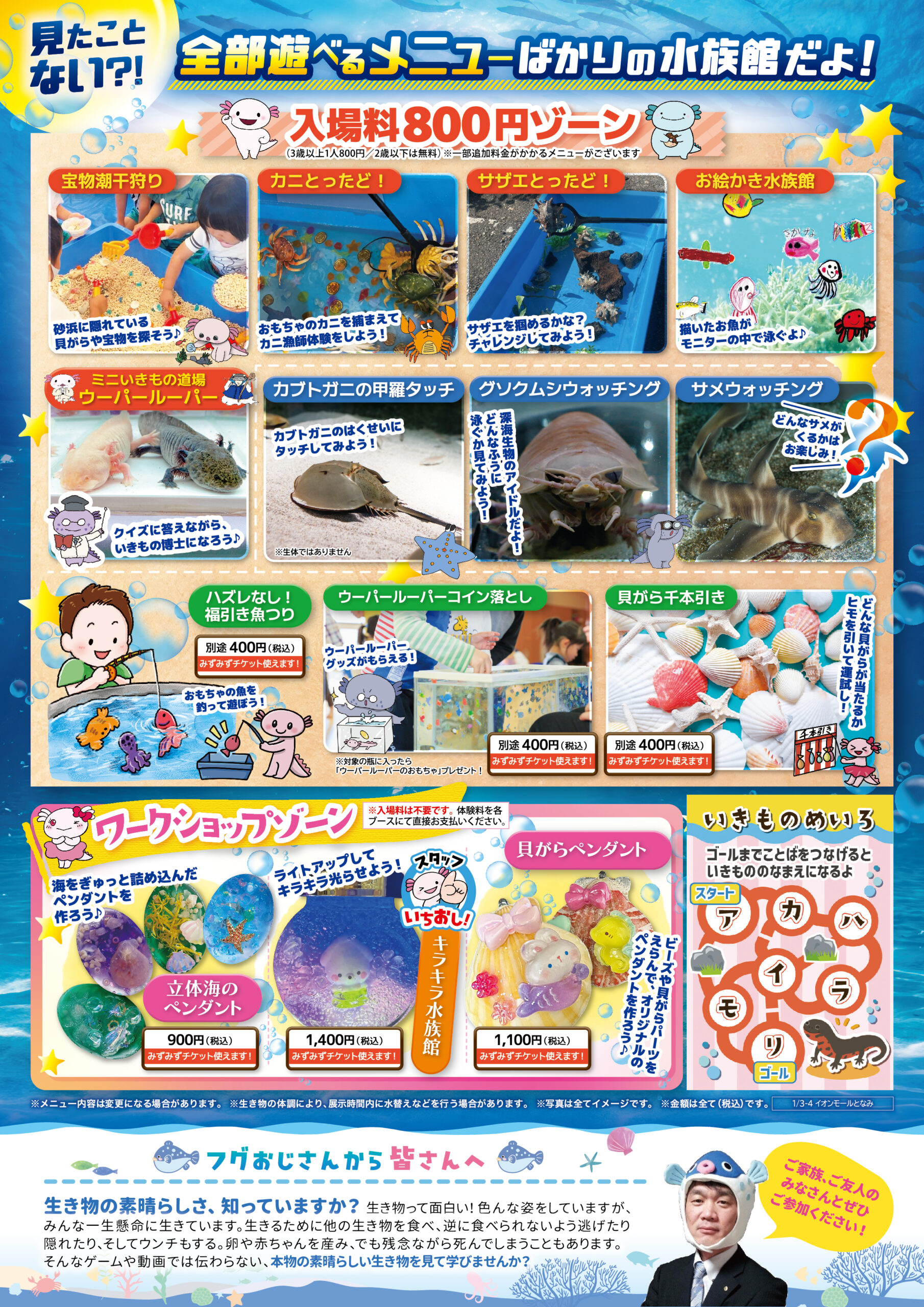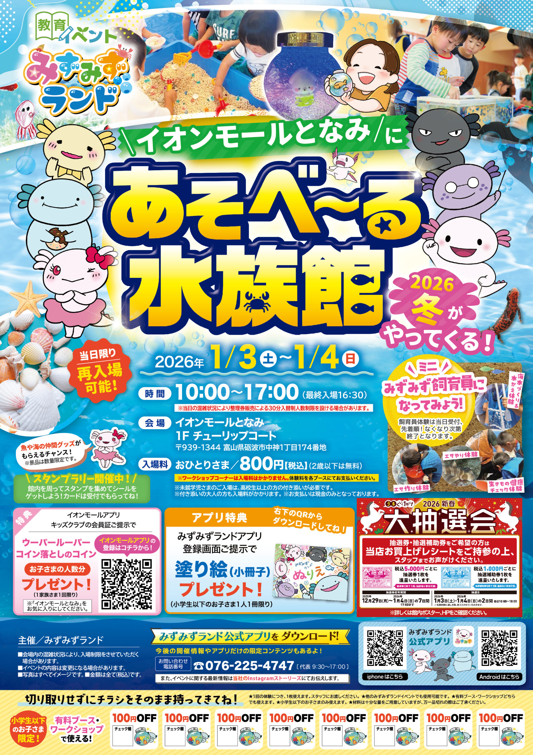 イオンモールとなみ 富山県 2025.12.09 日時2026年1月3日〜4日 10:00~17:00(最終入場16:30) 定員予約不要 入場料:お一人様800円(2歳以下は無料) ※未就学児様のご入場は、高校生以上の付き添いが必要です ※付き添いの大人の方も入場料がかかります ※ワークショップコーナーは入場料不要 イベント種別大あそべ~る水族館 メニュー お問い合わせはこちら