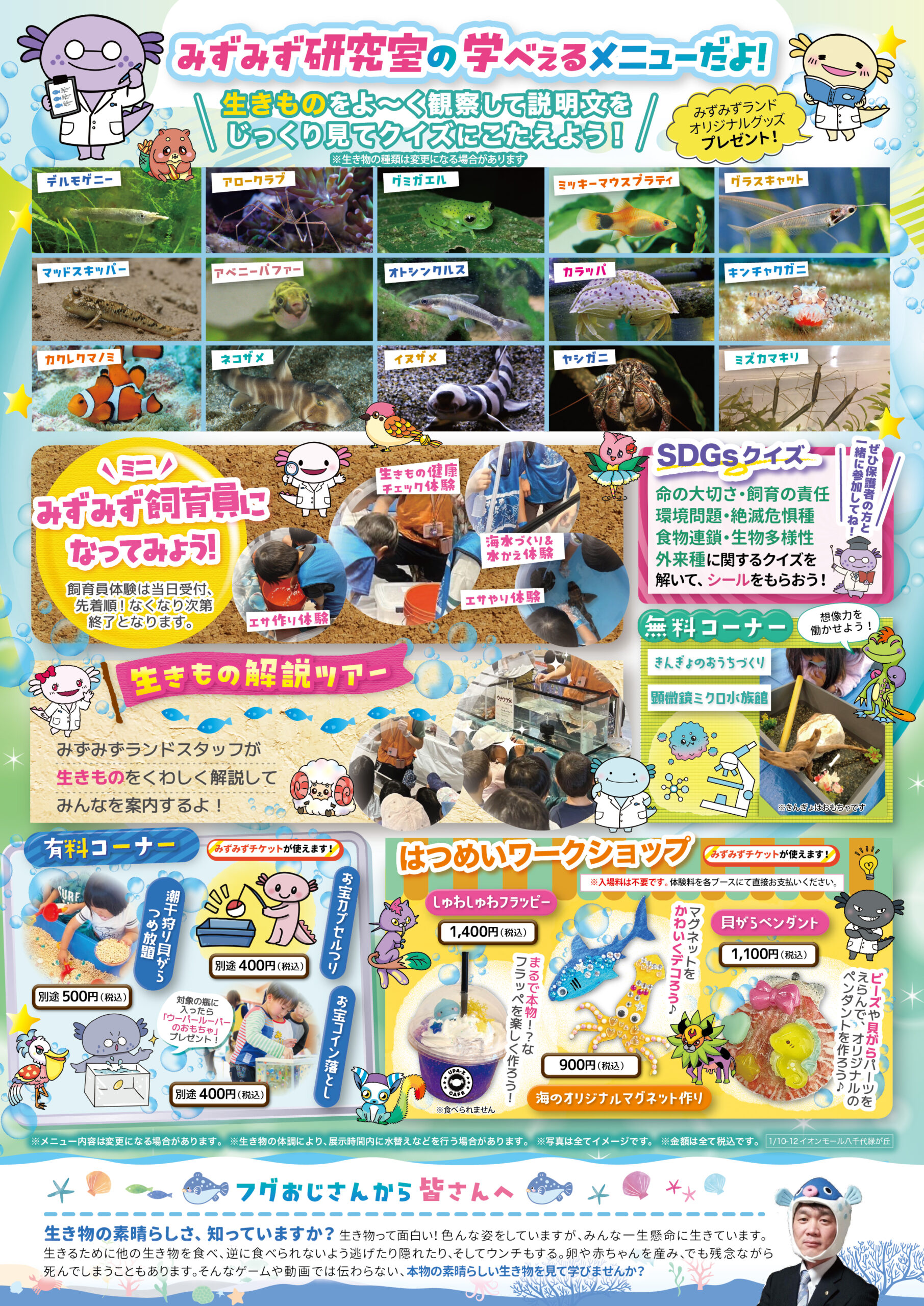 イオンモール八千代緑が丘 千葉県 2025.12.09 日時2026年1月10日〜12日 10:00~17:00(最終入場15:30) 定員予約不要 入場料:お一人様800円(2歳以下は無料) ※未就学児様のご入場は、高校生以上の付き添いが必要です ※付き添いの大人の方も入場料がかかります ※ワークショップコーナーは入場料不要 イベント種別学べぇる水族館 メニュー お問い合わせはこちら