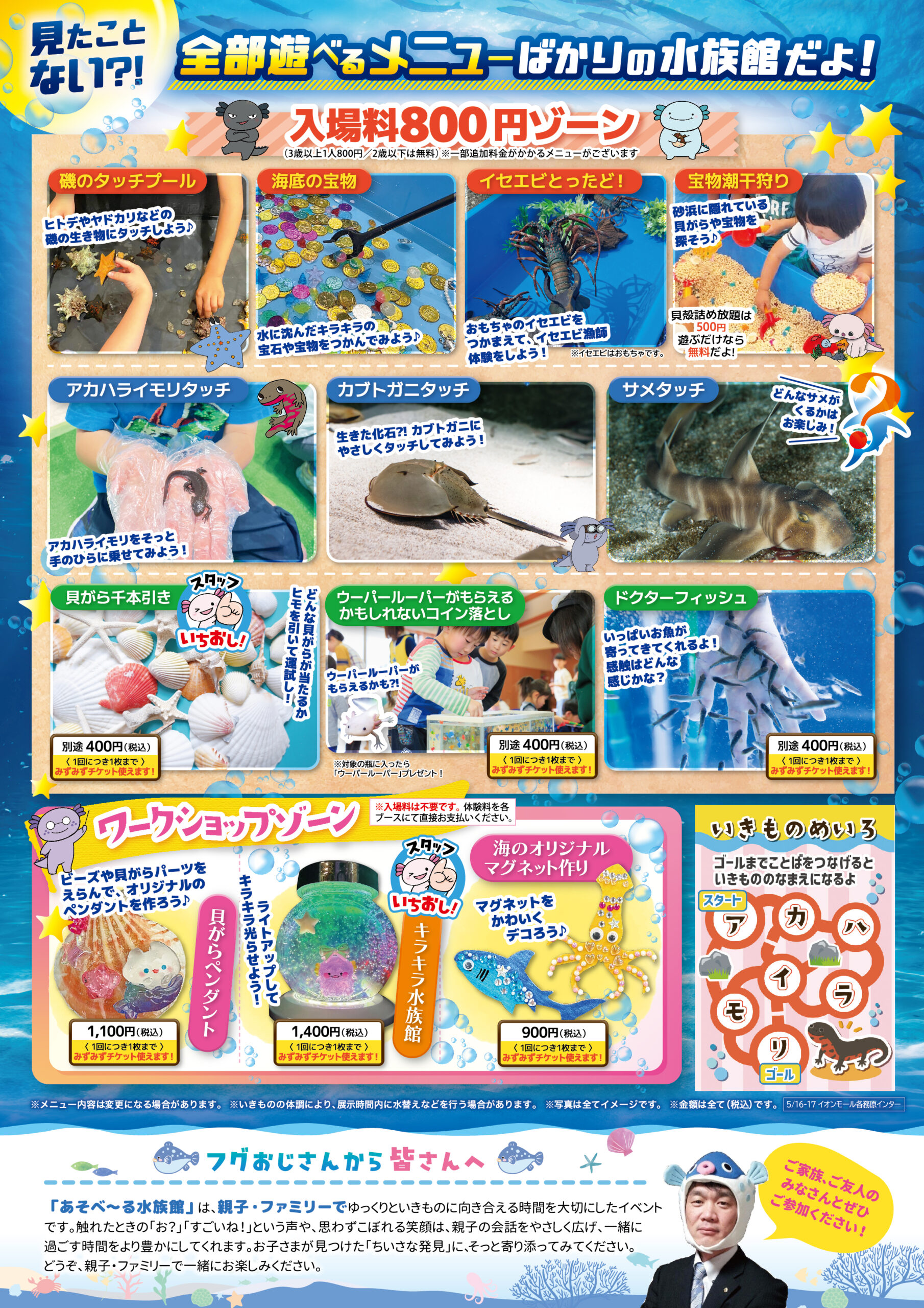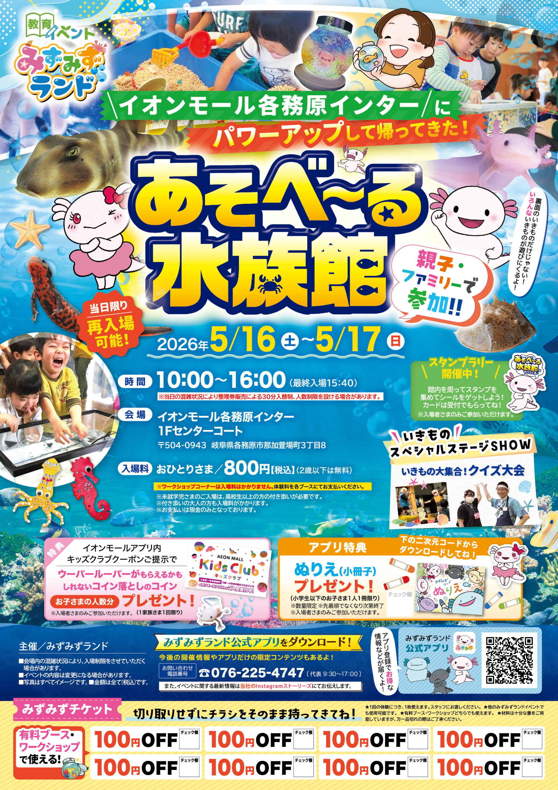 イオンモール各務原インター 岐阜県 2026.04.25 日時2026年5月16日〜17日 10:00~16:00(最終入場15:40) 定員予約不要 入場料:お一人様800円(2歳以下は無料) ※お支払いは現金のみ ※未就学児様のご入場は、高校生以上の付き添いが必要です ※付き添いの大人の方も入場料がかかります ※ワークショップコーナーは入場料不要 イベント種別大あそべ~る水族館 メニュー お問い合わせはこちら