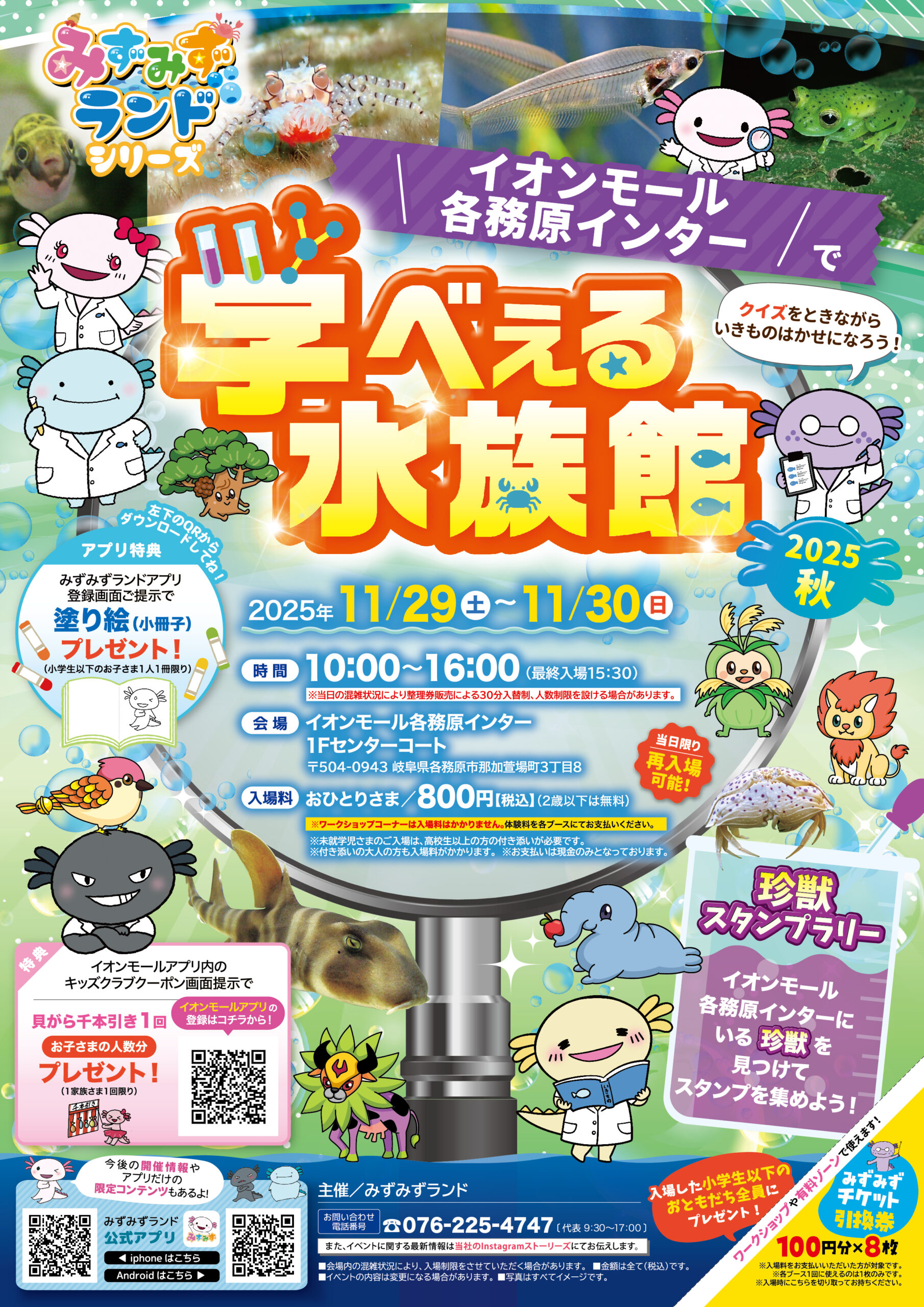 イオンモール各務原インター 岐阜県 2025.11.11 日時2025年11月29日〜30日 10:00~16:00(最終入場15:30) 定員予約不要 入場料:お一人様800円(2歳以下は無料) ※未就学児様のご入場は、高校生以上の付き添いが必要です ※付き添いの大人の方も入場料がかかります ※ワークショップコーナーは入場料不要 イベント種別学べぇる水族館 メニュー お問い合わせはこちら