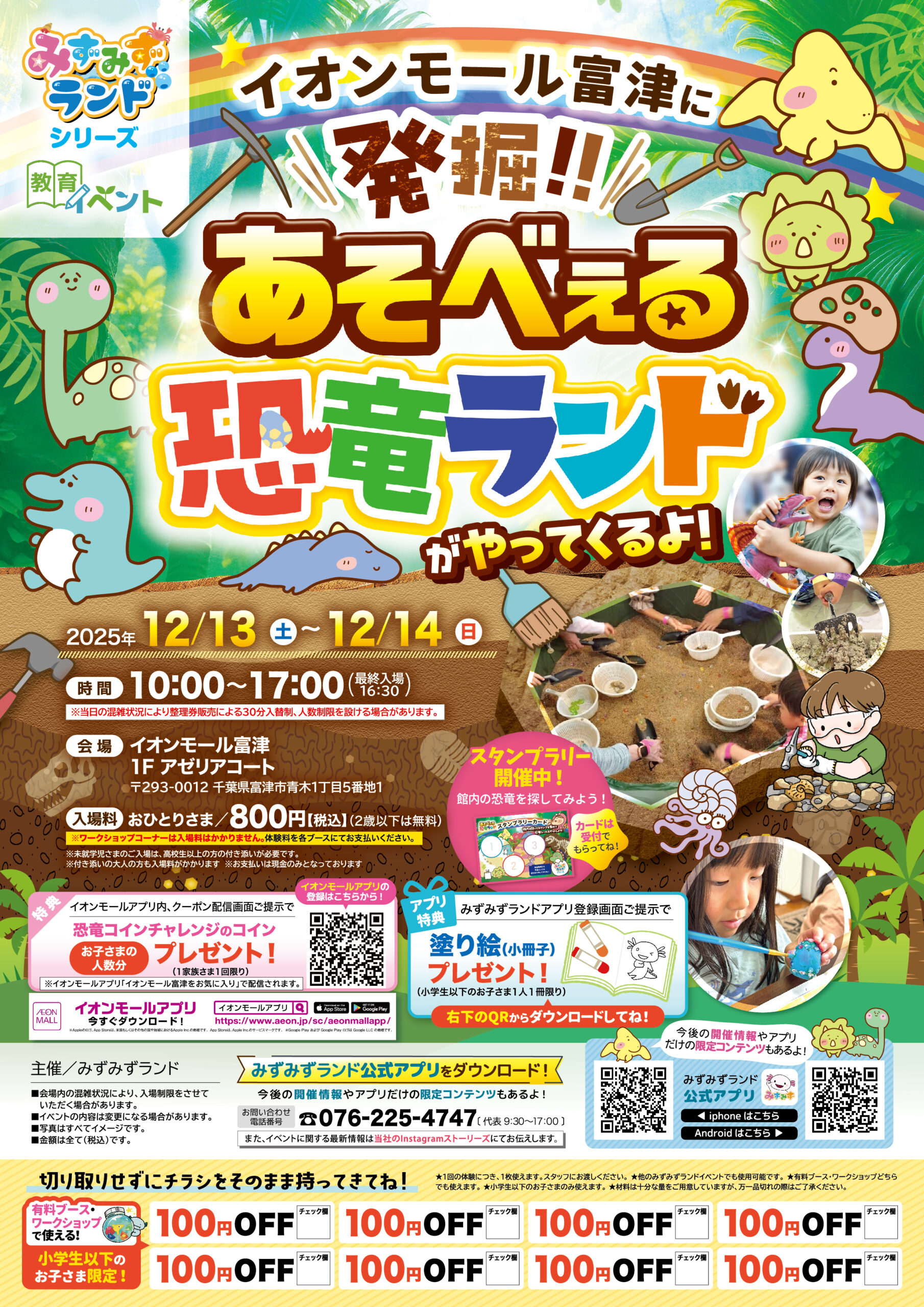 イオンモール富津 千葉県 2025.11.19 日時2025年12月13日〜14日 10:00~17:00(最終入場16:30) 定員予約不要 入場料:お一人様800円(2歳以下は無料) ※未就学児様のご入場は、高校生以上の付き添いが必要です ※付き添いの大人の方も入場料がかかります ※ワークショップコーナーは入場料不要 イベント種別あそべぇる恐竜ランド メニュー お問い合わせはこちら