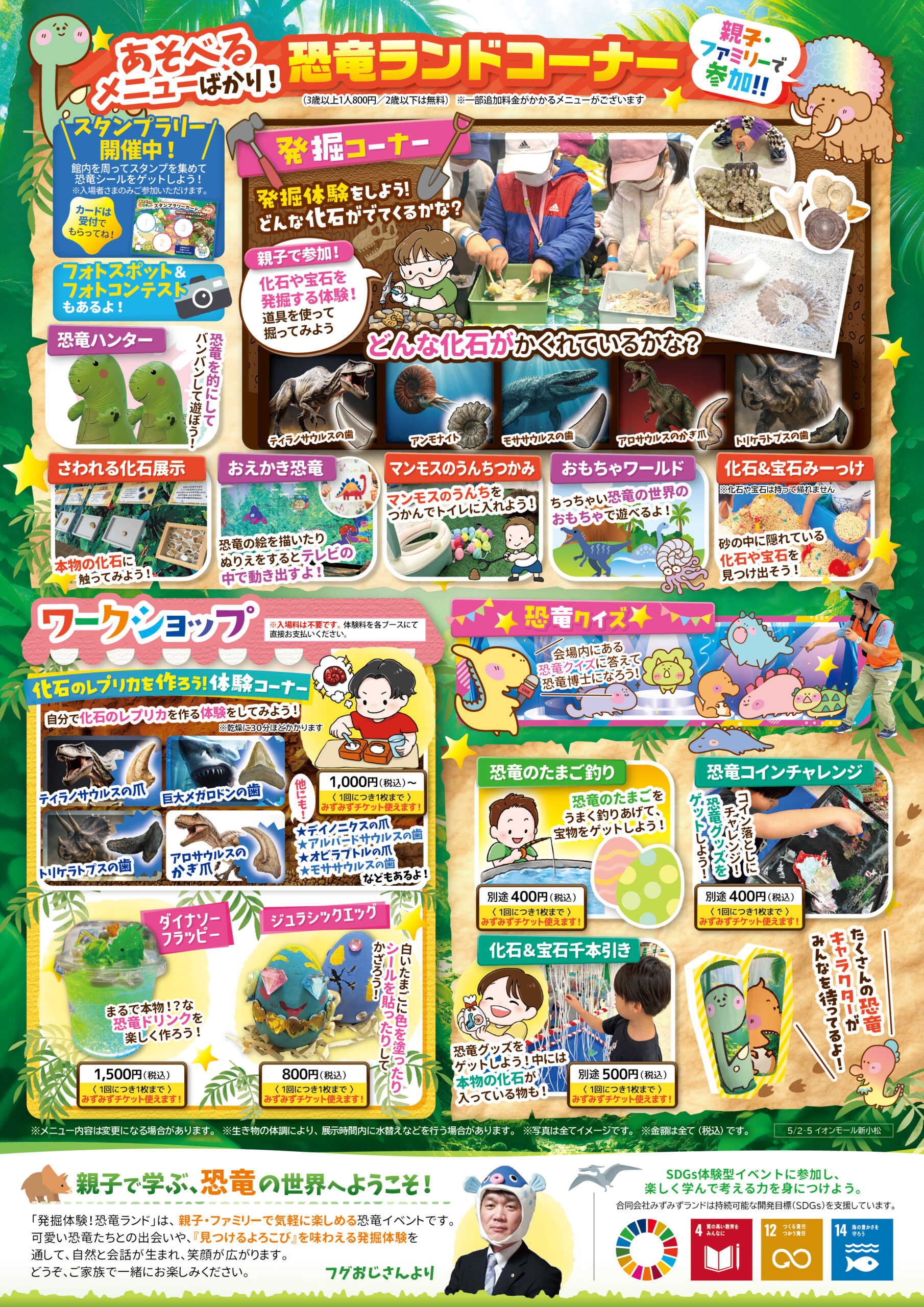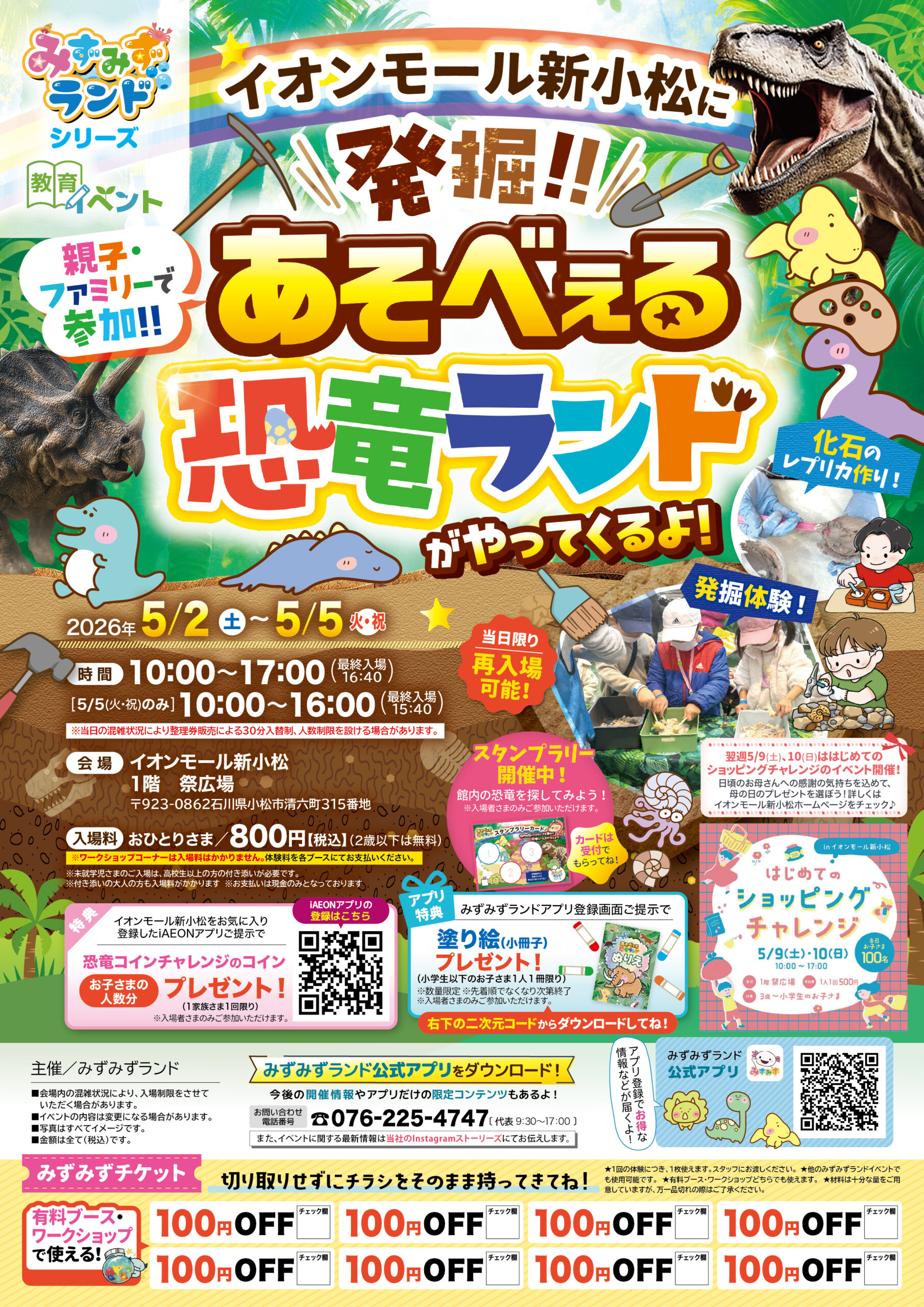 イオンモール新小松 石川県 2026.04.17 日時2026年5月2日〜5日 10:00~17:00(最終入場16:40) 〈5/5(火・祝)のみ10:00~16:00(最終入場15:40)〉 定員予約不要 入場料:お一人様800円(2歳以下は無料) ※お支払いは現金のみ ※未就学児様のご入場は、高校生以上の付き添いが必要です ※付き添いの大人の方も入場料がかかります ※ワークショップコーナーは入場料不要 イベント種別あそべぇる恐竜ランド メニュー お問い合わせはこちら