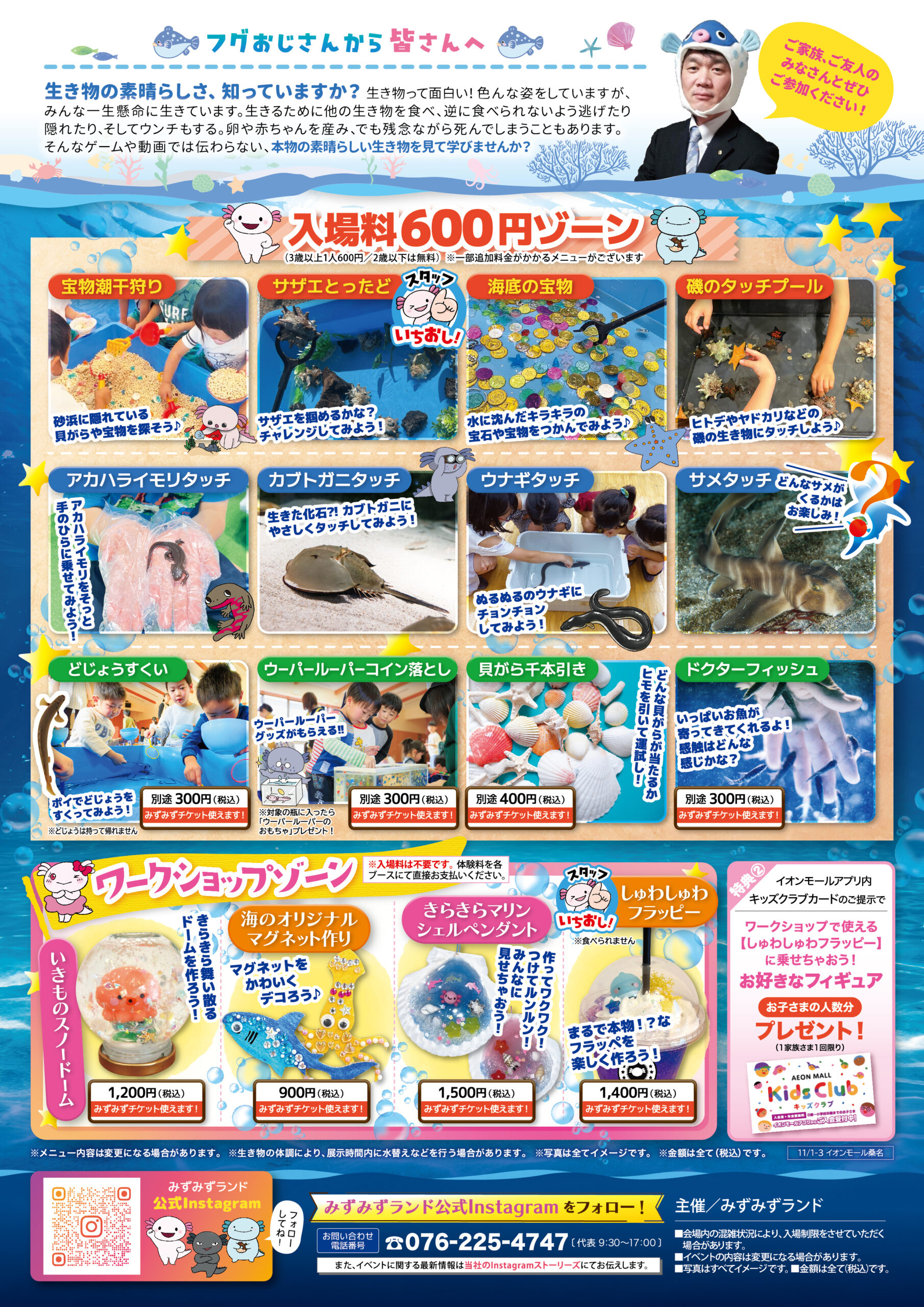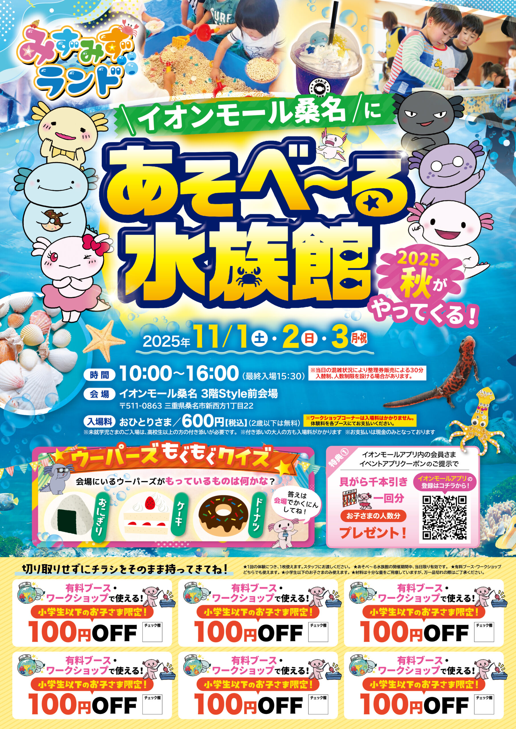 イオンモール桑名 三重県 2025.10.09 日時2025年11月1日〜3日 10:00~16:00(最終入場15:30) 定員予約不要 入場料:お一人様600円(2歳以下は無料) ※未就学児様のご入場は、高校生以上の付き添いが必要です ※付き添いの大人の方も入場料がかかります ※ワークショップコーナーは入場料不要 イベント種別大あそべ~る水族館 メニュー お問い合わせはこちら
