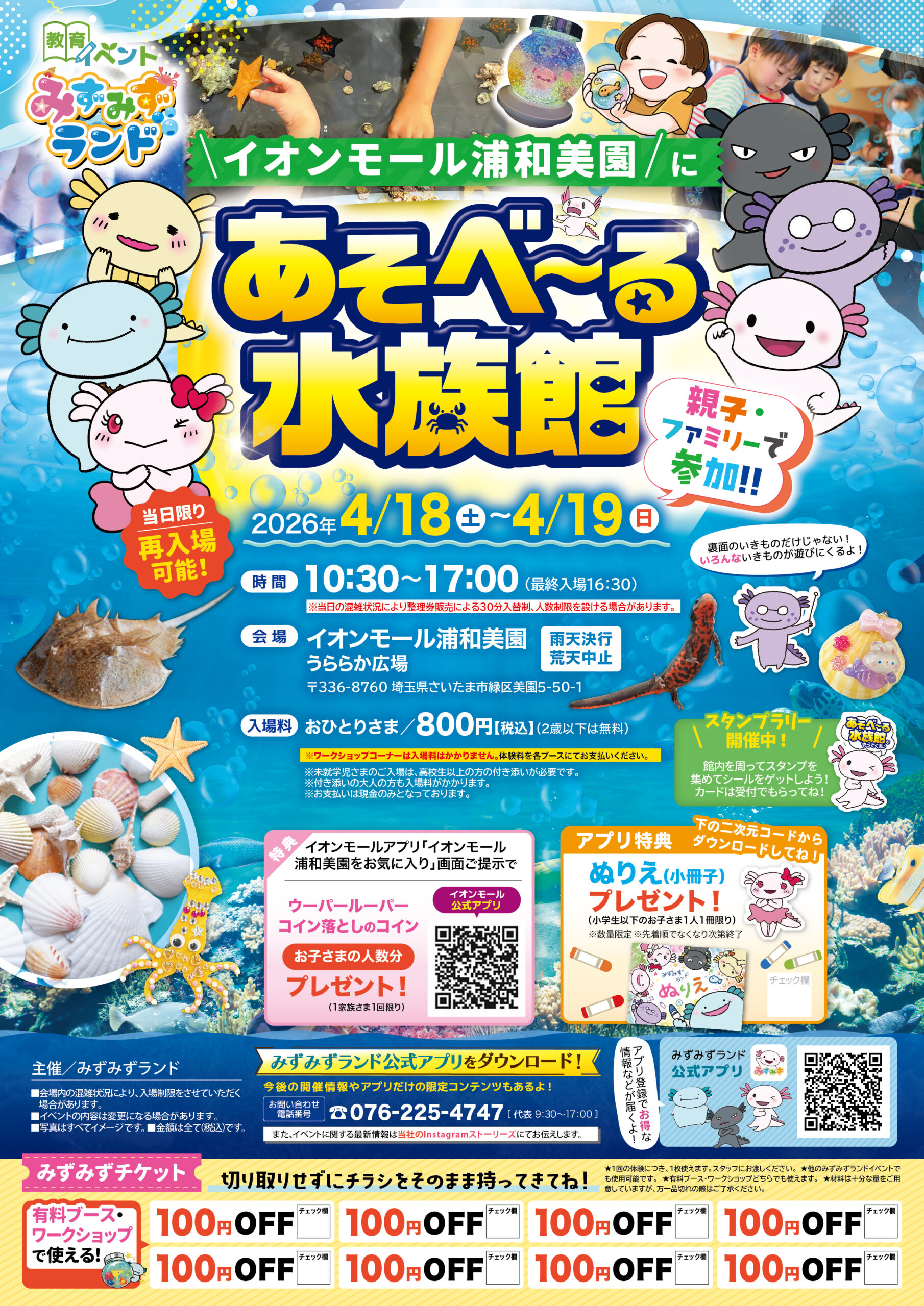 イオンモール浦和美園 埼玉県 2026.04.01 日時2026年4月18日〜19日 10:30~17:00(最終入場16:30) 【雨天決行/荒天中止】 定員予約不要 入場料:お一人様800円(2歳以下は無料) ※お支払いは現金のみ ※未就学児様のご入場は、高校生以上の付き添いが必要です ※付き添いの大人の方も入場料がかかります ※ワークショップコーナーは入場料不要 イベント種別大あそべ~る水族館 メニュー お問い合わせはこちら