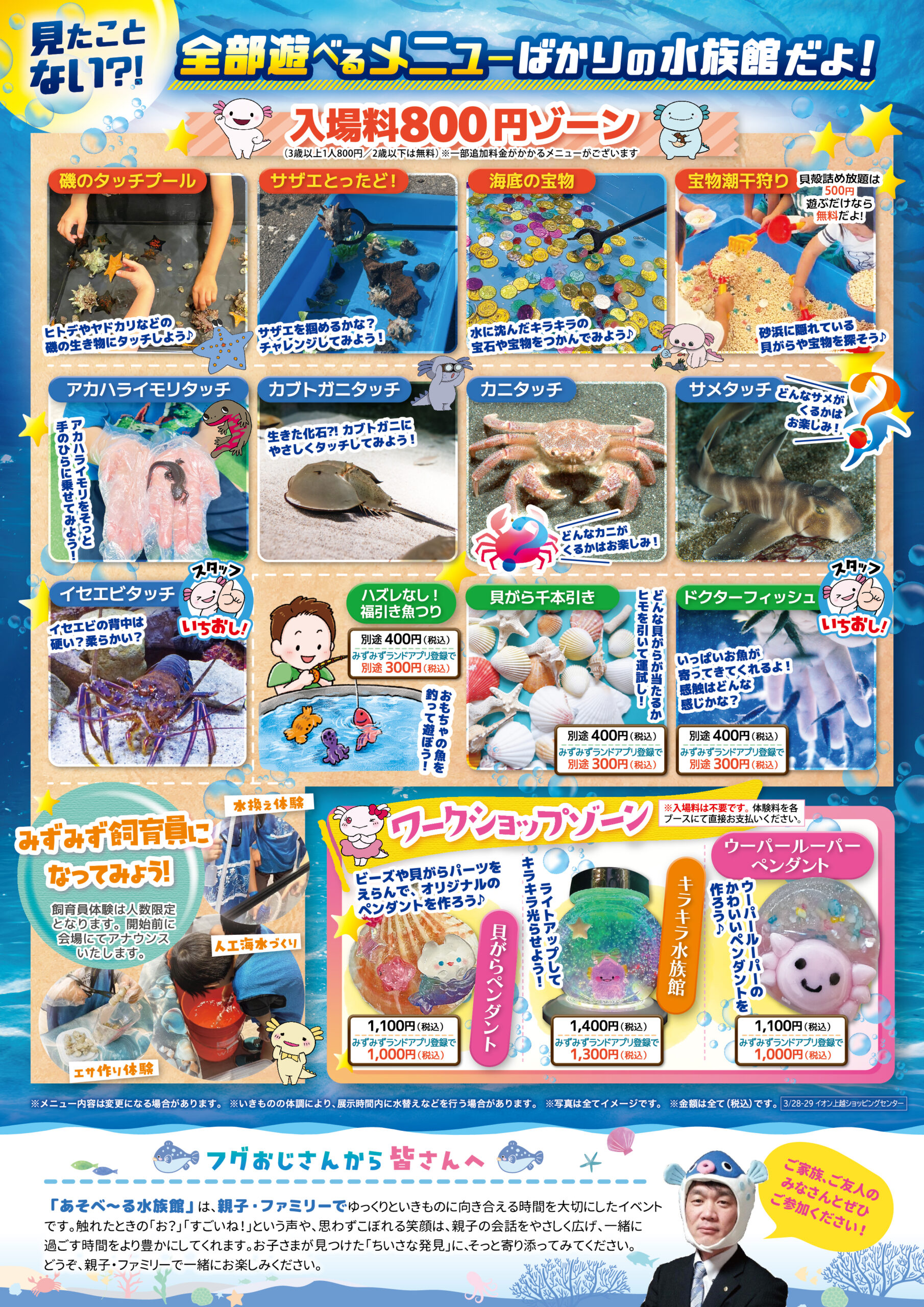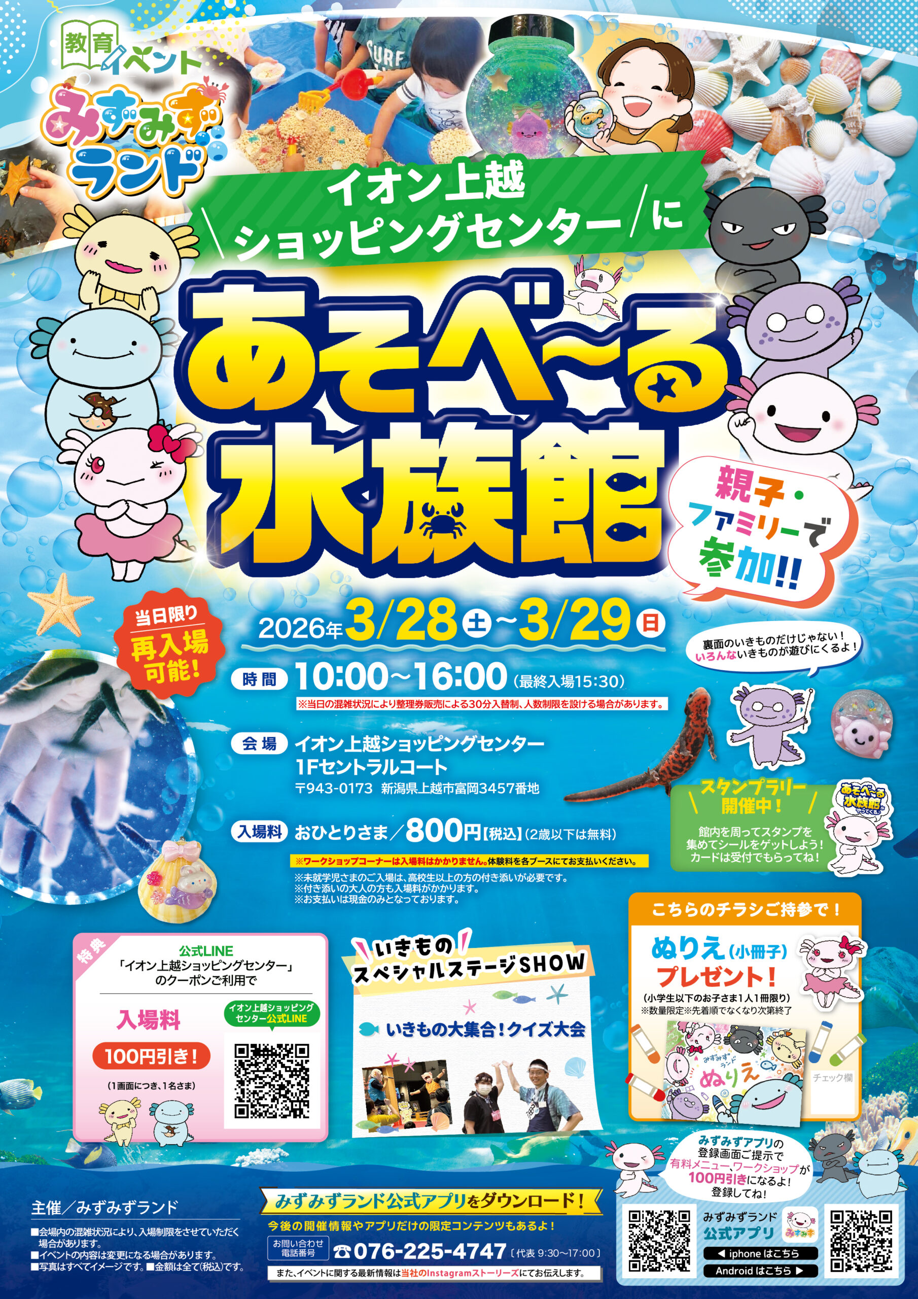 イオン上越ショッピングセンター 新潟県 2026.03.01 日時2026年3月28日〜29日 10:00~16:00(最終入場15:30) 定員予約不要 入場料:お一人様800円(2歳以下は無料) ※お支払いは現金のみ ※未就学児様のご入場は、高校生以上の付き添いが必要です ※付き添いの大人の方も入場料がかかります ※ワークショップコーナーは入場料不要 イベント種別大あそべ~る水族館 メニュー お問い合わせはこちら