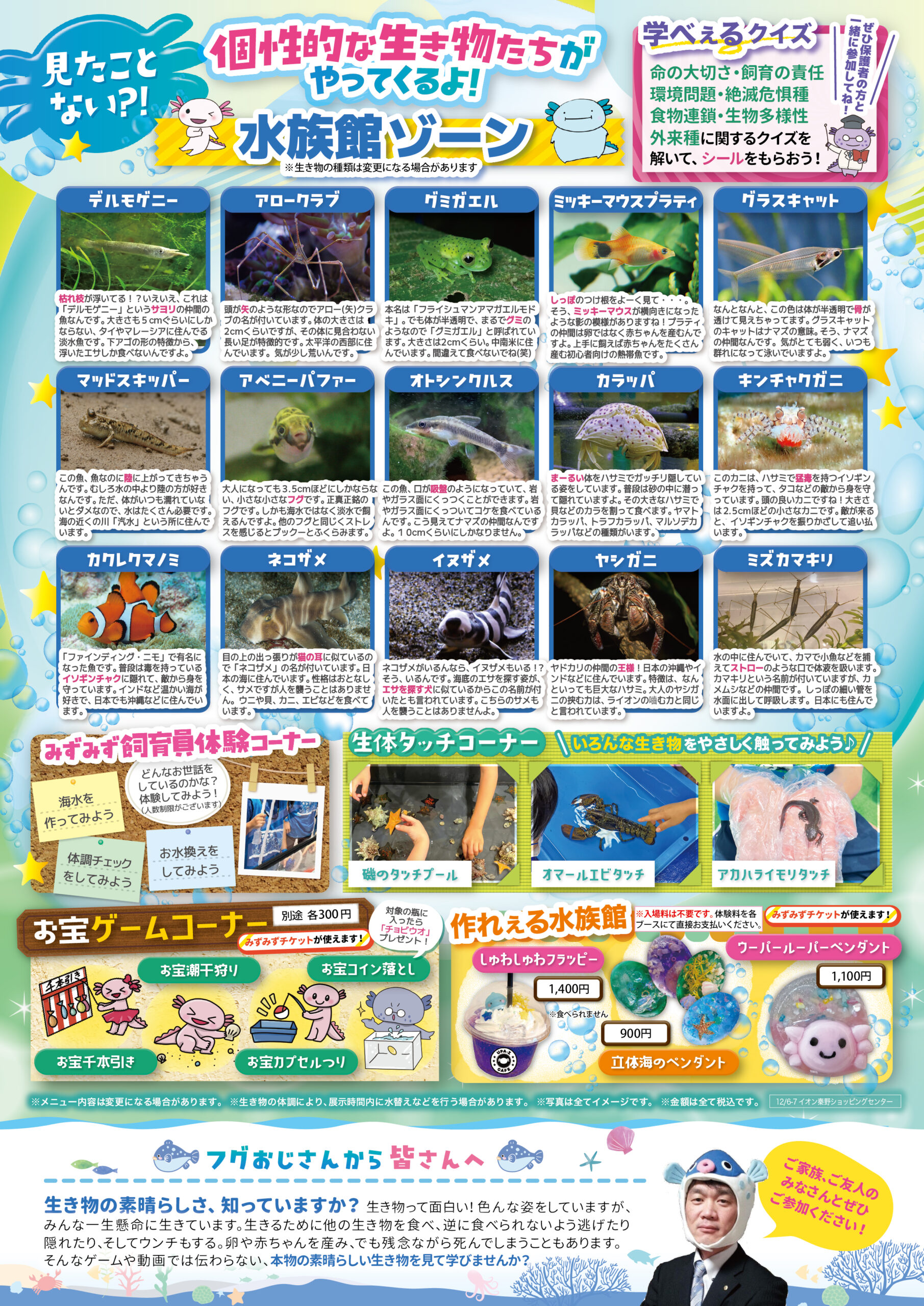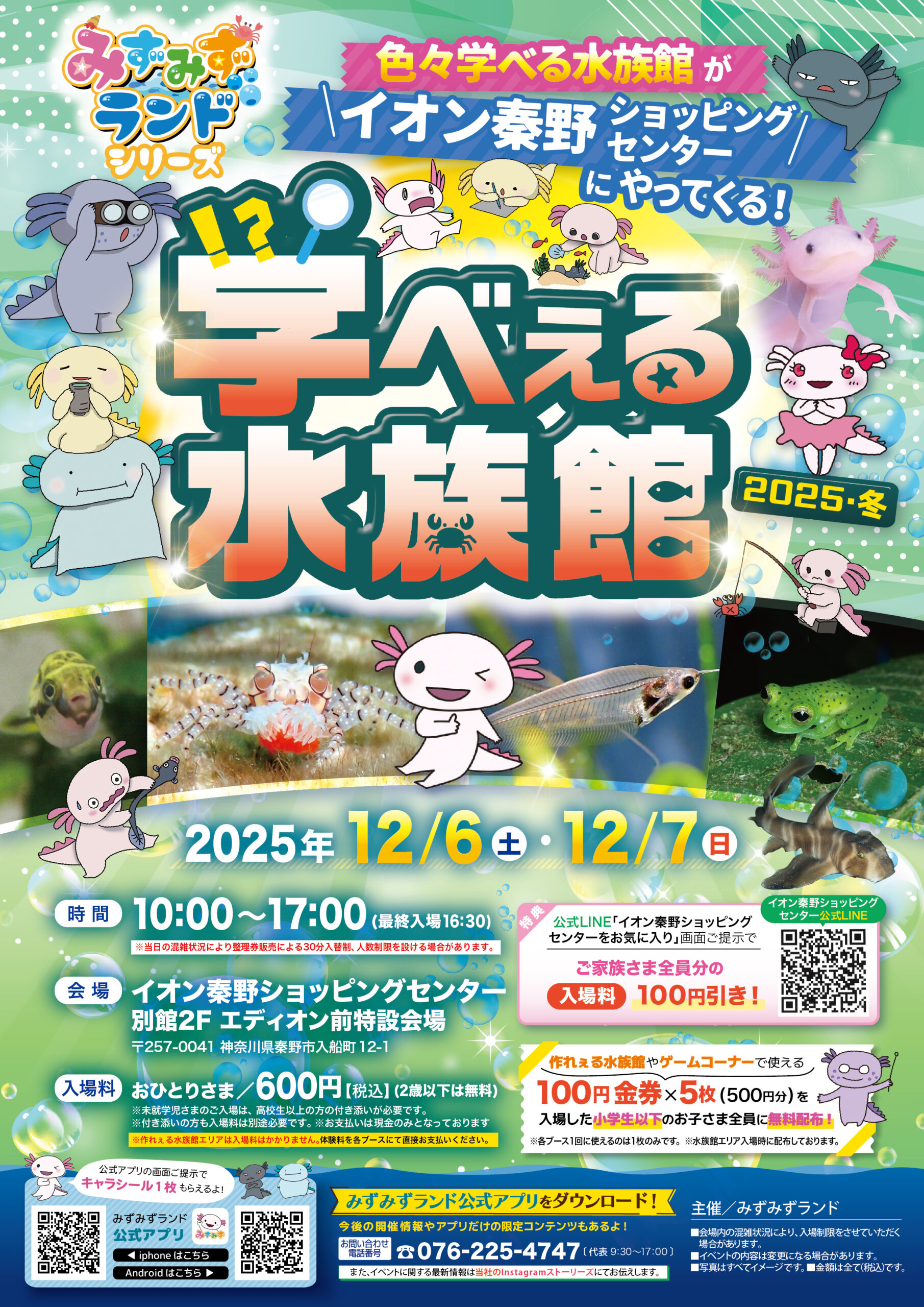 イオン秦野ショッピングセンター 神奈川県 2025.11.19 日時2025年12月6日〜7日 10:00~17:00(最終入場16:30) 定員予約不要 入場料:お一人様600円(2歳以下は無料) ※未就学児様のご入場は、高校生以上の付き添いが必要です ※付き添いの大人の方も入場料がかかります ※ワークショップコーナーは入場料不要 イベント種別学べぇる水族館 メニュー お問い合わせはこちら