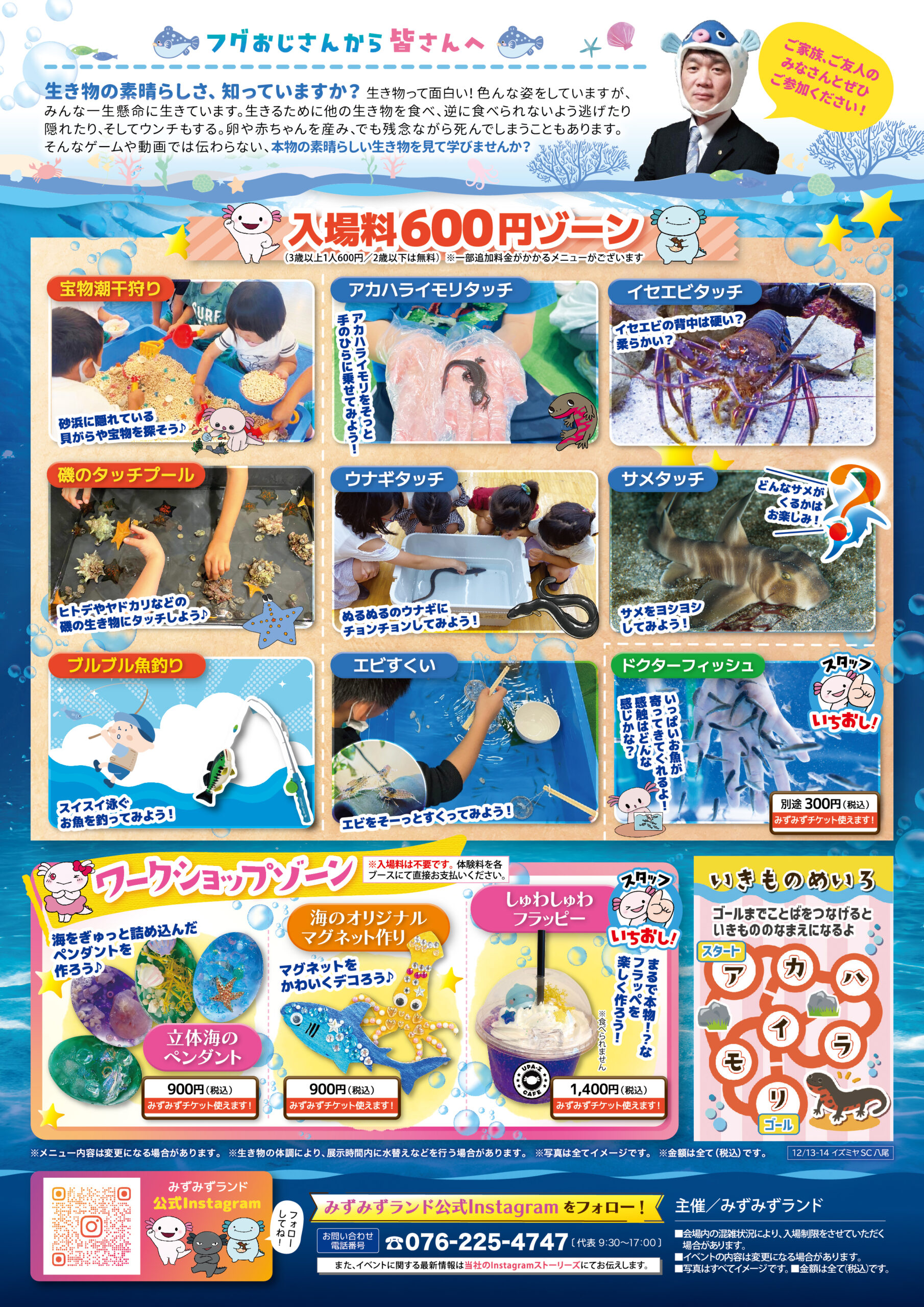 イズミヤショッピングセンター八尾 大阪府 2025.11.19 日時2025年12月13日〜14日 10:00~16:00(最終入場15:30) 定員予約不要 入場料:お一人様600円(2歳以下は無料) ※未就学児様のご入場は、高校生以上の付き添いが必要です ※付き添いの大人の方も入場料がかかります ※ワークショップコーナーは入場料不要 イベント種別大あそべ~る水族館 メニュー お問い合わせはこちら