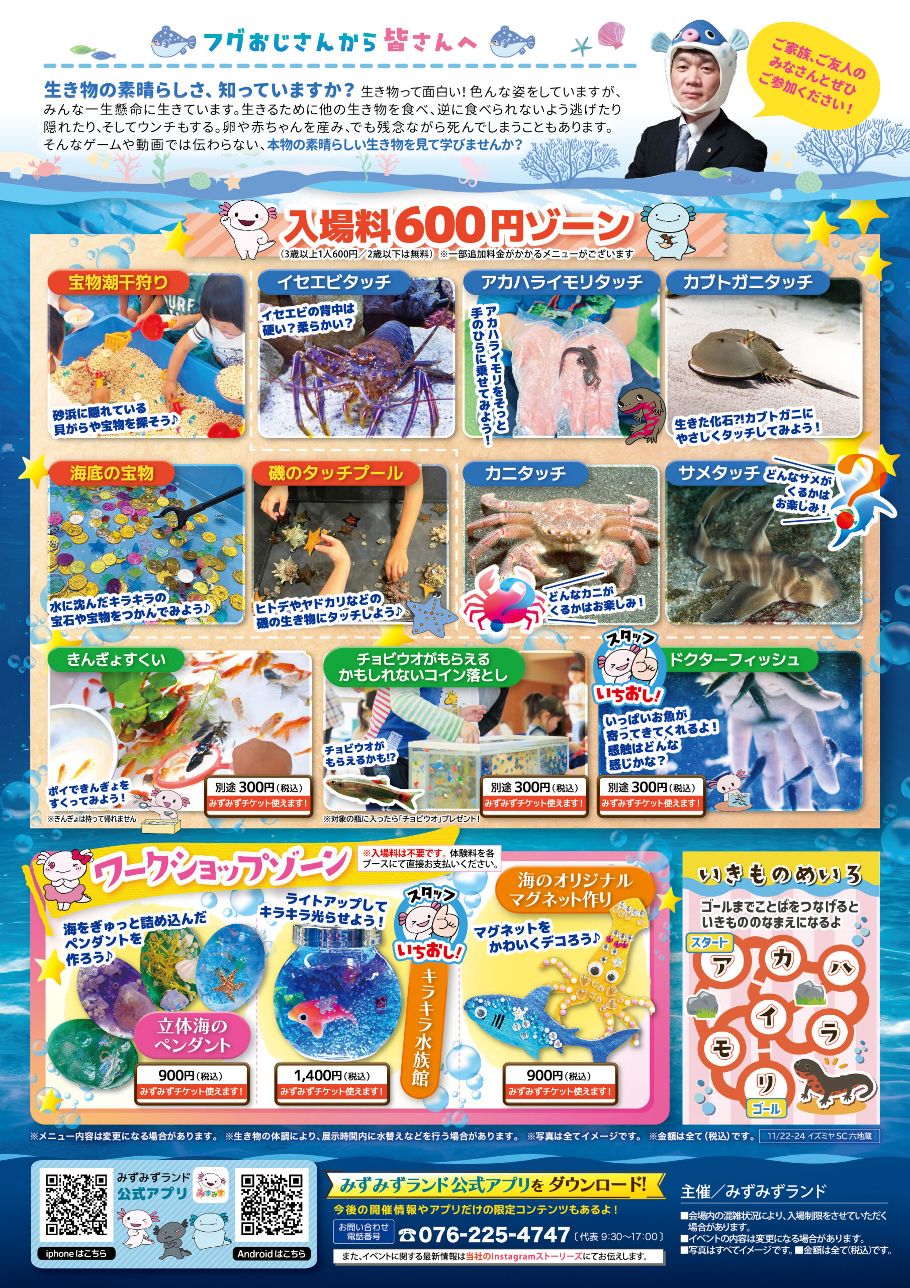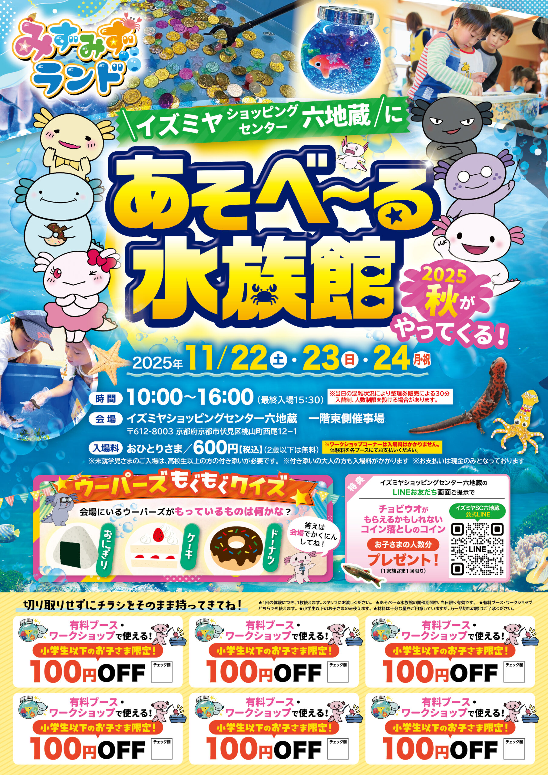 イズミヤショッピングセンター六地蔵 京都府 2025.11.10 日時2025年11月22日〜24日 10:00~16:00(最終入場15:30) 定員予約不要 入場料:お一人様800円(2歳以下は無料) ※未就学児様のご入場は、高校生以上の付き添いが必要です ※付き添いの大人の方も入場料がかかります ※ワークショップコーナーは入場料不要 イベント種別大あそべ~る水族館 メニュー お問い合わせはこちら