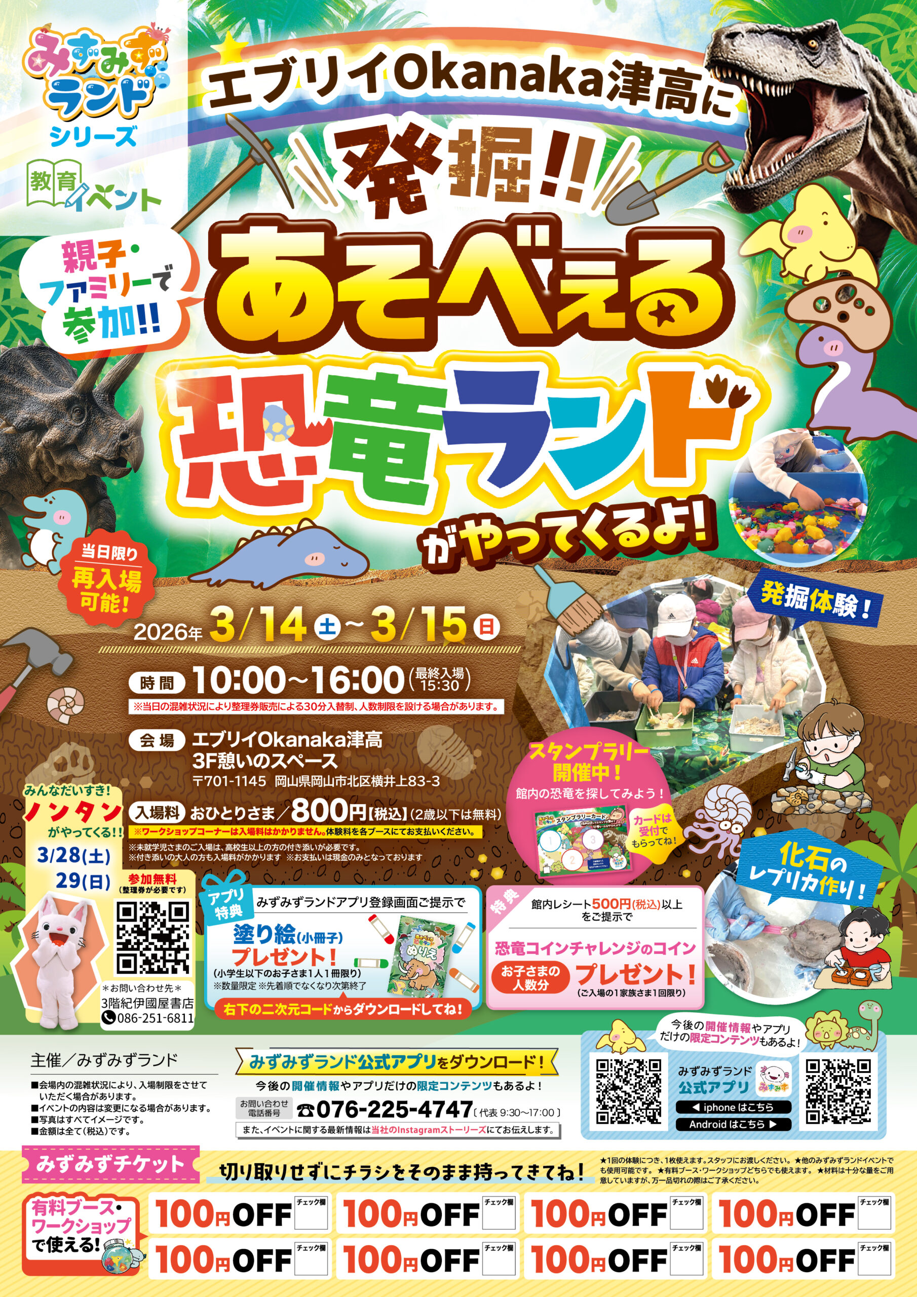 エブリイOkanaka津高 岡山県 2026.02.27 日時2026年3月14日〜15日 10:00~16:00(最終入場15:30) 定員予約不要 入場料:お一人様800円(2歳以下は無料) ※お支払いは現金のみ ※未就学児様のご入場は、高校生以上の付き添いが必要です ※付き添いの大人の方も入場料がかかります ※ワークショップコーナーは入場料不要 イベント種別あそべぇる恐竜ランド メニュー お問い合わせはこちら