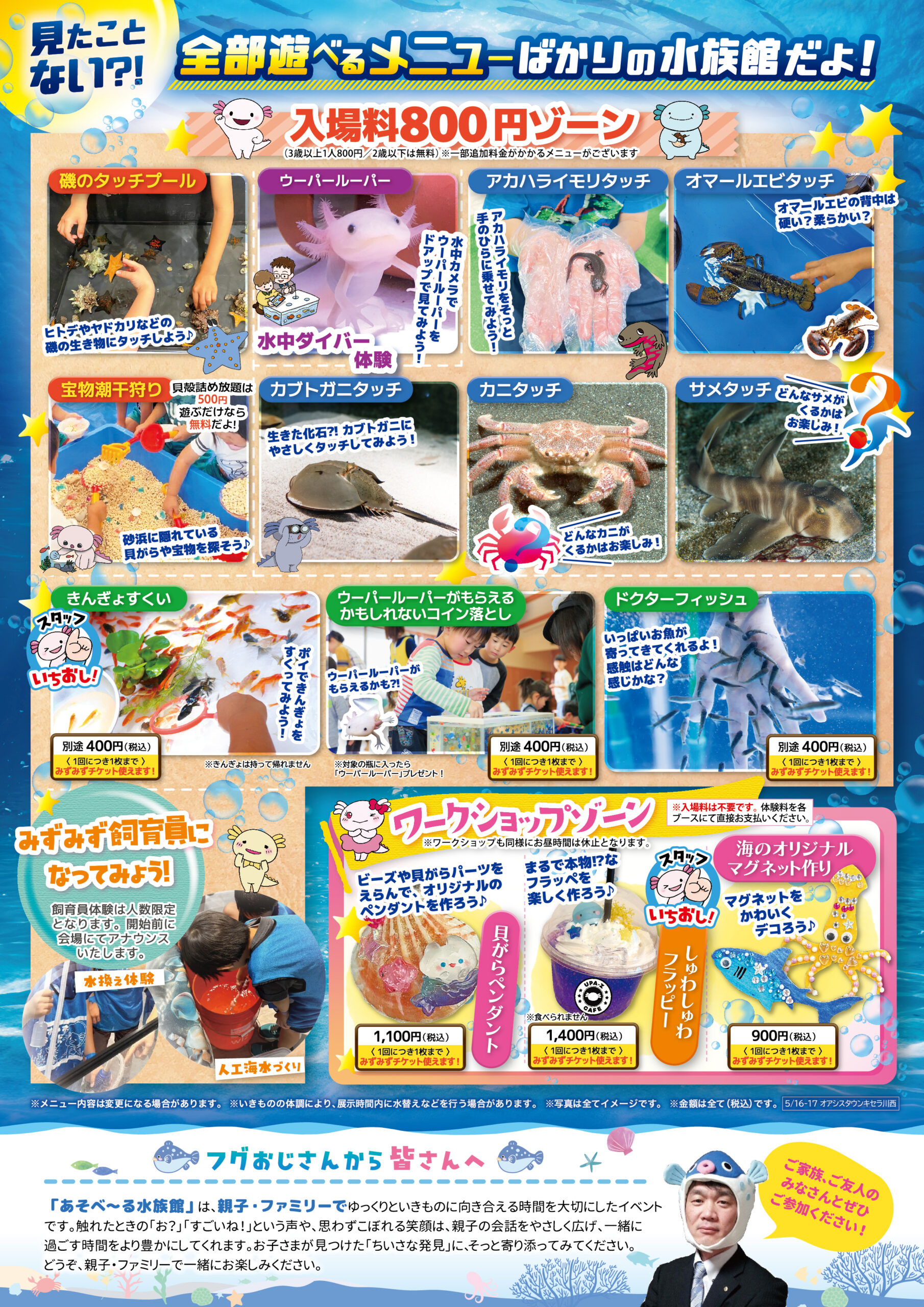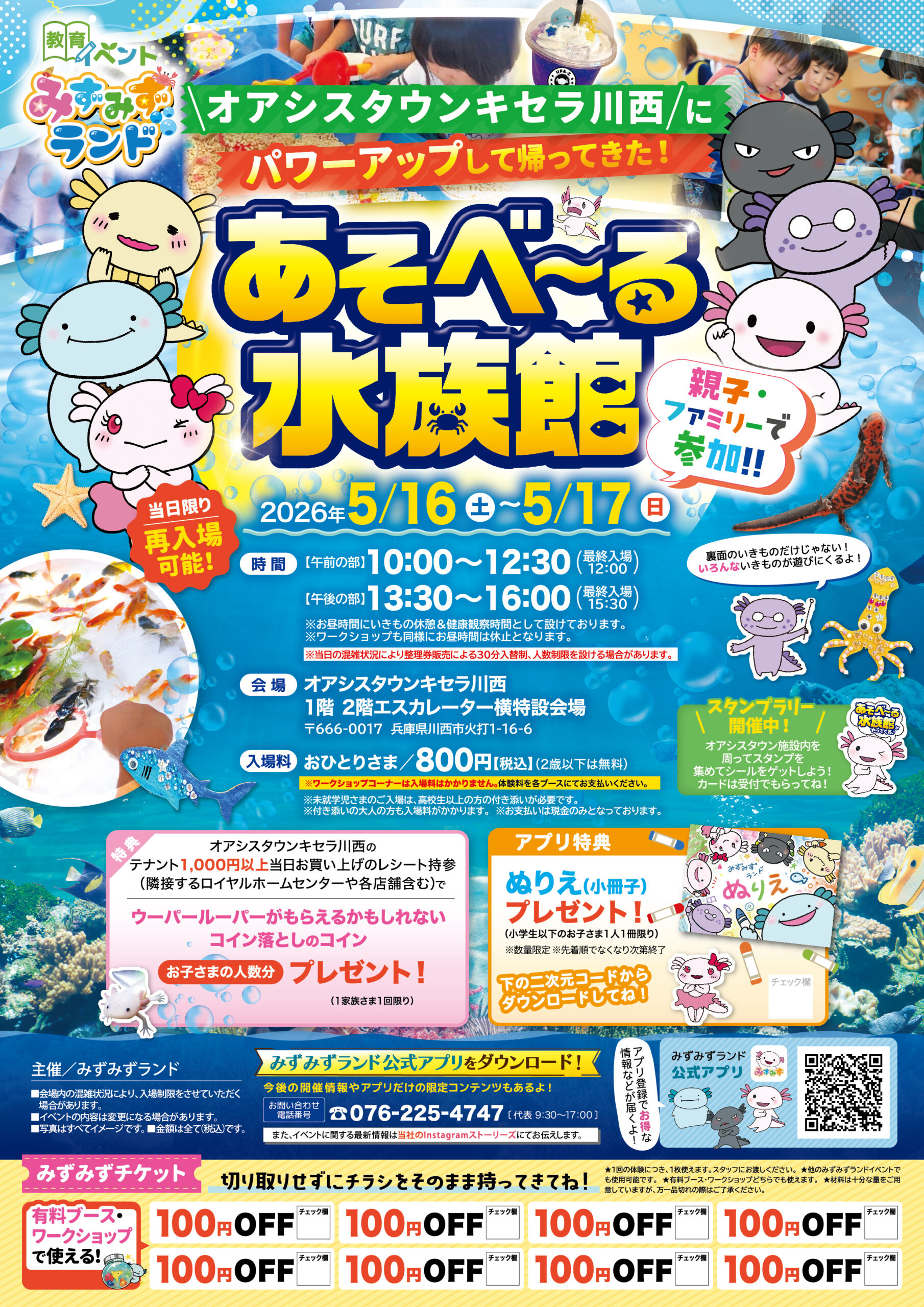 オアシスタウンキセラ川西 兵庫県 2026.04.25 日時2026年5月16日〜17日 〈午前の部〉10:00~12:30(最終入場12:00) 〈午後の部〉13:30~16:00(最終入場15:30) ※お昼時間にいきもの休憩&健康観察時間として設けております。 ※ワークショップも同様にお昼時間は休止となります。 定員予約不要 入場料:お一人様800円(2歳以下は無料) ※お支払いは現金のみ ※未就学児様のご入場は、高校生以上の付き添いが必要です ※付き添いの大人の方も入場料がかかります ※ワークショップコーナーは入場料不要 イベント種別大あそべ~る水族館 メニュー お問い合わせはこちら