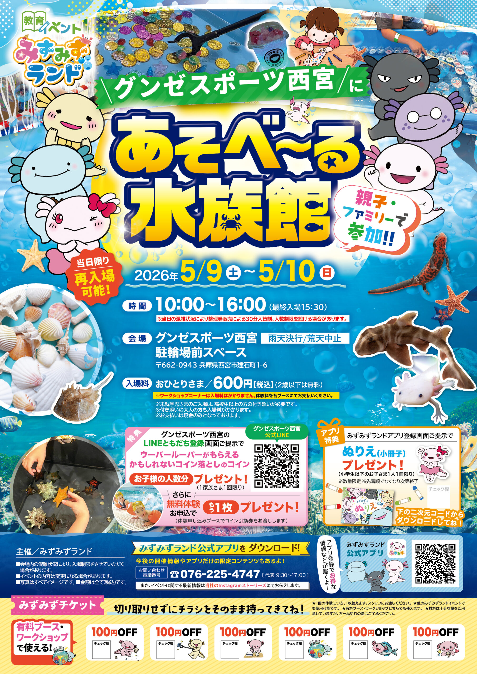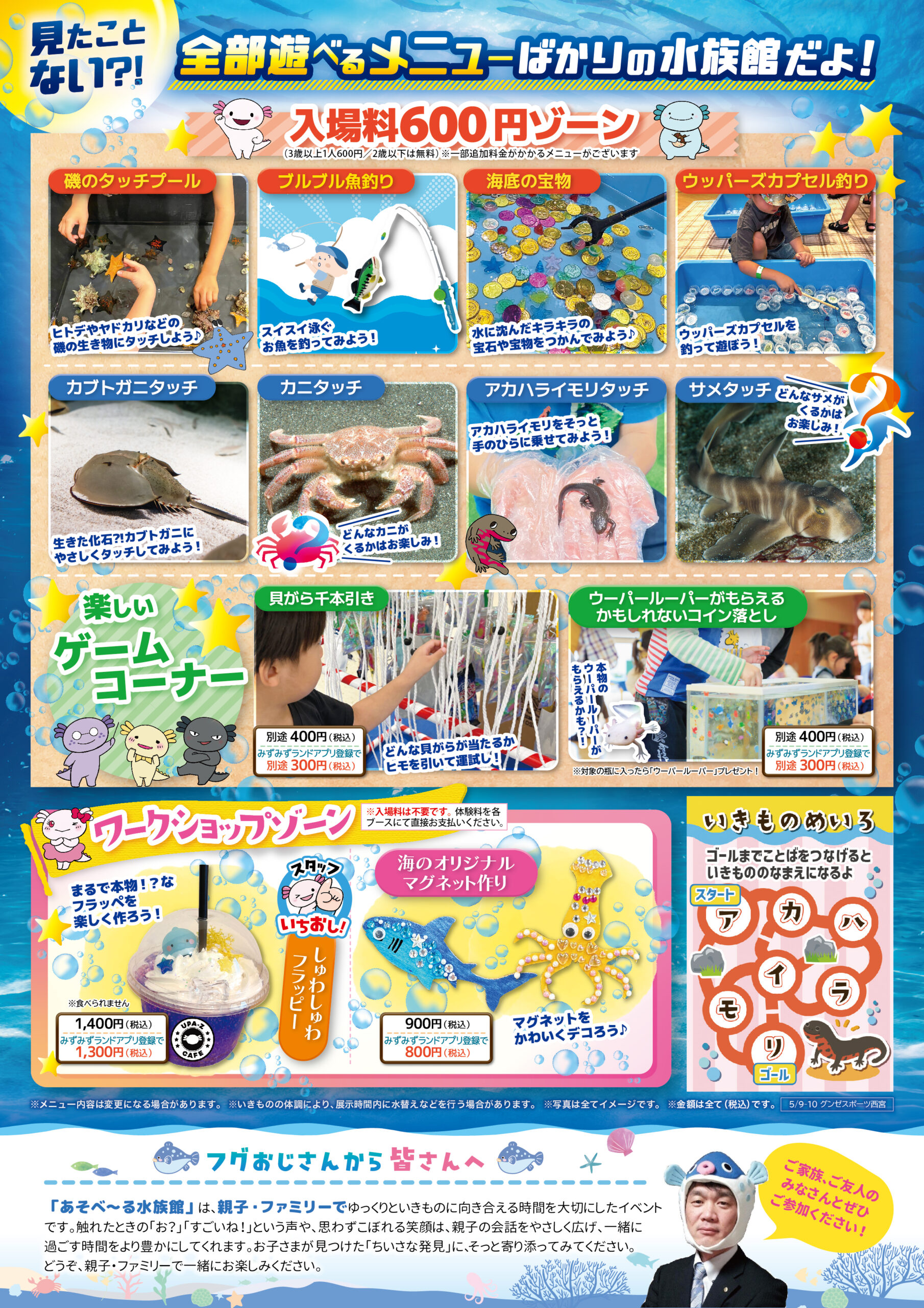 グンゼスポーツ西宮 兵庫県 2026.04.25 日時2026年5月9日〜10日 10:00~16:00(最終入場15:30) 【雨天決行/荒天中止】 定員予約不要 入場料:お一人様600円(2歳以下は無料) ※お支払いは現金のみ ※未就学児様のご入場は、高校生以上の付き添いが必要です ※付き添いの大人の方も入場料がかかります ※ワークショップコーナーは入場料不要 イベント種別大あそべ~る水族館 メニュー お問い合わせはこちら