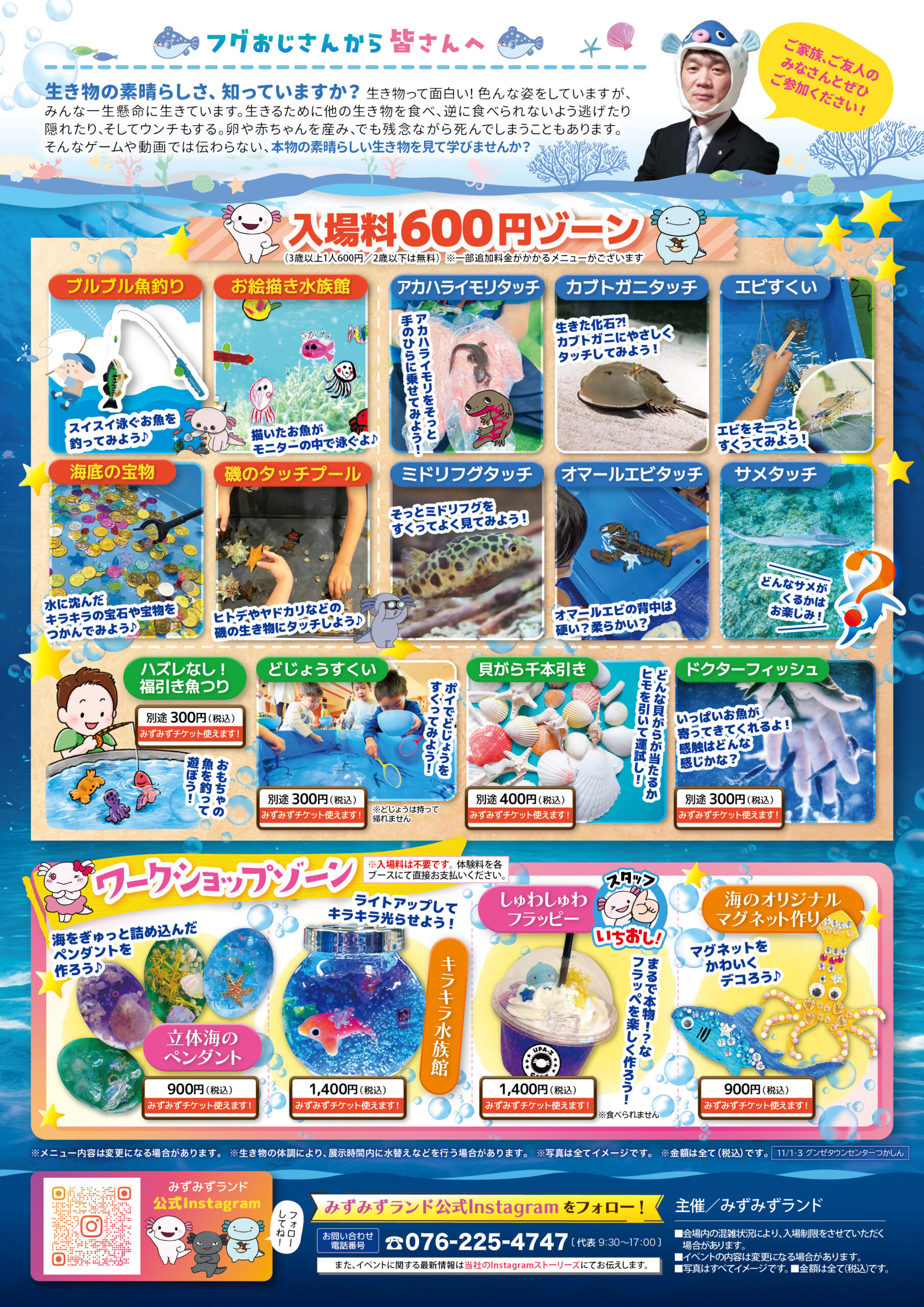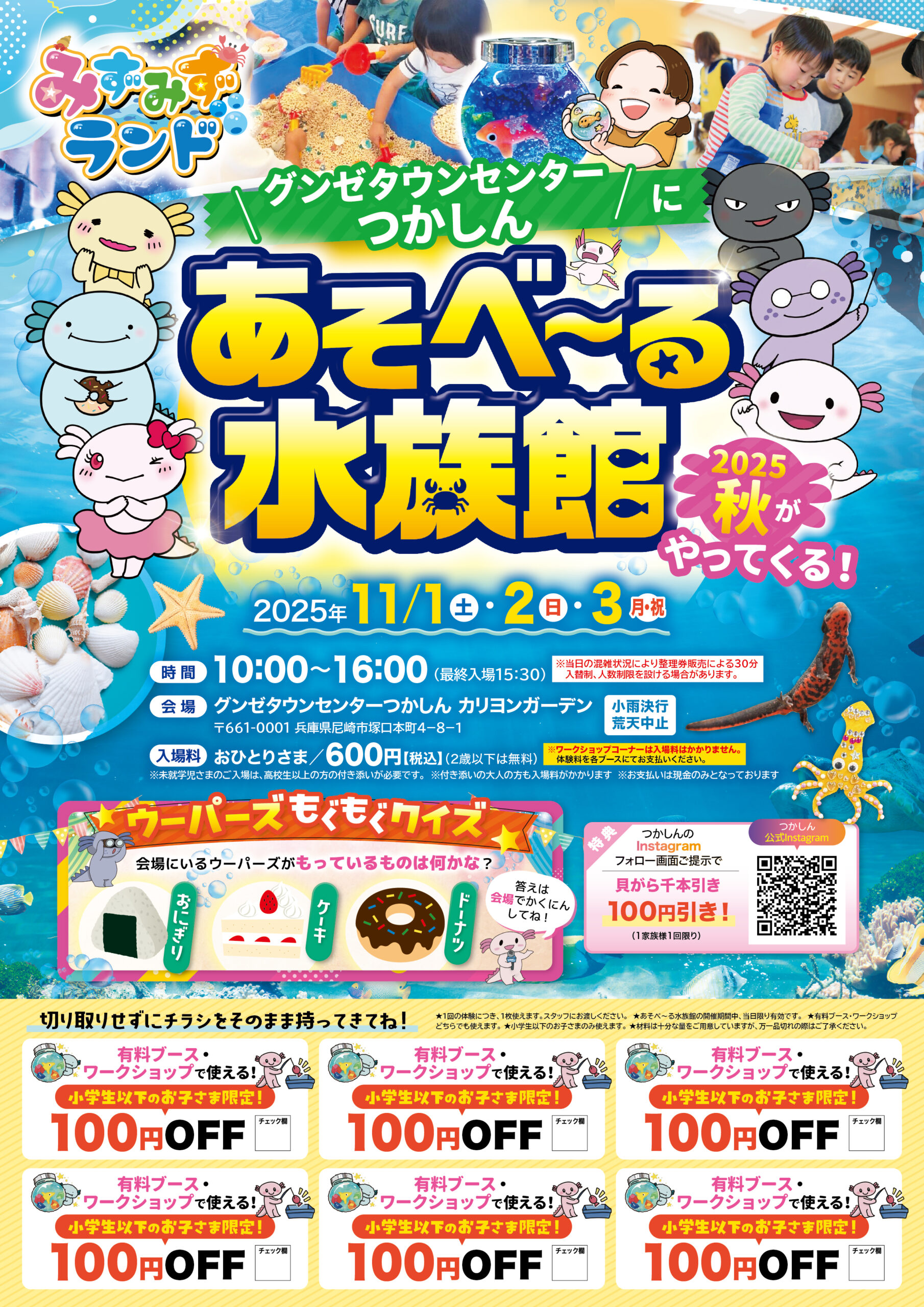 グンゼタウンセンターつかしん 兵庫県 2025.07.132025.09.20 日時2025年11月1日〜3日 10:00~16:00(最終入場15:30) 【小雨決行/荒天中止】 定員予約不要 入場料:お一人様600円(2歳以下は無料) ※未就学児様のご入場は、高校生以上の付き添いが必要です ※付き添いの大人の方も入場料がかかります ※ワークショップコーナーは入場料不要 イベント種別大あそべ~る水族館 メニュー お問い合わせはこちら