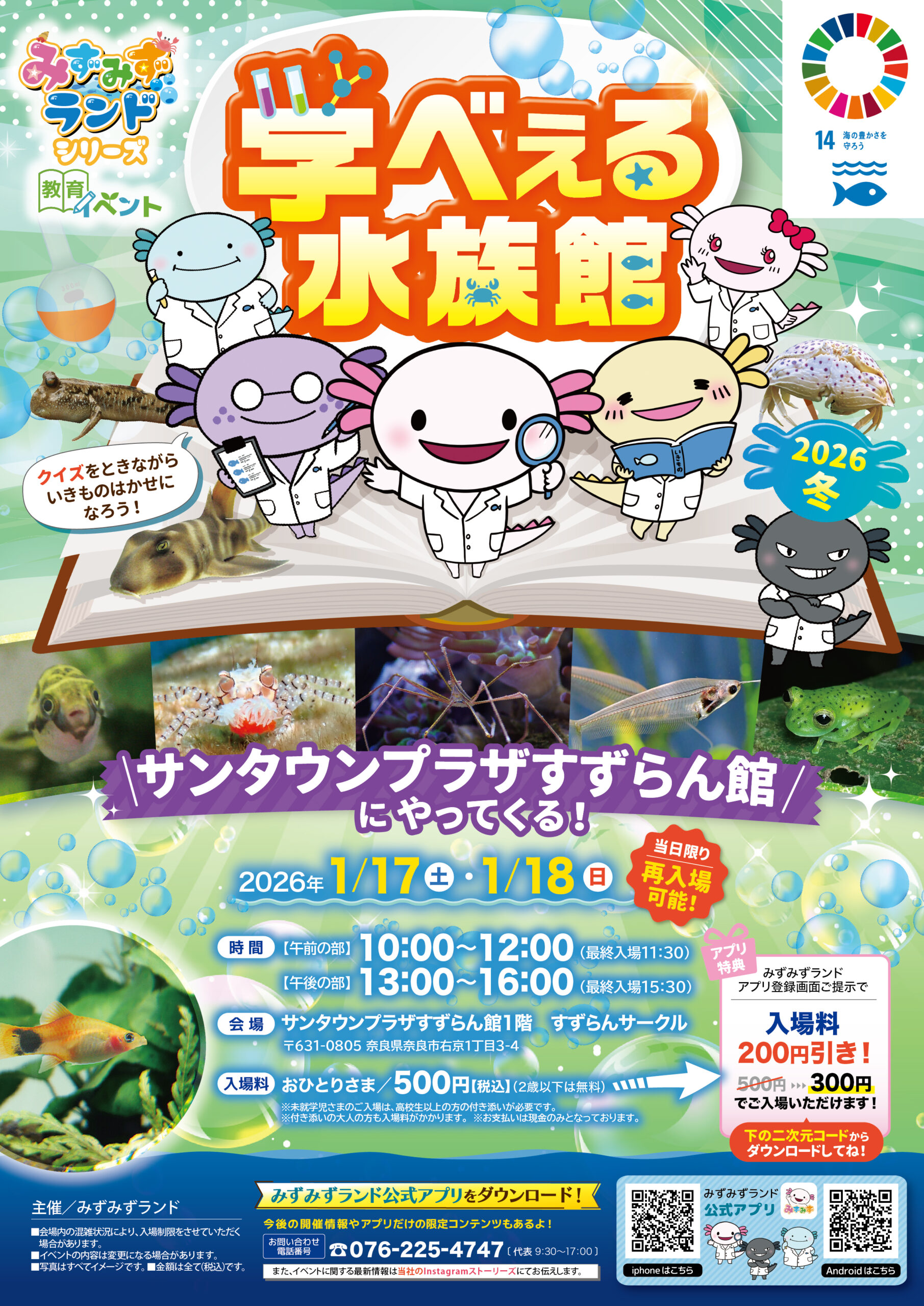 サンタウンプラザすずらん館 奈良県 2026.01.06 日時2026年1月17日〜18日 〈午前の部〉10:00~12:00(最終入場11:30) 〈午後の部〉13:00~16:00(最終入場15:30) 定員予約不要 入場料:お一人様500円(2歳以下は無料) ※お支払いは現金のみ ※未就学児様のご入場は、高校生以上の付き添いが必要です ※付き添いの大人の方も入場料がかかります ※ワークショップコーナーは入場料不要 イベント種別学べぇる水族館 メニュー お問い合わせはこちら