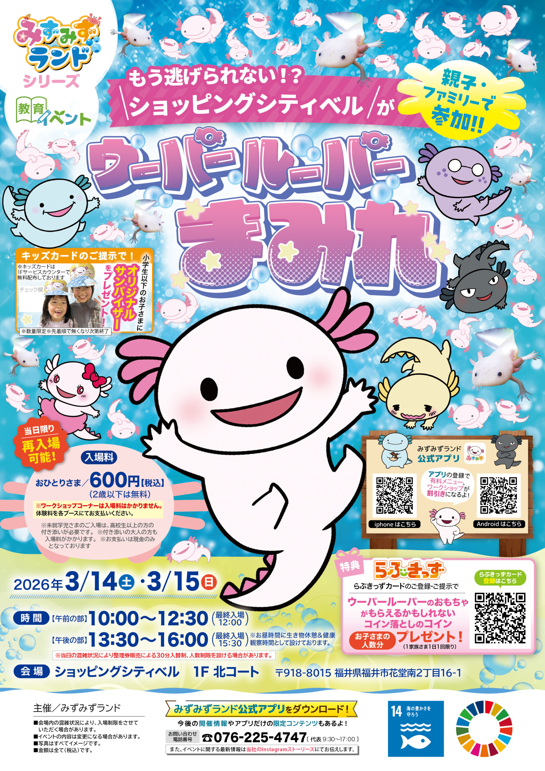 ショッピングシティベル 福井県 2026.02.27 日時2026年3月14日〜15日 〈午前の部〉10:00~12:30(最終入場12:00) 〈午後の部〉13:30~16:00(最終入場15:30) ※お昼時間に生き物休憩&健康観察時間として設けております。 定員予約不要 入場料:お一人様600円(2歳以下は無料) ※お支払いは現金のみ ※未就学児様のご入場は、高校生以上の付き添いが必要です ※付き添いの大人の方も入場料がかかります ※ワークショップコーナーは入場料不要 イベント種別ウーパールーパーまみれ メニュー お問い合わせはこちら