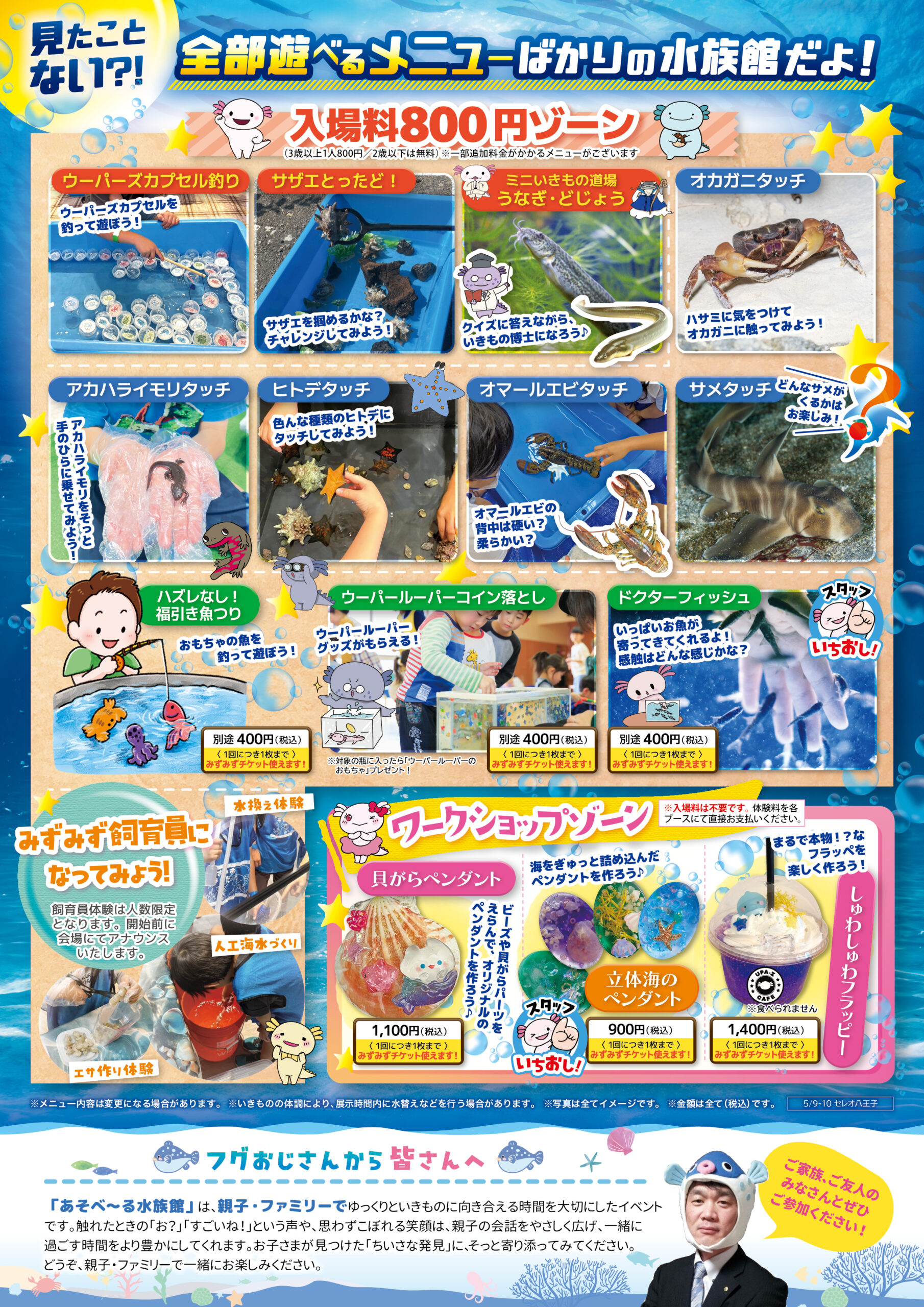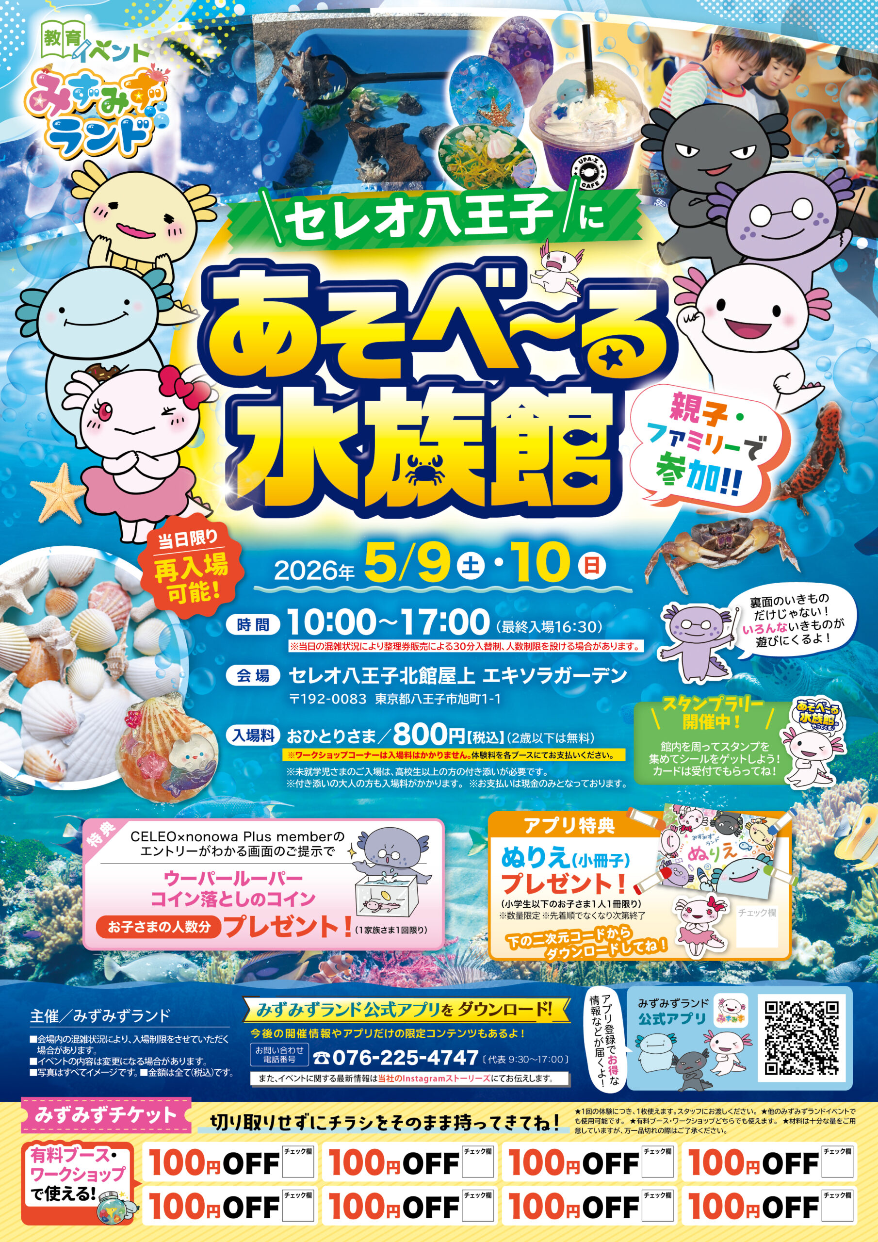 セレオ八王子 東京都 2026.04.25 日時2026年5月9日〜10日 10:00~17:00(最終入場16:30) 定員予約不要 入場料:お一人様800円(2歳以下は無料) ※お支払いは現金のみ ※未就学児様のご入場は、高校生以上の付き添いが必要です ※付き添いの大人の方も入場料がかかります ※ワークショップコーナーは入場料不要 イベント種別大あそべ~る水族館 メニュー お問い合わせはこちら