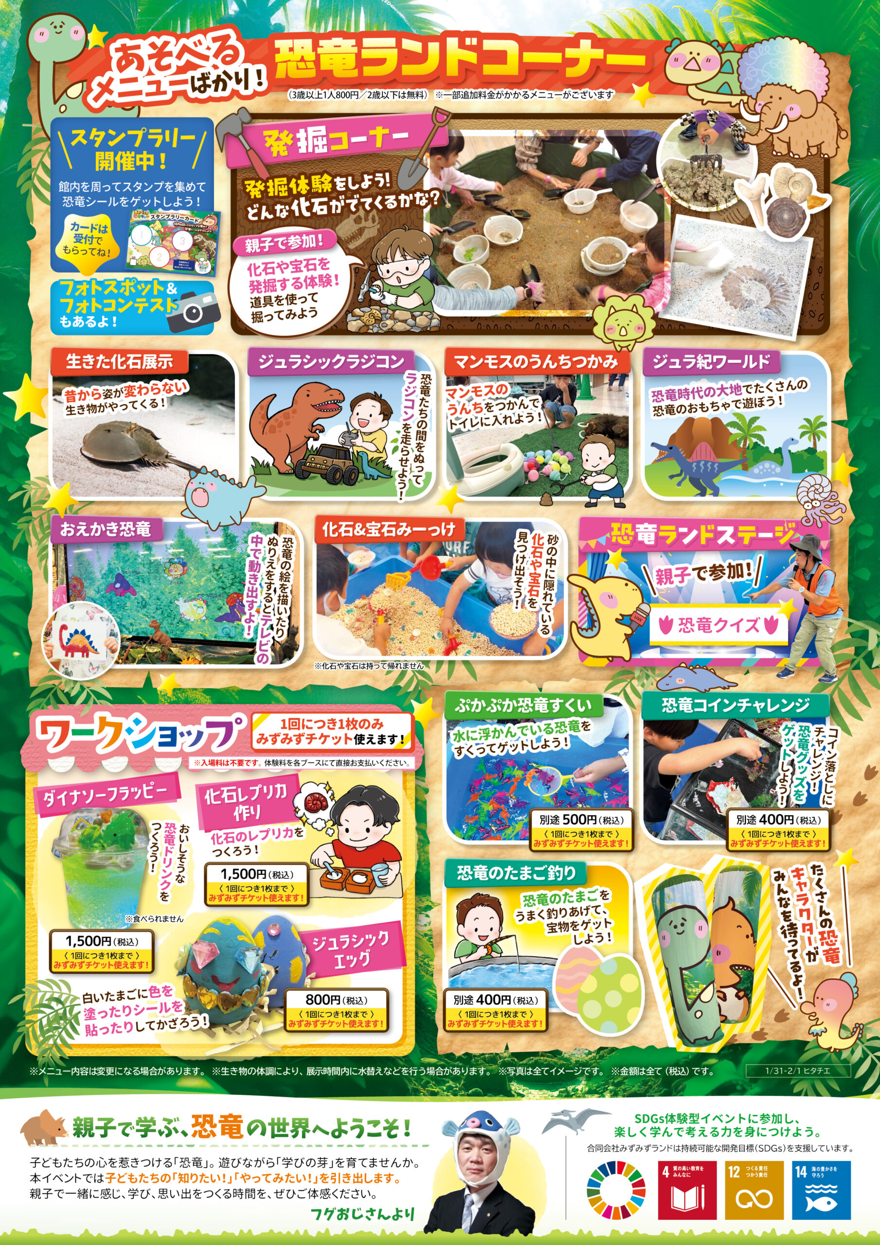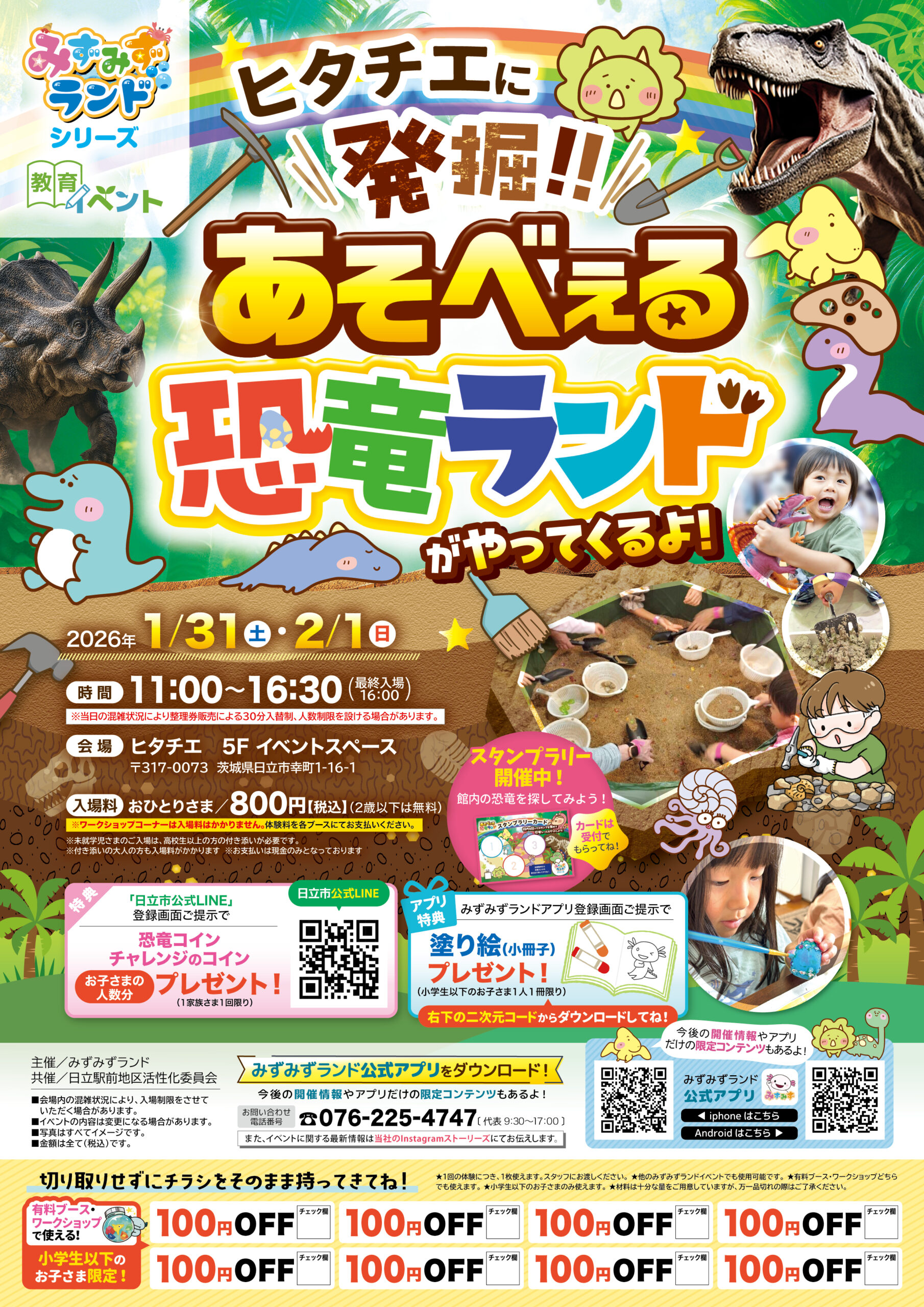 ヒタチエ 茨城県 2026.01.27 日時2026年1月31日〜2月1日 11:00~16:30(最終入場16:00) 定員予約不要 入場料:お一人様800円(2歳以下は無料) ※お支払いは現金のみ ※未就学児様のご入場は、高校生以上の付き添いが必要です ※付き添いの大人の方も入場料がかかります ※ワークショップコーナーは入場料不要 イベント種別あそべぇる恐竜ランド メニュー お問い合わせはこちら