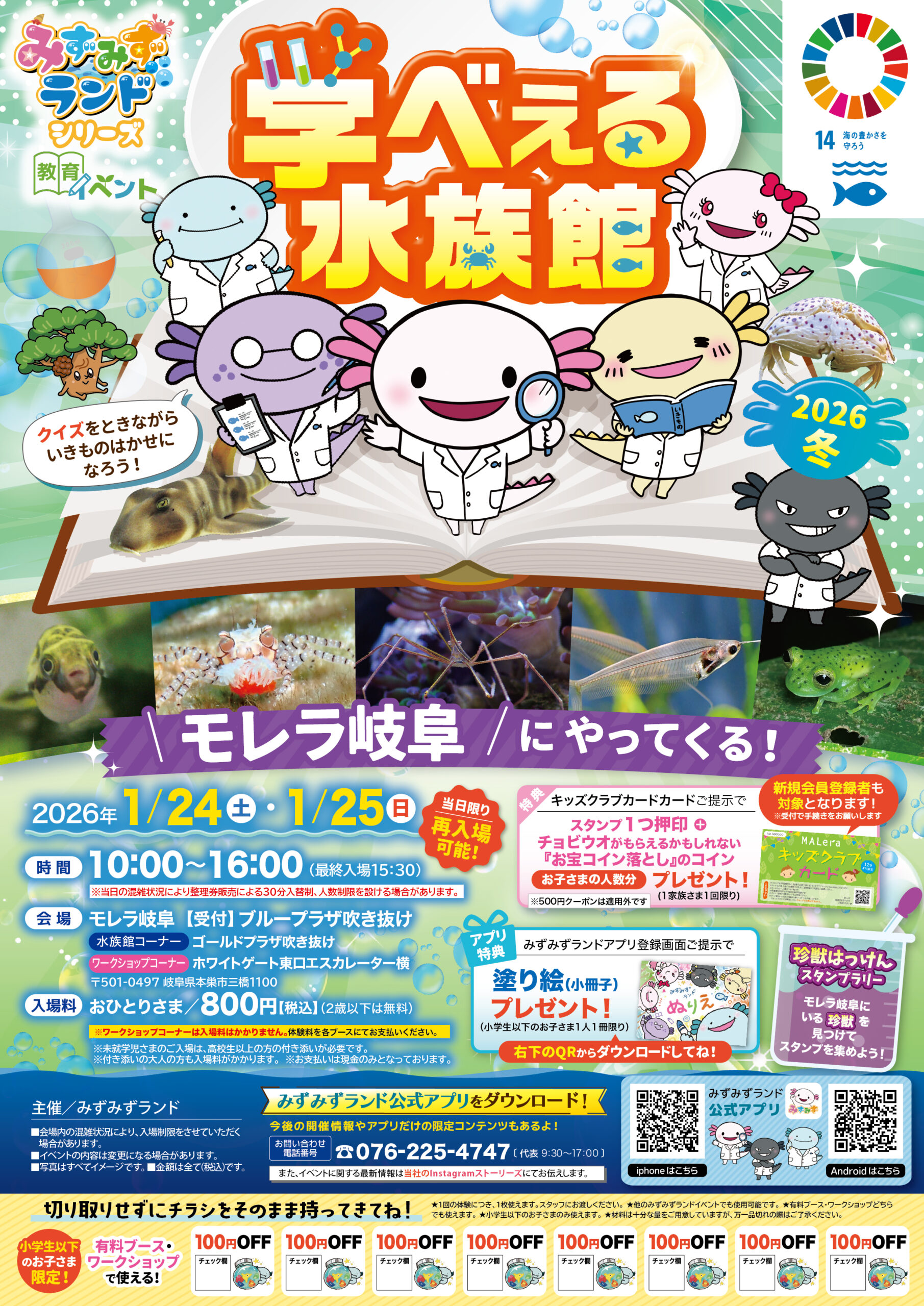 モレラ岐阜 岐阜県 2026.01.06 日時2026年1月24日〜25日 10:00~16:00(最終入場15:30) 定員予約不要 入場料:お一人様800円(2歳以下は無料) ※お支払いは現金のみ ※未就学児様のご入場は、高校生以上の付き添いが必要です ※付き添いの大人の方も入場料がかかります ※ワークショップコーナーは入場料不要 イベント種別学べぇる水族館 メニュー お問い合わせはこちら