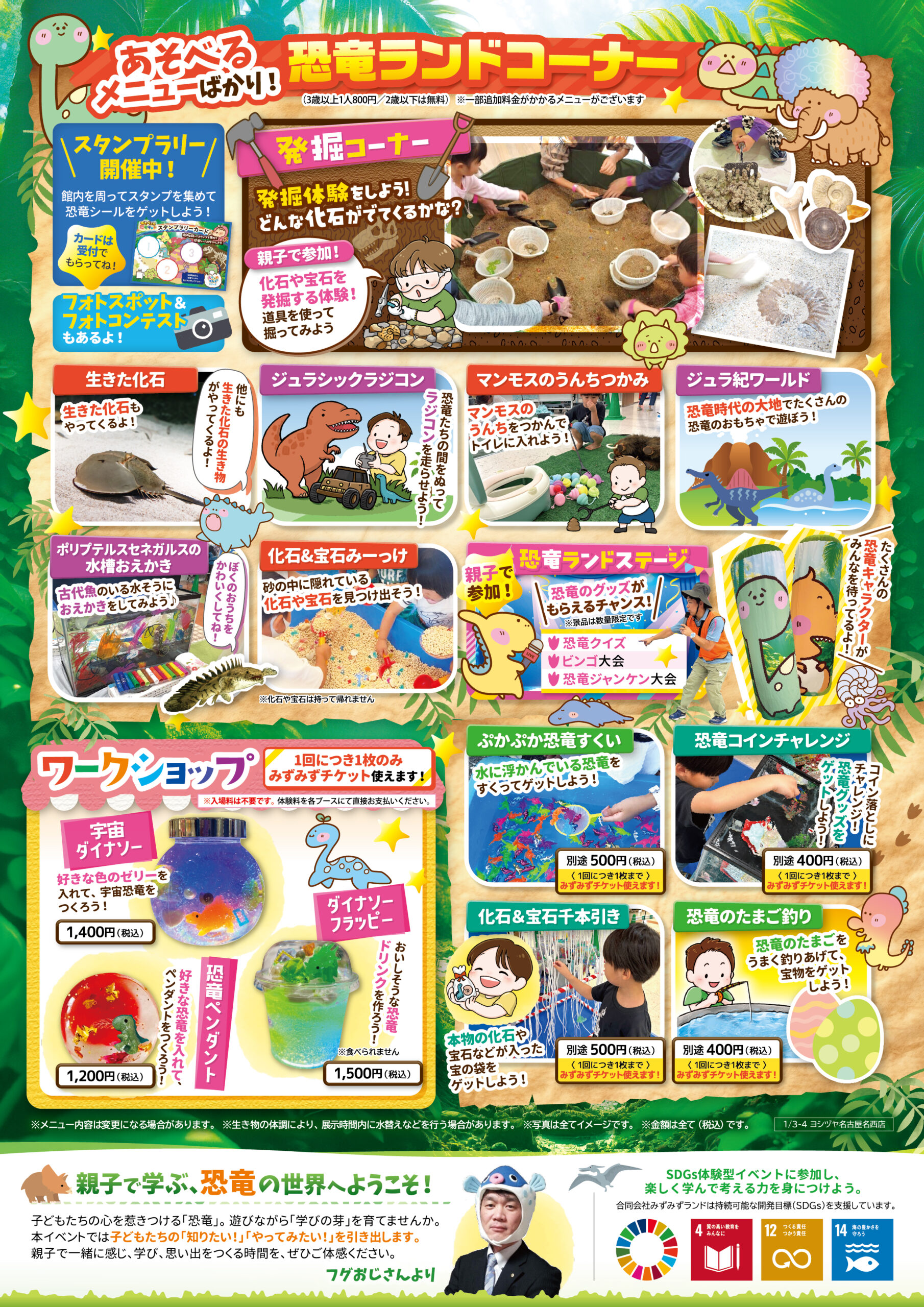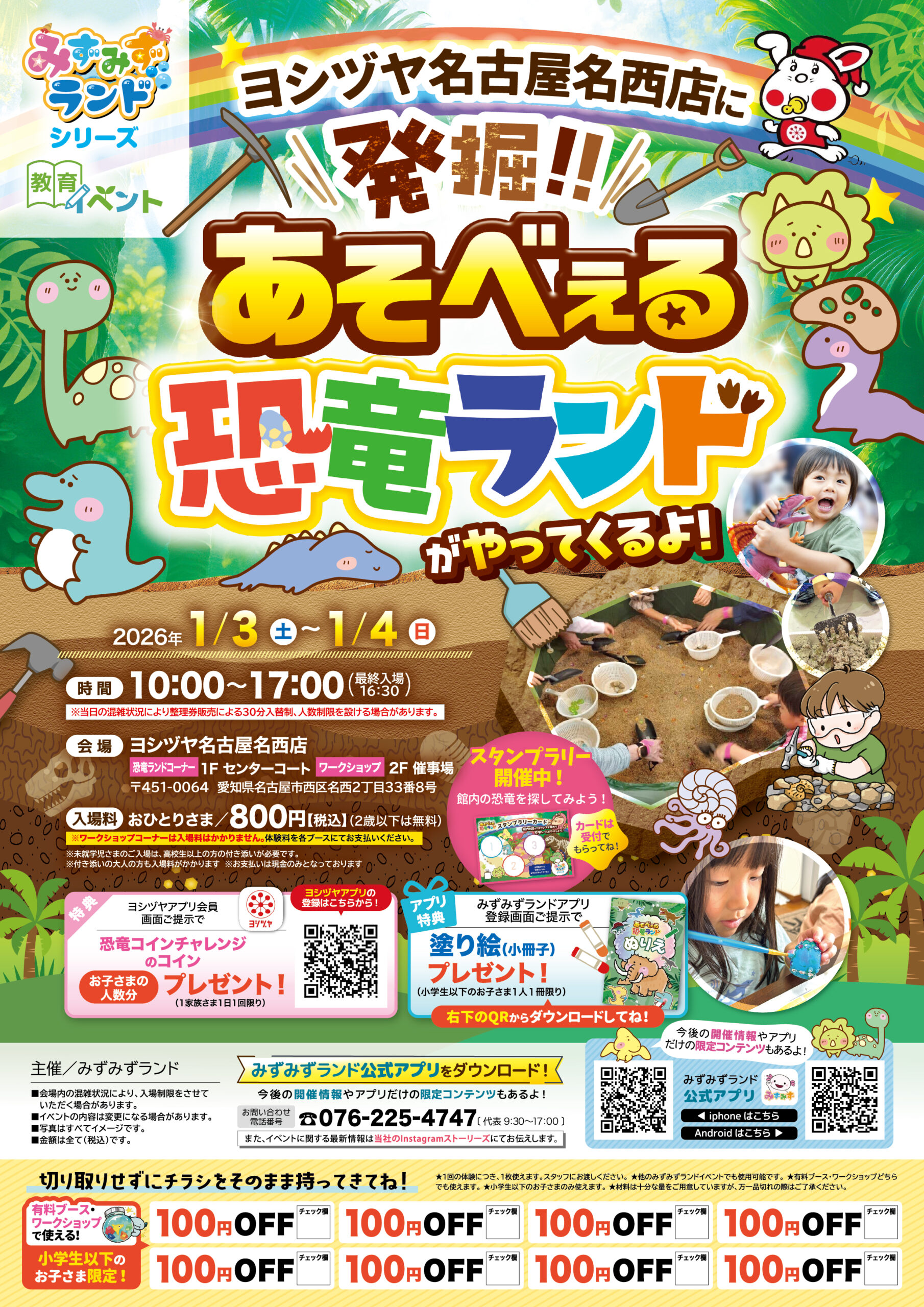 ヨシヅヤ名古屋名西店 愛知県 2025.12.09 日時2026年1月3日〜4日 10:00~17:00(最終入場16:30) 定員予約不要 入場料:お一人様800円(2歳以下は無料) ※未就学児様のご入場は、高校生以上の付き添いが必要です ※付き添いの大人の方も入場料がかかります ※ワークショップコーナーは入場料不要 イベント種別あそべぇる恐竜ランド メニュー お問い合わせはこちら