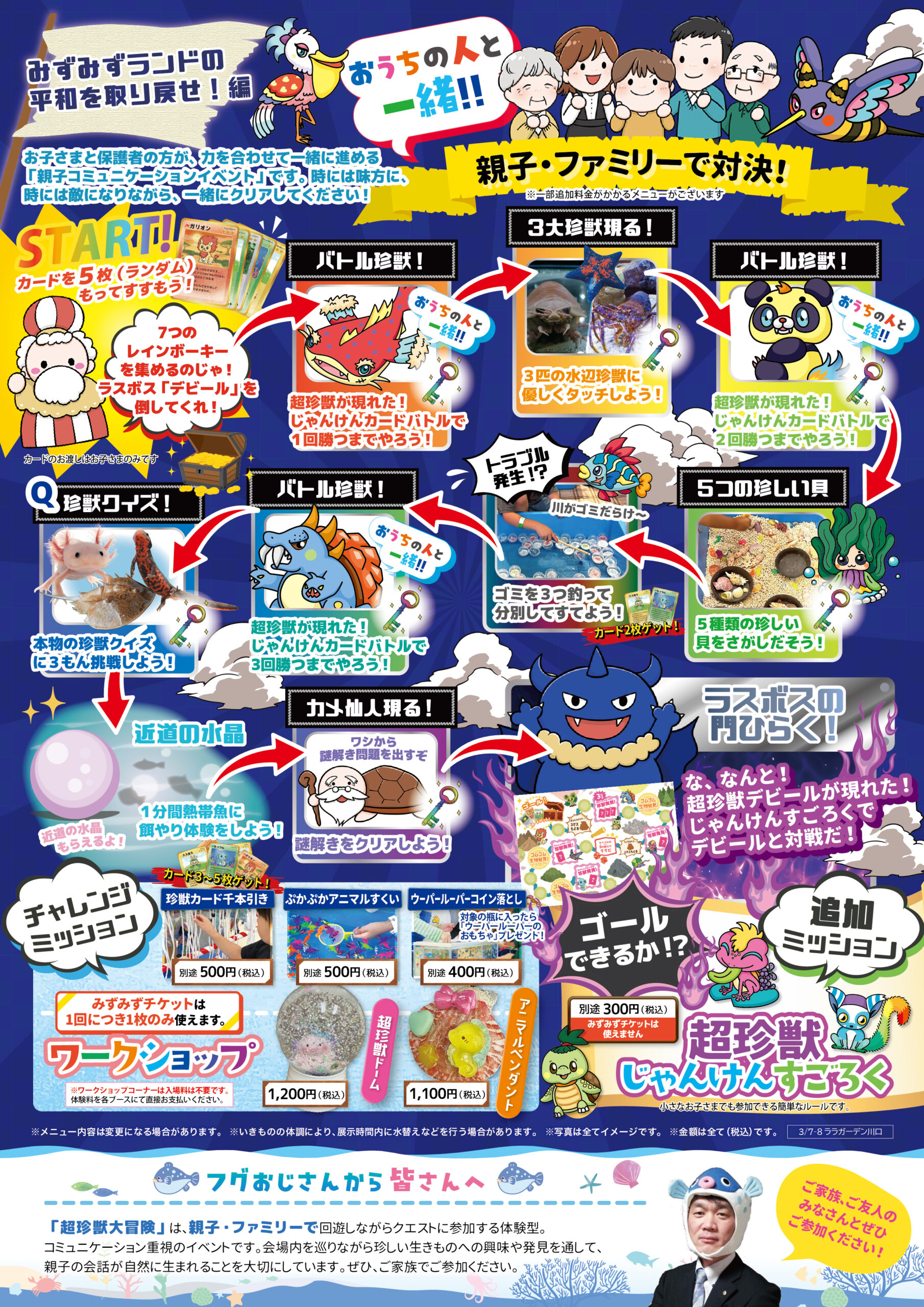 ララガーデン川口 埼玉県 2026.02.15 日時2026年3月7日〜8日 10:00~17:00(最終入場16:30) 定員予約不要 入場料:お一人様800円(2歳以下は無料) ※お支払いは現金のみ ※未就学児様のご入場は、高校生以上の付き添いが必要です ※付き添いの大人の方も入場料がかかります ※ワークショップコーナーは入場料不要 イベント種別超珍獣大冒険 メニュー お問い合わせはこちら