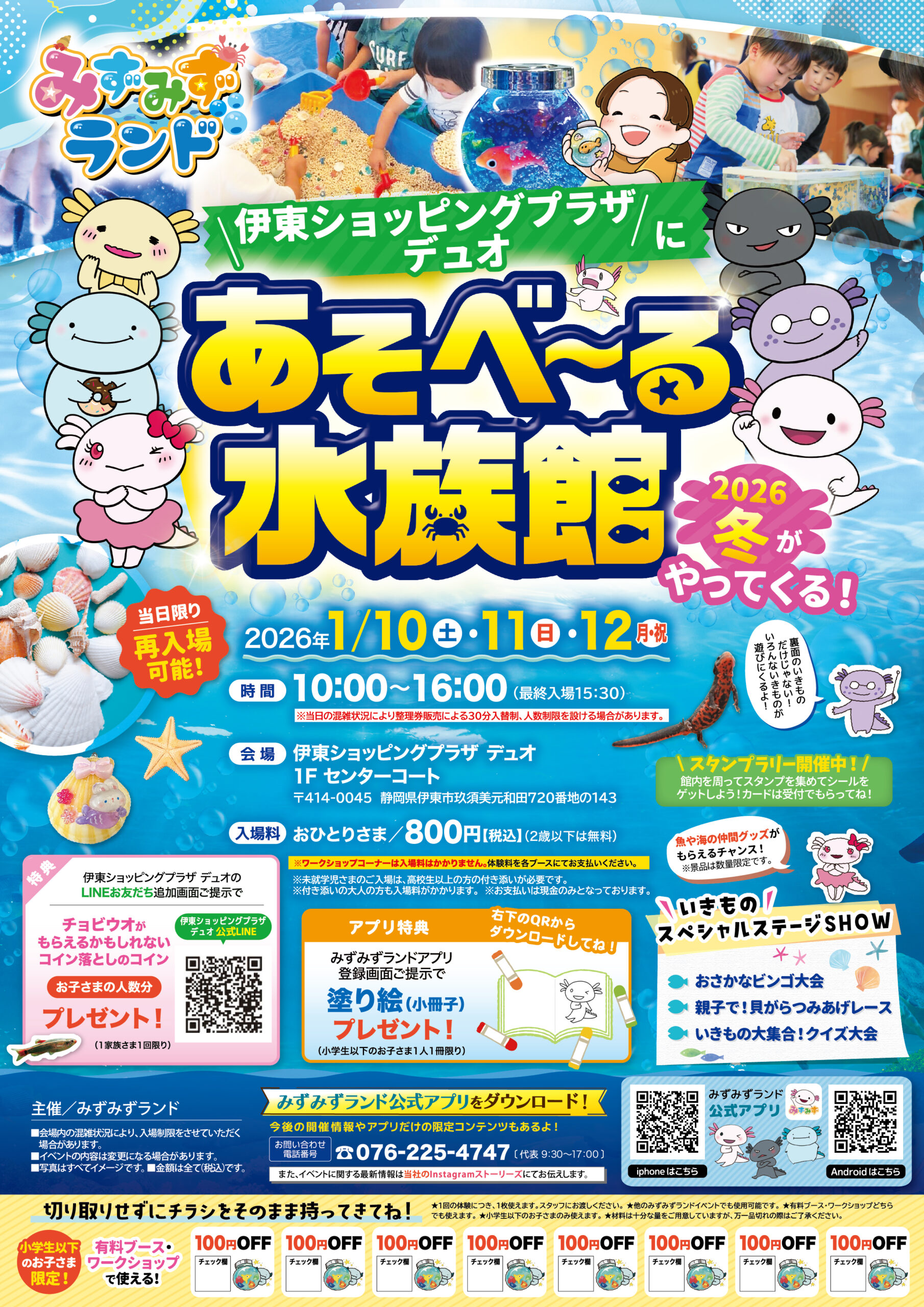 伊東ショッピングプラザ デュオ 静岡県 2025.12.09 日時2026年1月10日〜12日 10:00~16:00(最終入場15:30) 定員予約不要 入場料:お一人様800円(2歳以下は無料) ※未就学児様のご入場は、高校生以上の付き添いが必要です ※付き添いの大人の方も入場料がかかります ※ワークショップコーナーは入場料不要 イベント種別大あそべ~る水族館 メニュー お問い合わせはこちら