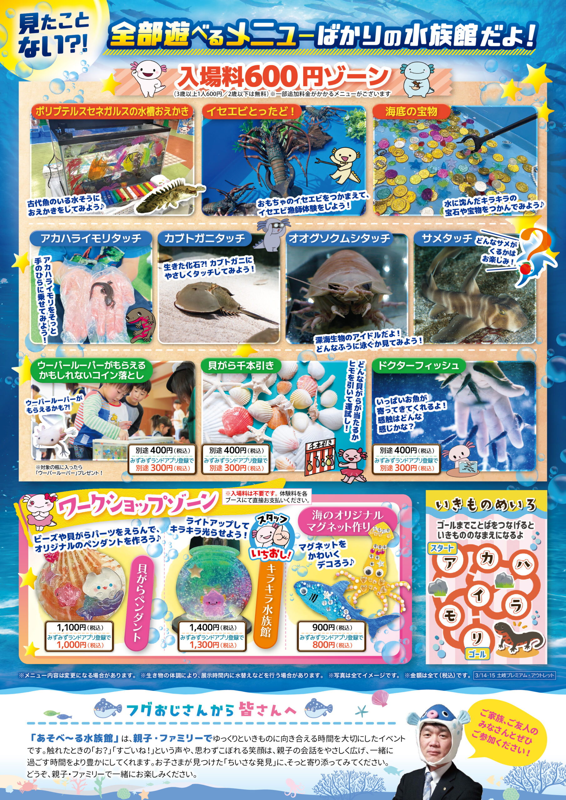 土岐プレミアム・アウトレット 岐阜県 2026.02.27 日時2026年3月14日〜15日 10:00~16:00(最終入場15:30) 【雨天決行/荒天中止】 定員予約不要 入場料:お一人様600円(2歳以下は無料) ※お支払いは現金のみ ※未就学児様のご入場は、高校生以上の付き添いが必要です ※付き添いの大人の方も入場料がかかります ※ワークショップコーナーは入場料不要 イベント種別大あそべ~る水族館 メニュー お問い合わせはこちら