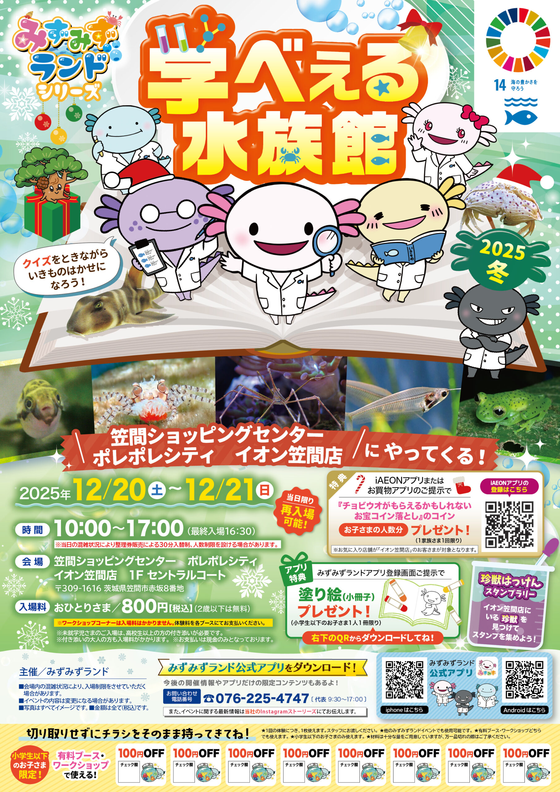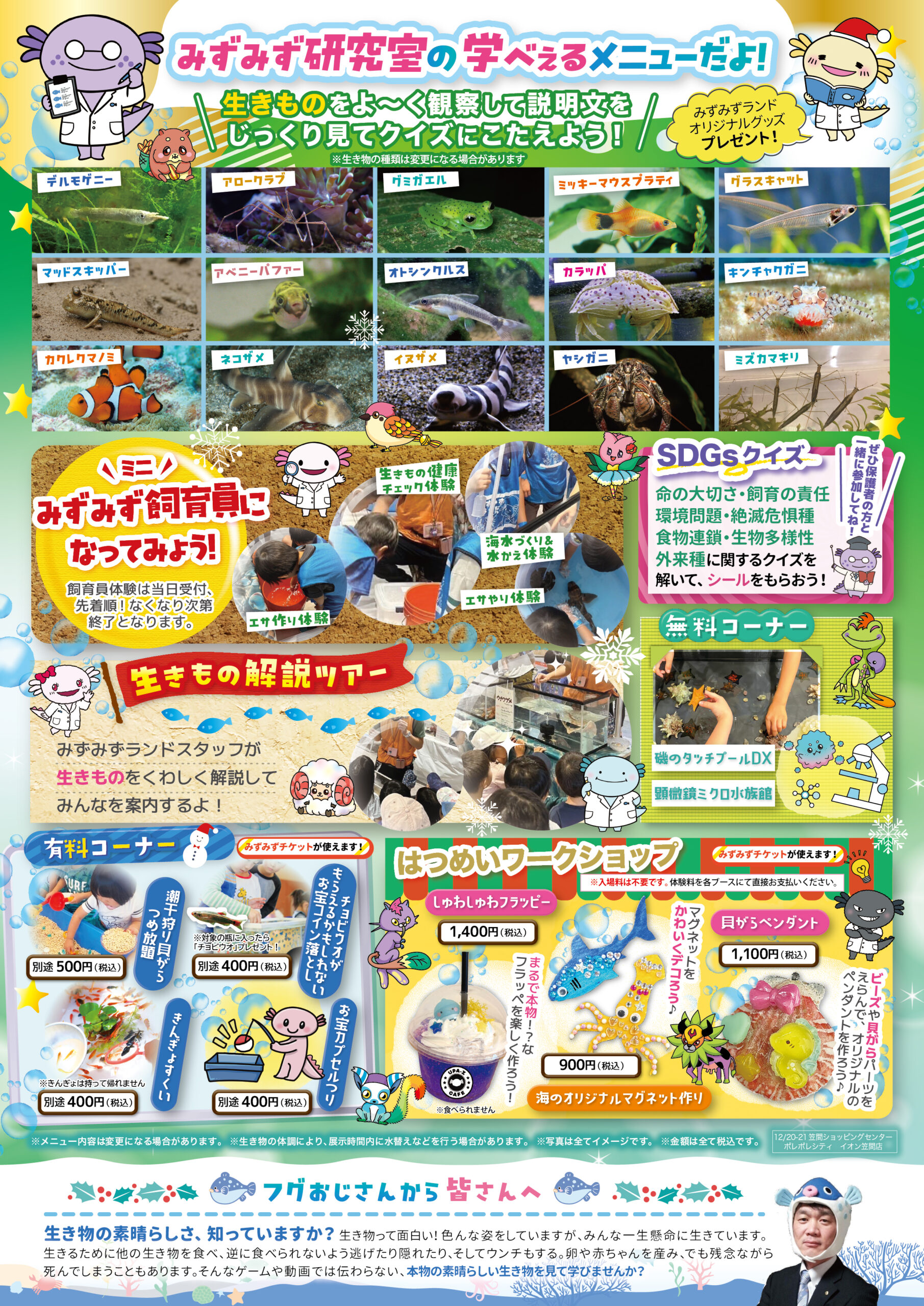 笠間ショッピングセンター ポレポレシティ イオン笠間店 茨城県 2025.11.19 日時2025年12月20日〜21日 10:00~17:00(最終入場16:30) 定員予約不要 入場料:お一人様800円(2歳以下は無料) ※未就学児様のご入場は、高校生以上の付き添いが必要です ※付き添いの大人の方も入場料がかかります ※ワークショップコーナーは入場料不要 イベント種別学べぇる水族館 メニュー お問い合わせはこちら