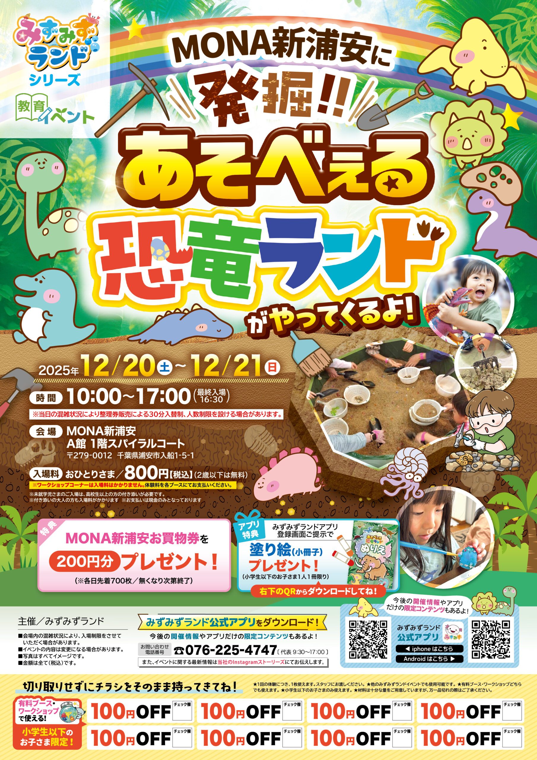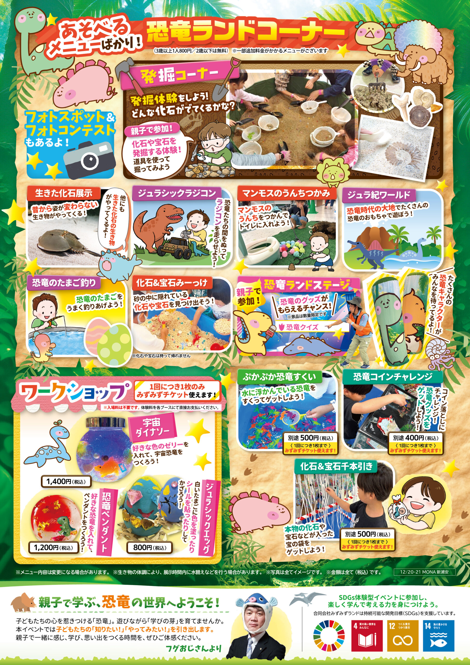 MONA新浦安 千葉県 2025.12.06 日時2025年12月20日〜21日 10:00~17:00(最終入場16:30) 定員予約不要 入場料:お一人様800円(2歳以下は無料) ※未就学児様のご入場は、高校生以上の付き添いが必要です ※付き添いの大人の方も入場料がかかります ※ワークショップコーナーは入場料不要 イベント種別あそべぇる恐竜ランド メニュー お問い合わせはこちら