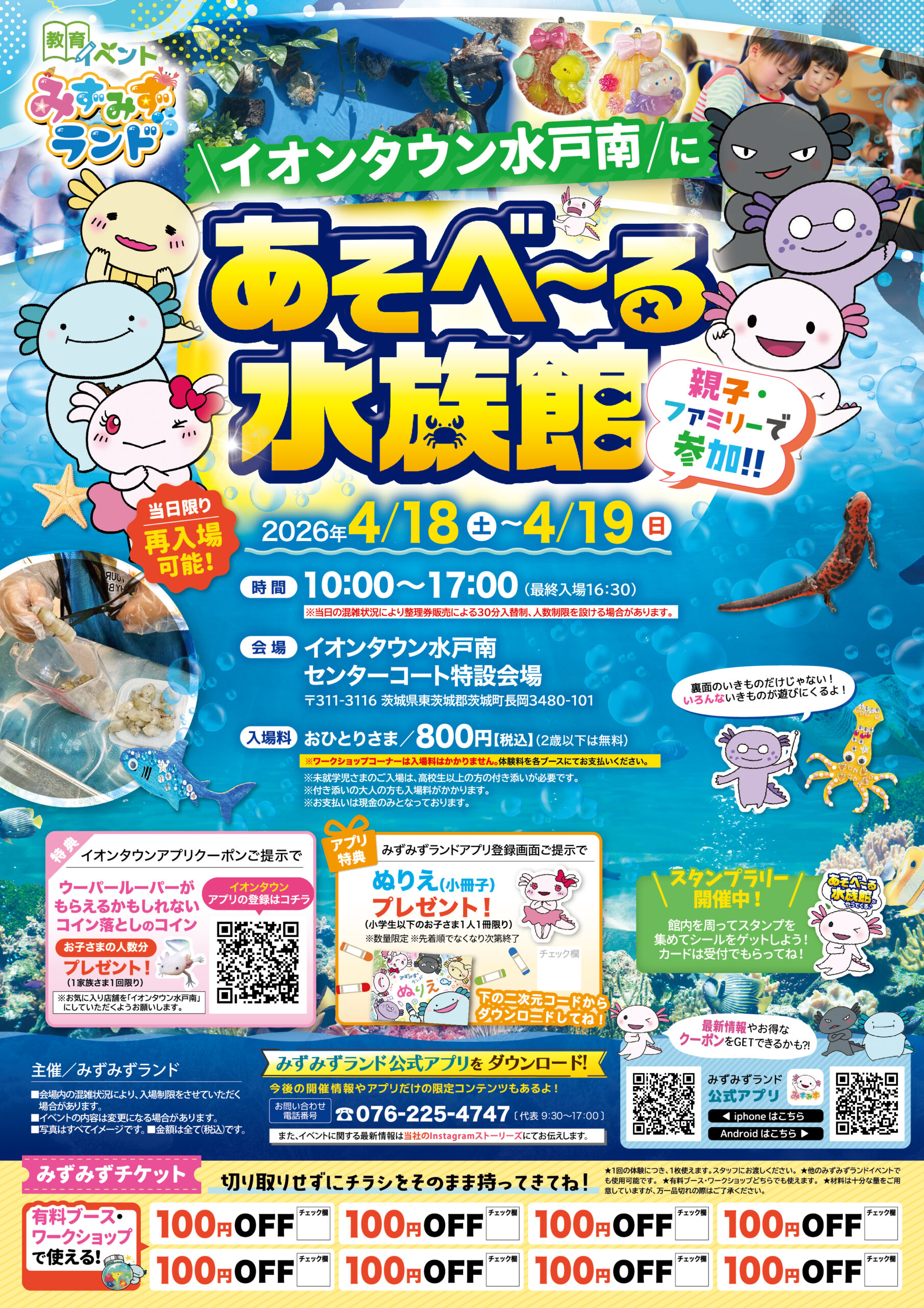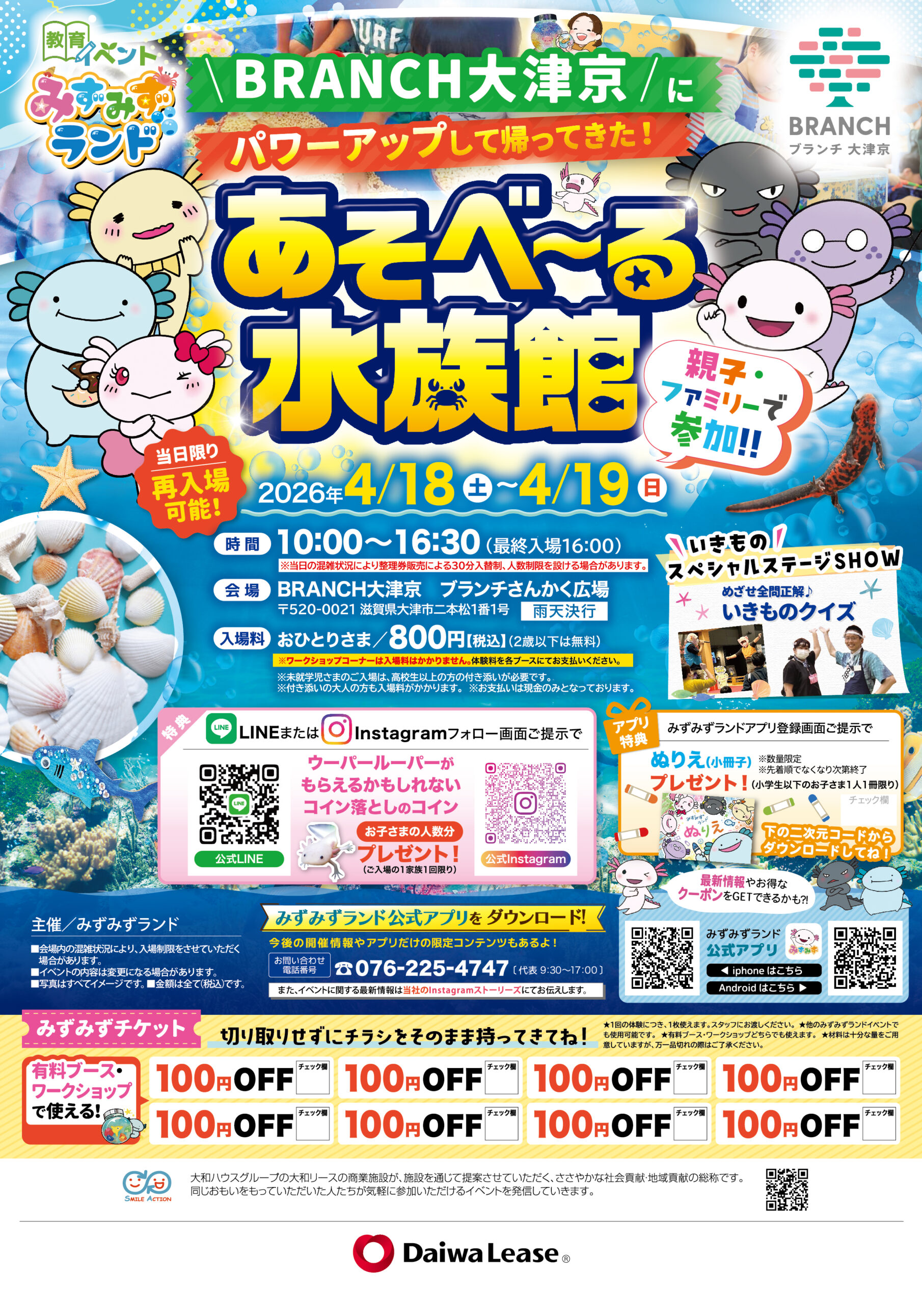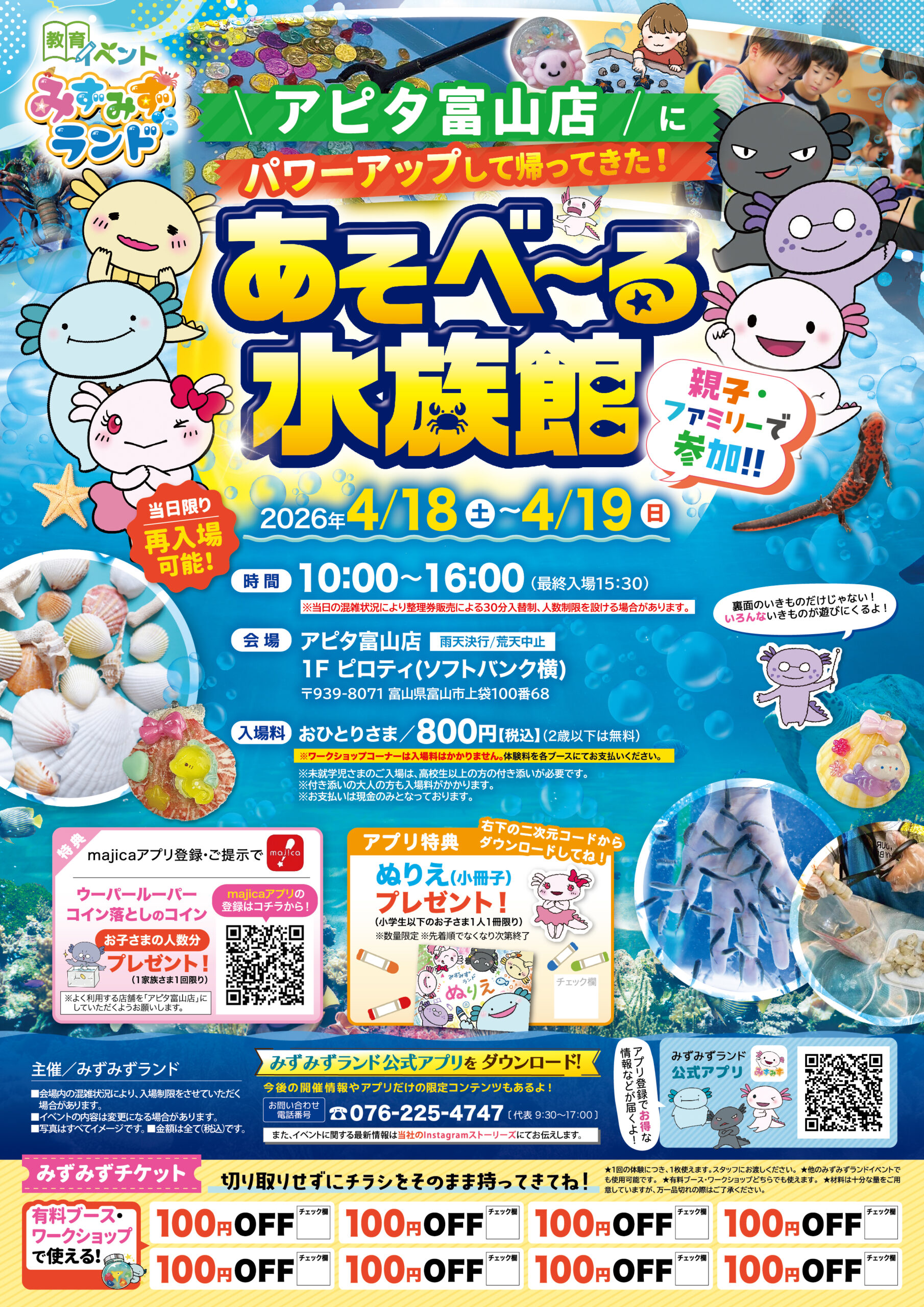 ザリガニをつかんだりドジョウをすくったりドクターフィッシュを体験したり、遊べるメニューばかりの移動水族館です。